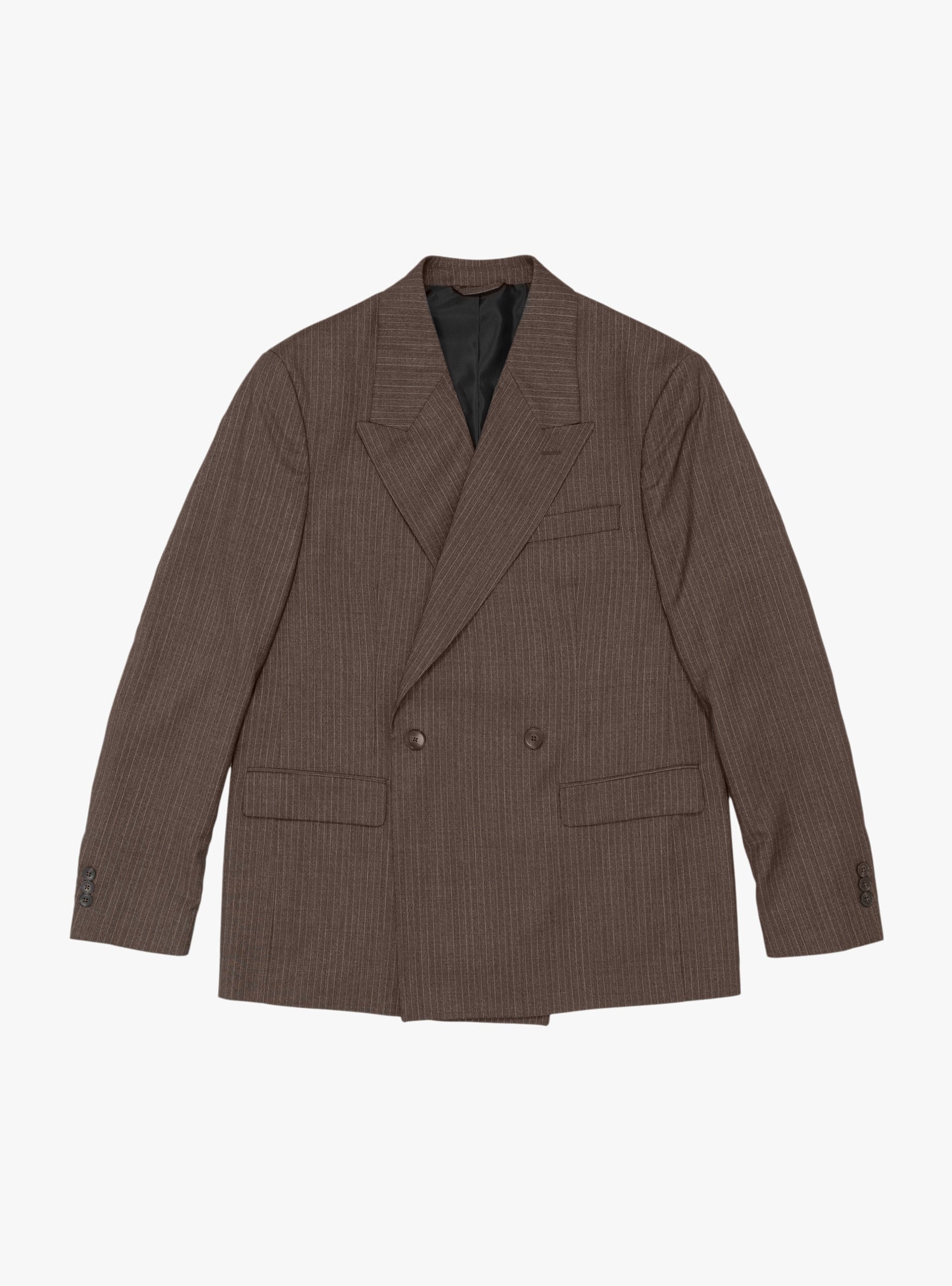 Made in Portugal from Italian deadstock wool, the Double Breasted Blazer in Nutmeg Vintage Stripe from mfpen has a relaxed fit. Featuring a chest welt pocket and flap pockets, it enhances the classic look with peak lapels. The design is finished with a two-resin button closure and full lining.