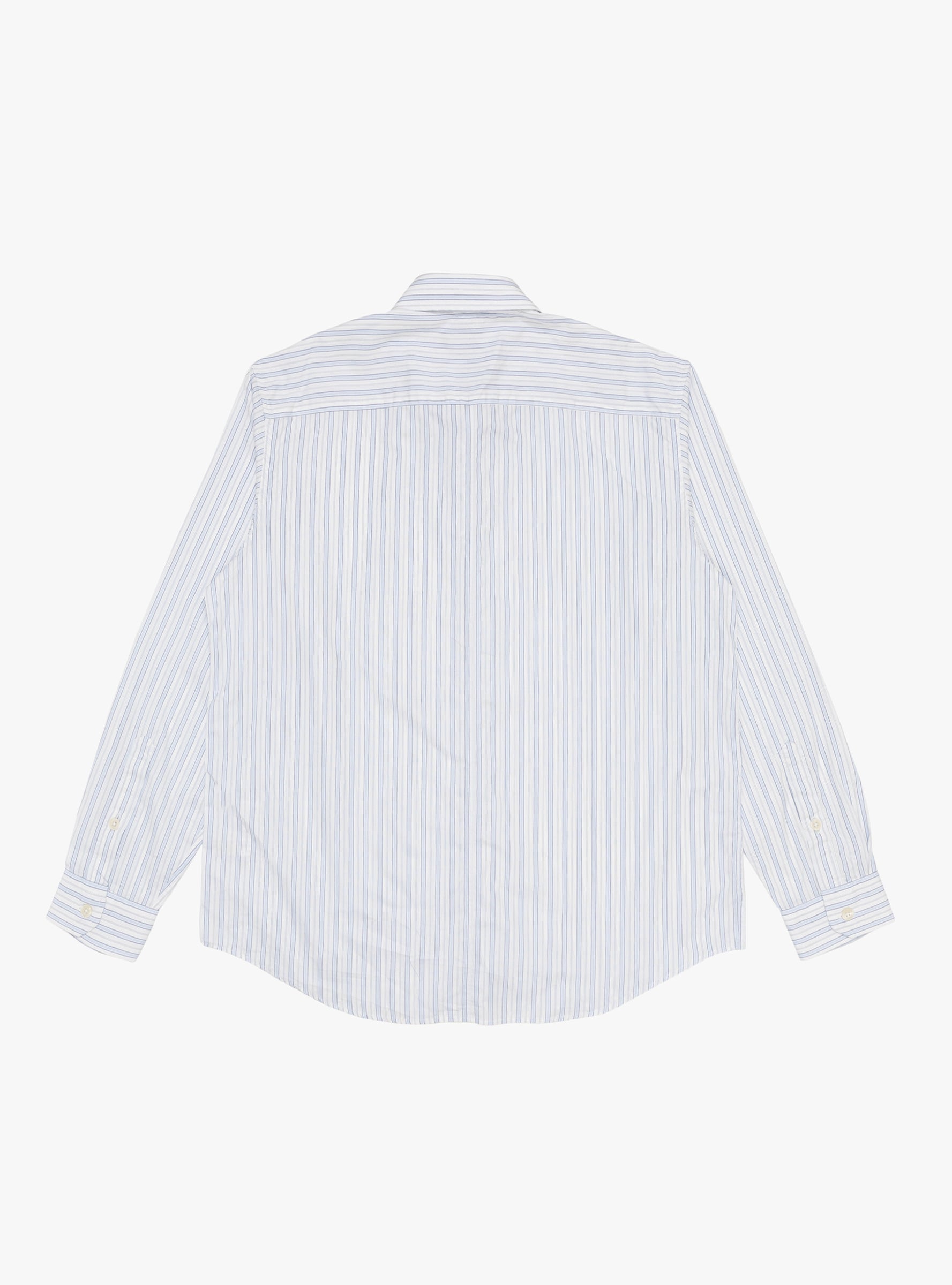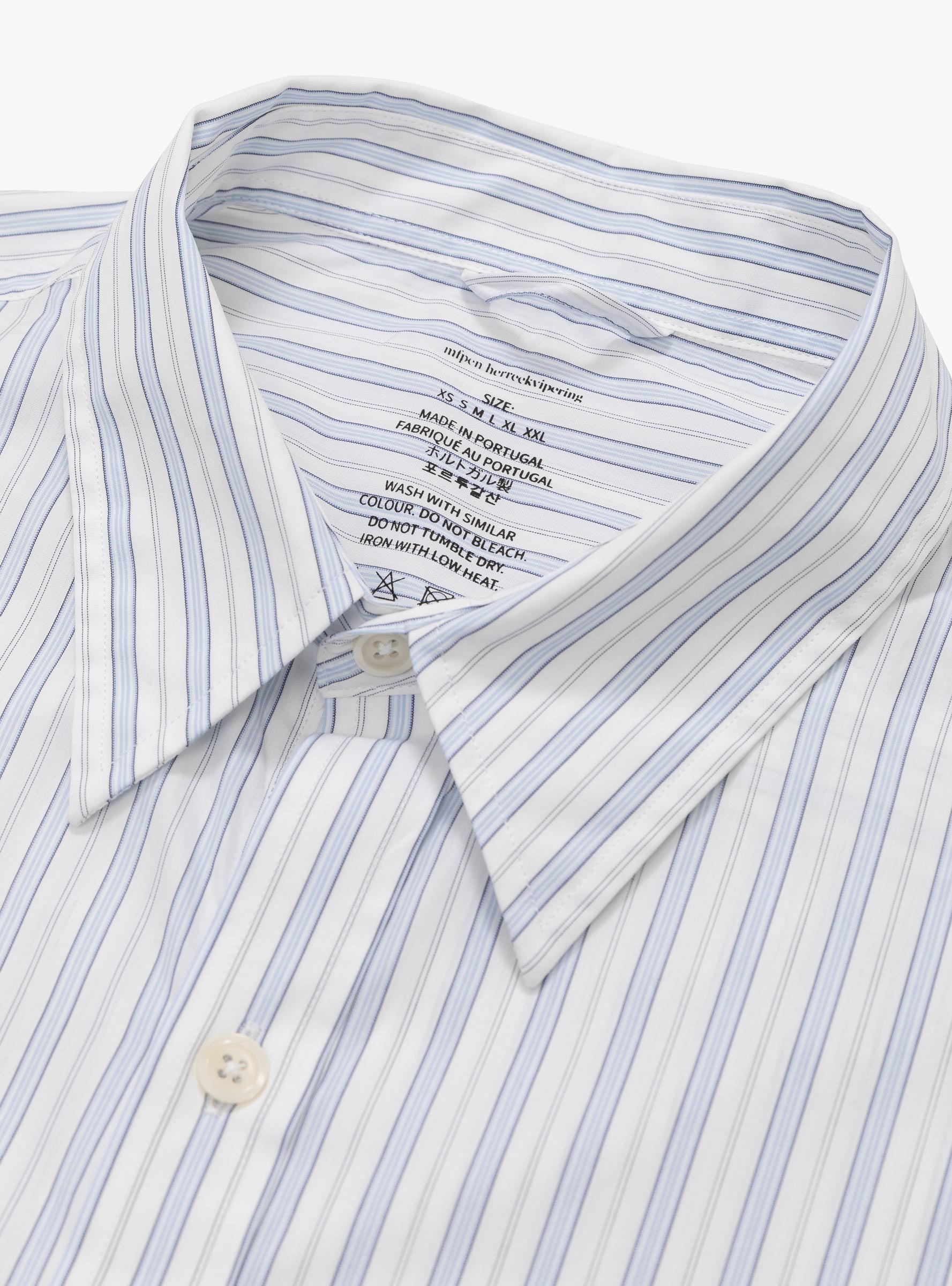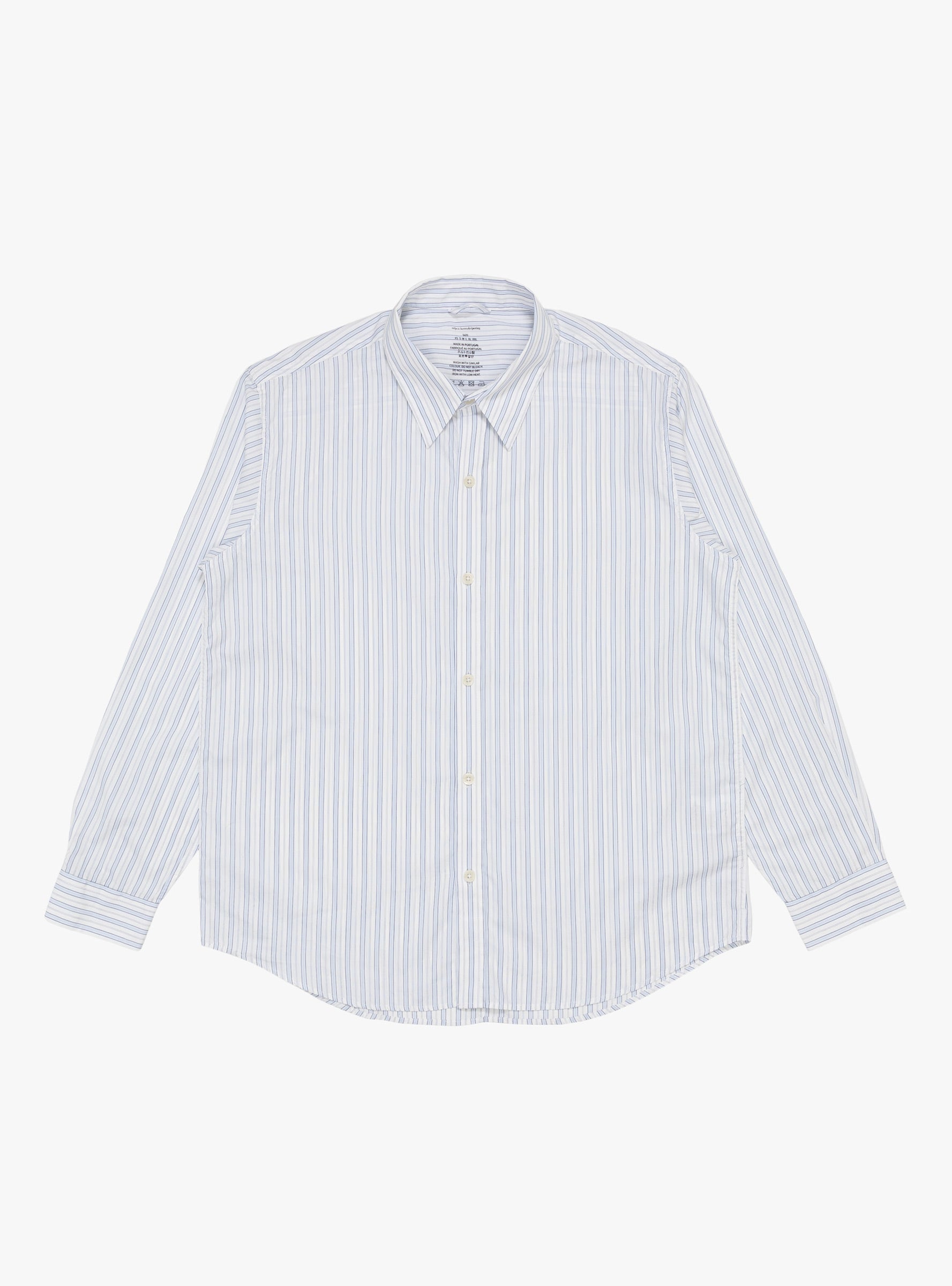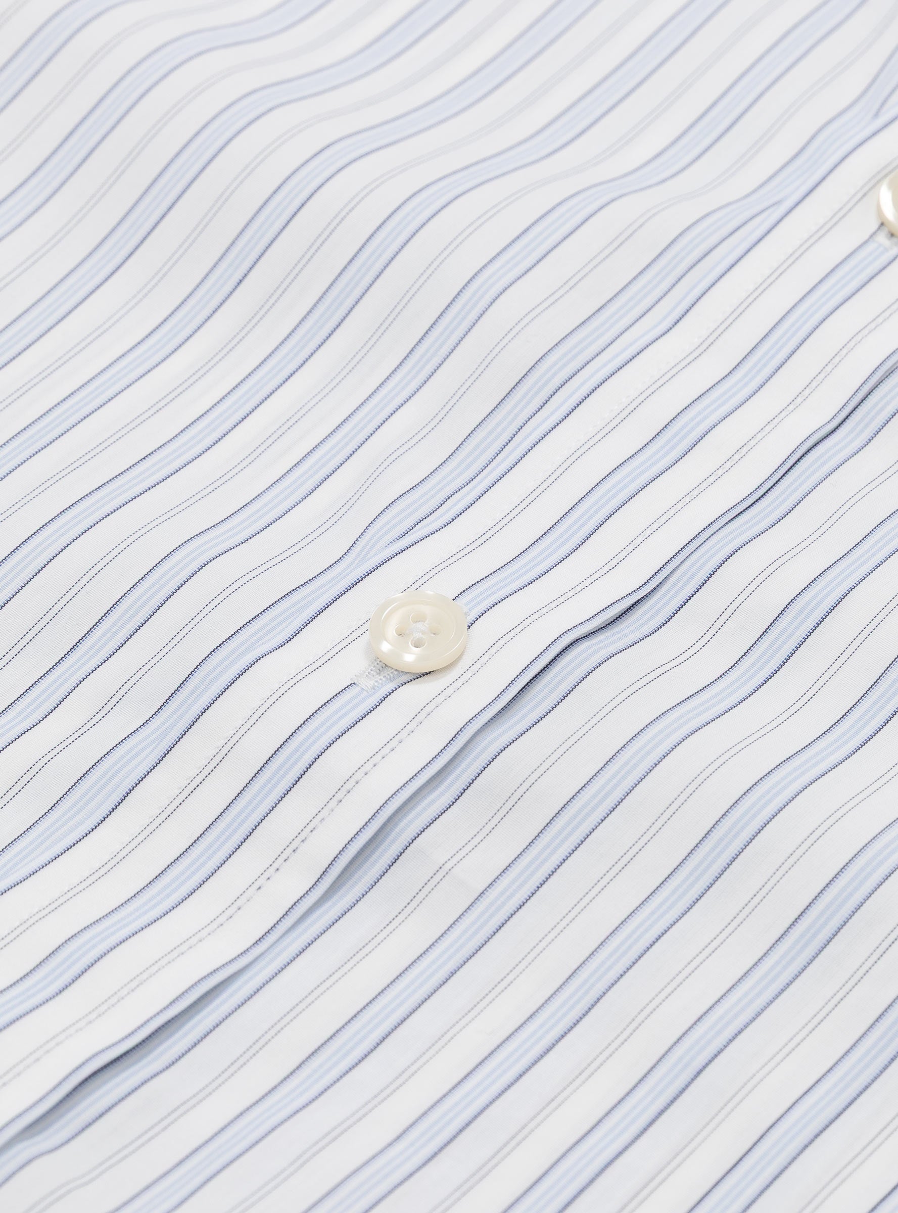 The Evening Shirt from mfpen comes in Off White Business Stripe and is made from cotton. This shirt features a spread collar, a button placket with ivory resin buttons, and a chest pocket. Finished with back yoke pleats and a rounded hem, it balances clean structure with everyday wearability.
