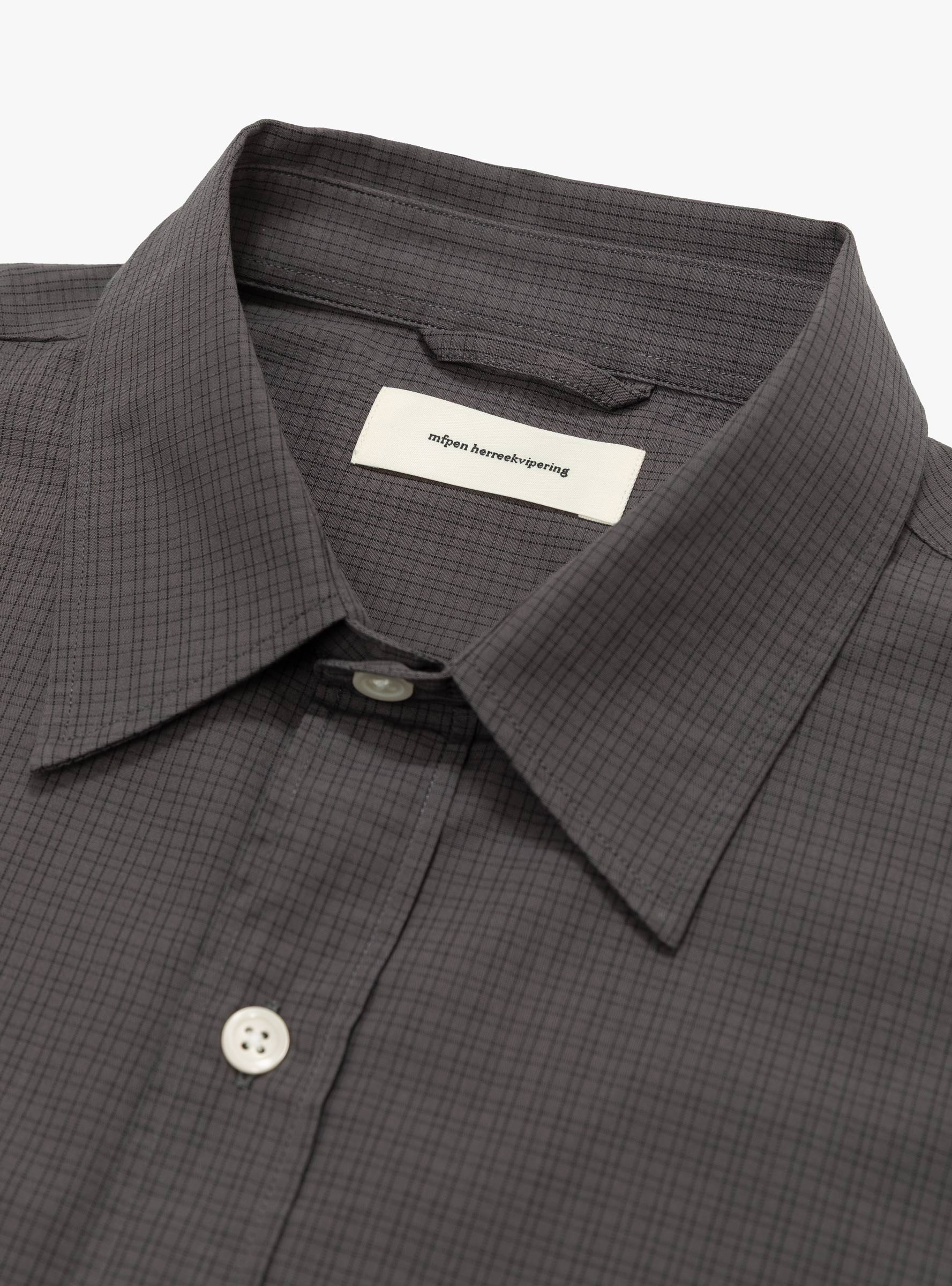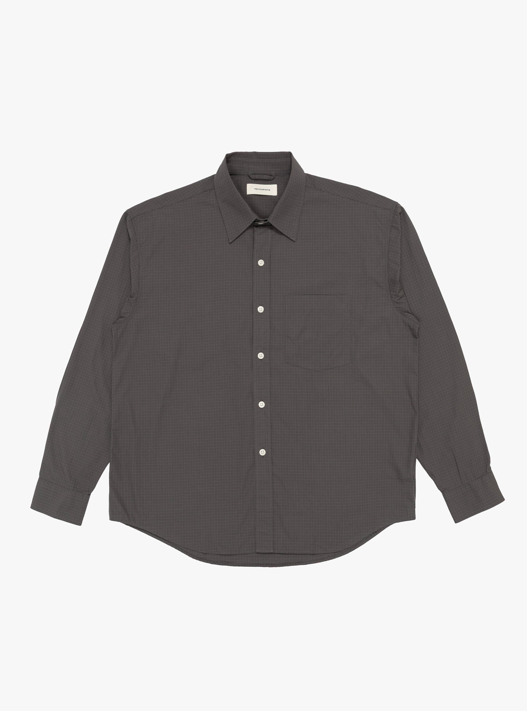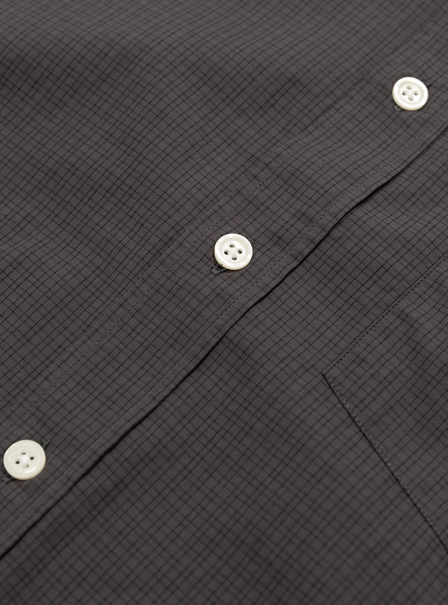 The Executive Shirt from mfpen comes in Mushroom Micro Check and is made from cotton poplin. Cut to a relaxed fit with drop shoulders, this long-sleeve shirt features a spread collar, a button placket with ivory resin buttons, and a chest pocket. Finished with a rounded hem and back yoke pleats, the micro-structured black plaid check sits on a warm grey ground with a dry hand feel.