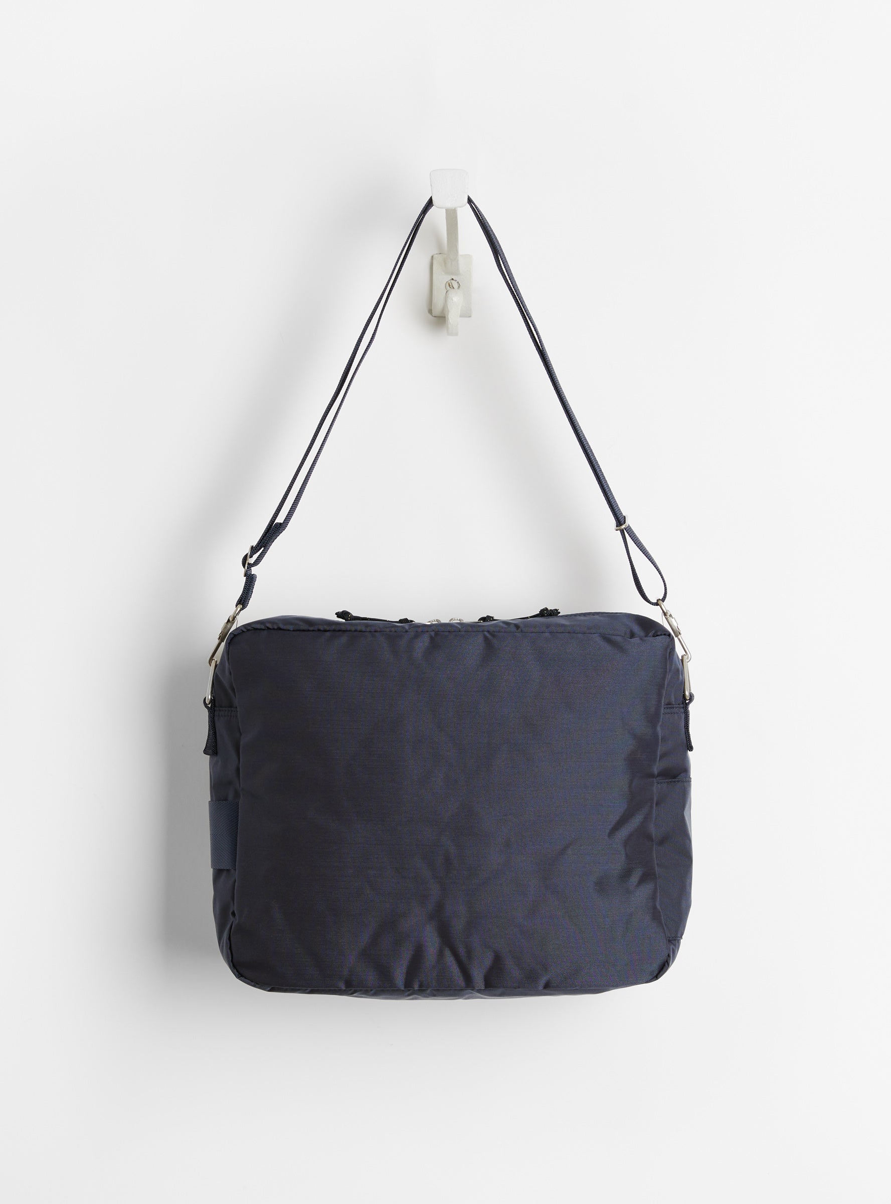 The FORCE Shoulder Bag (L) in Navy from Porter Yoshida & Co. is defined by a subtle contrast in fabric tone between the main body and the front pocket, creating a layered effect. Constructed from tough industrial 210 denier nylon, it balances durability with everyday practicality. Inside, a quilted ripstop nylon lining in emergency orange draws inspiration from military jacket interiors.