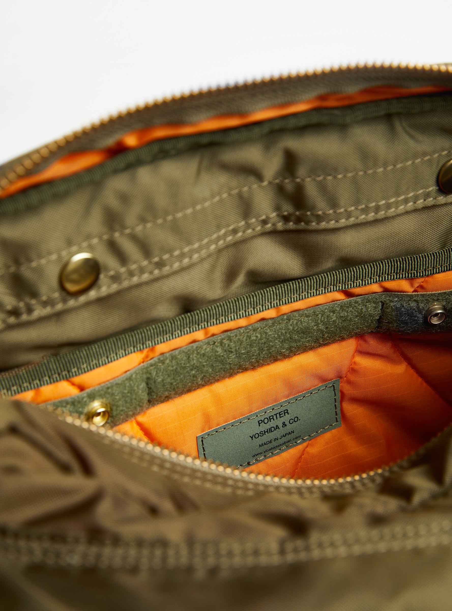 The FORCE Shoulder Bag (S) in Olive Drab from Porter Yoshida & Co. is defined by a subtle contrast in fabric tone between the main body and the front pocket, creating a layered effect. The outer is crafted from durable industrial-grade 210 denier nylon, while the interior features quilted ripstop nylon in a bold emergency orange, a detail inspired by military jacket linings.