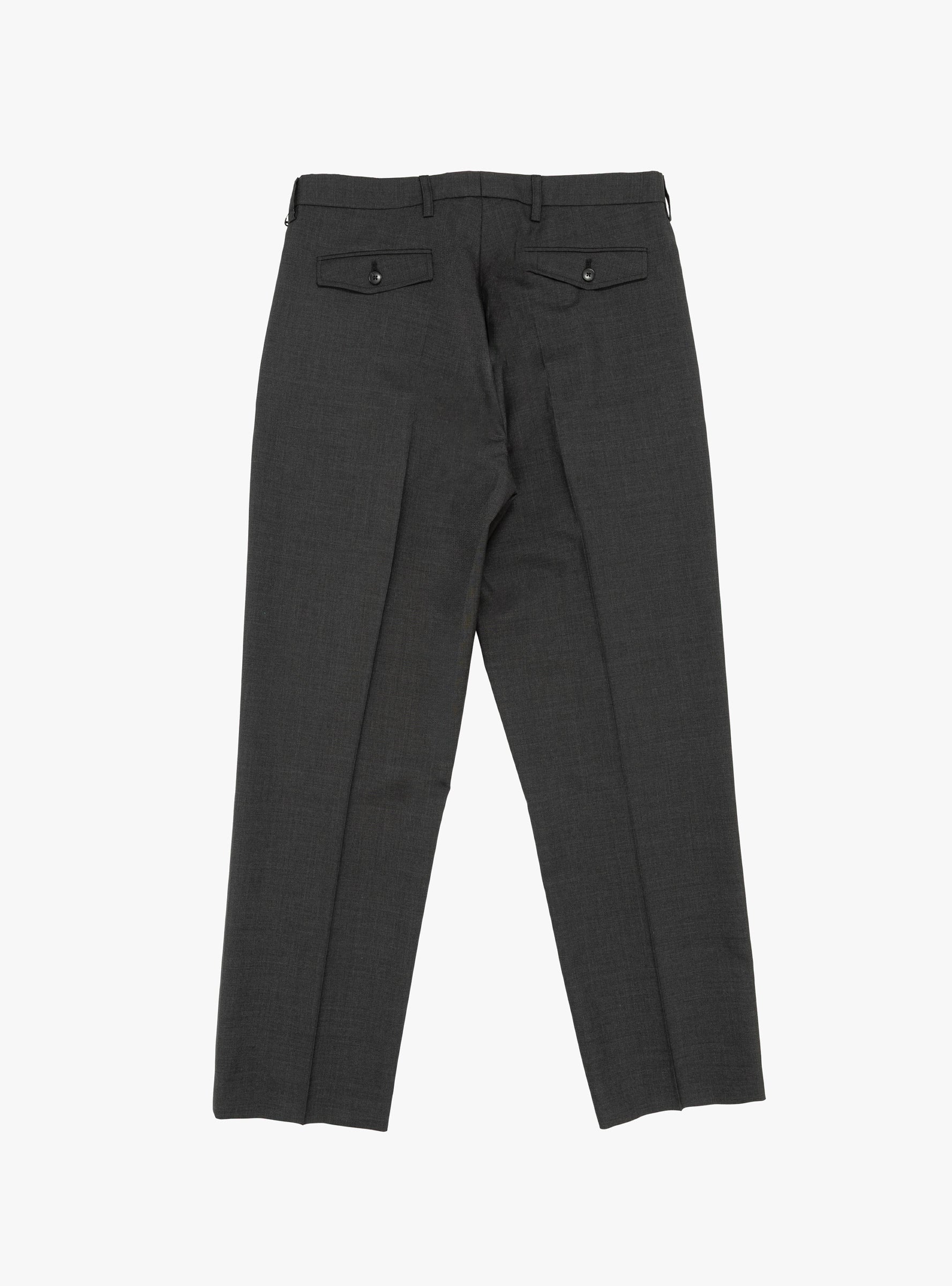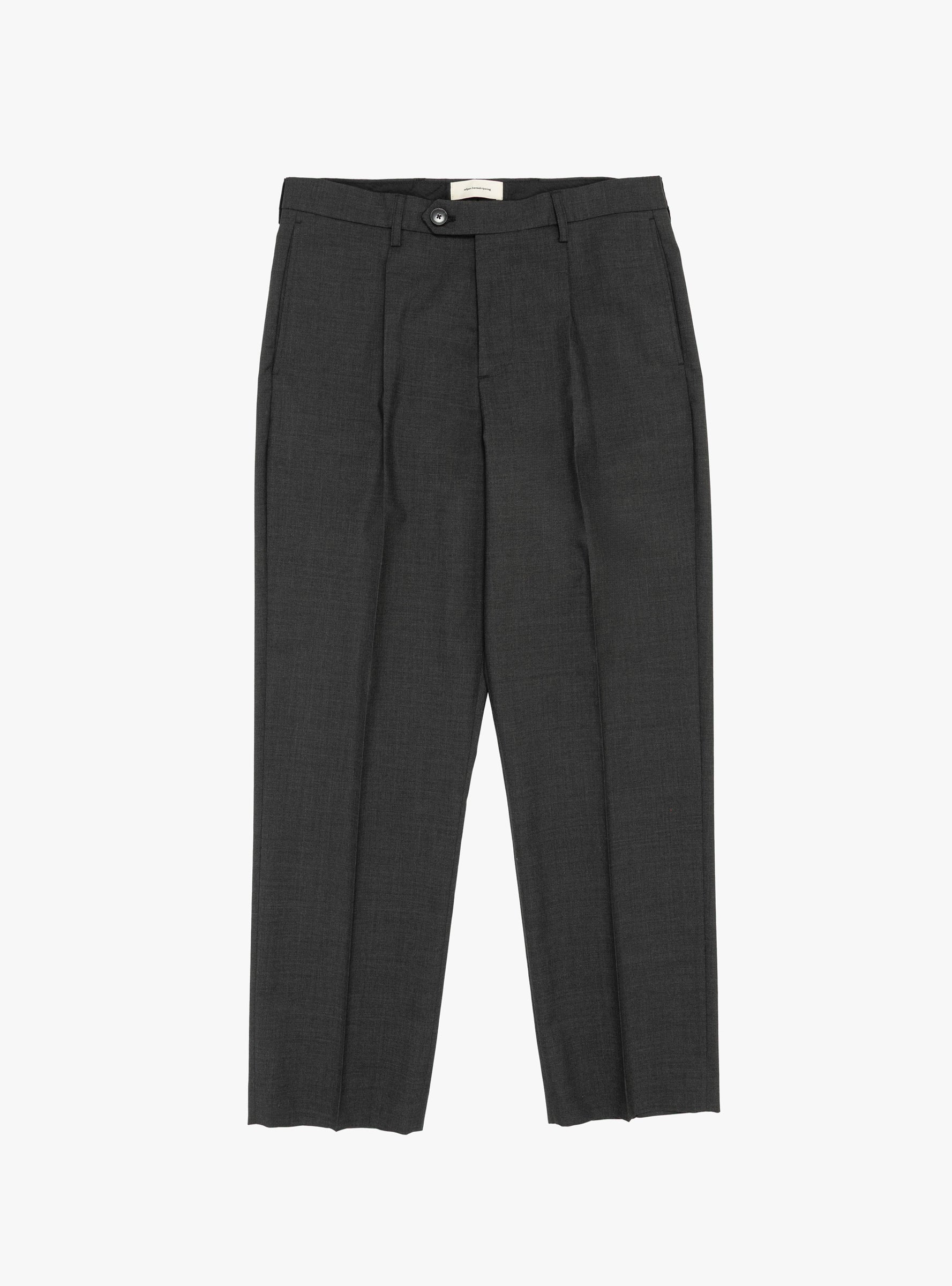 The Formal Trousers from mfpen come in Dark Grey Tropical and are made in Portugal from talian wool. These wide straight-fit trousers feature a mid-rise with single pleats, side pockets, rear welt pockets, button fastening with hook-and-eye closure, and a YKK zip fly. The tropical wool has a dry hand feel and subtle two-toned weave for refined texture.