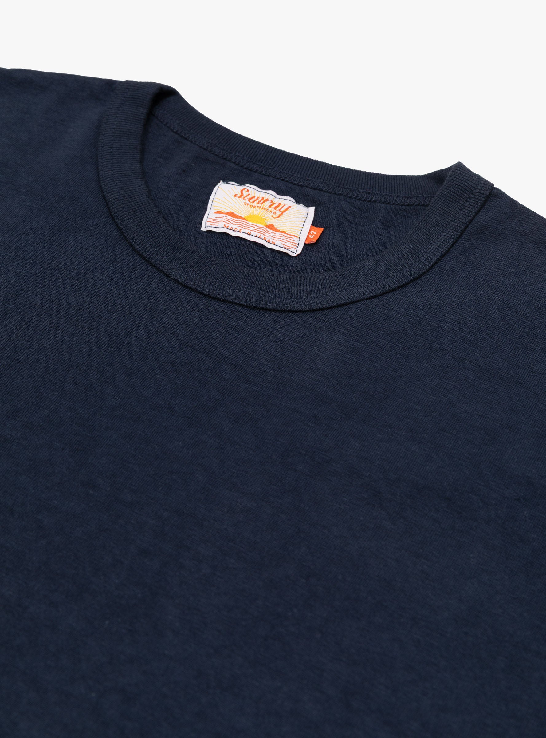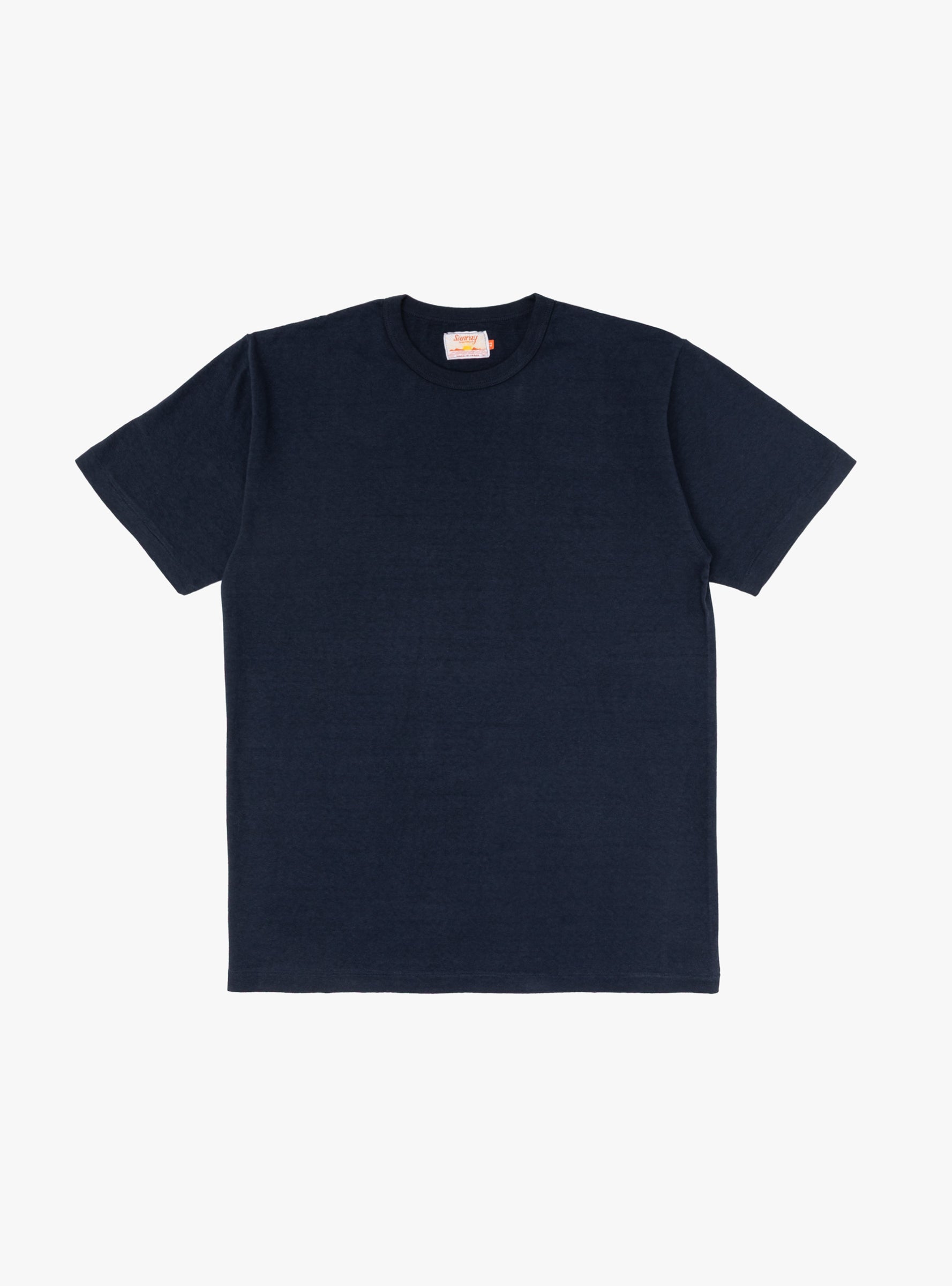 Made in Japan using one of the last two antique loopwheel knitting machines, which avoids the need for side seams and creates less tension on the fabric, this Dark Navy coloured Haleiwa T-shirt from Sunray Sportwear is cut to a classic, yet slightly boxy, silhouette with a crewneck.