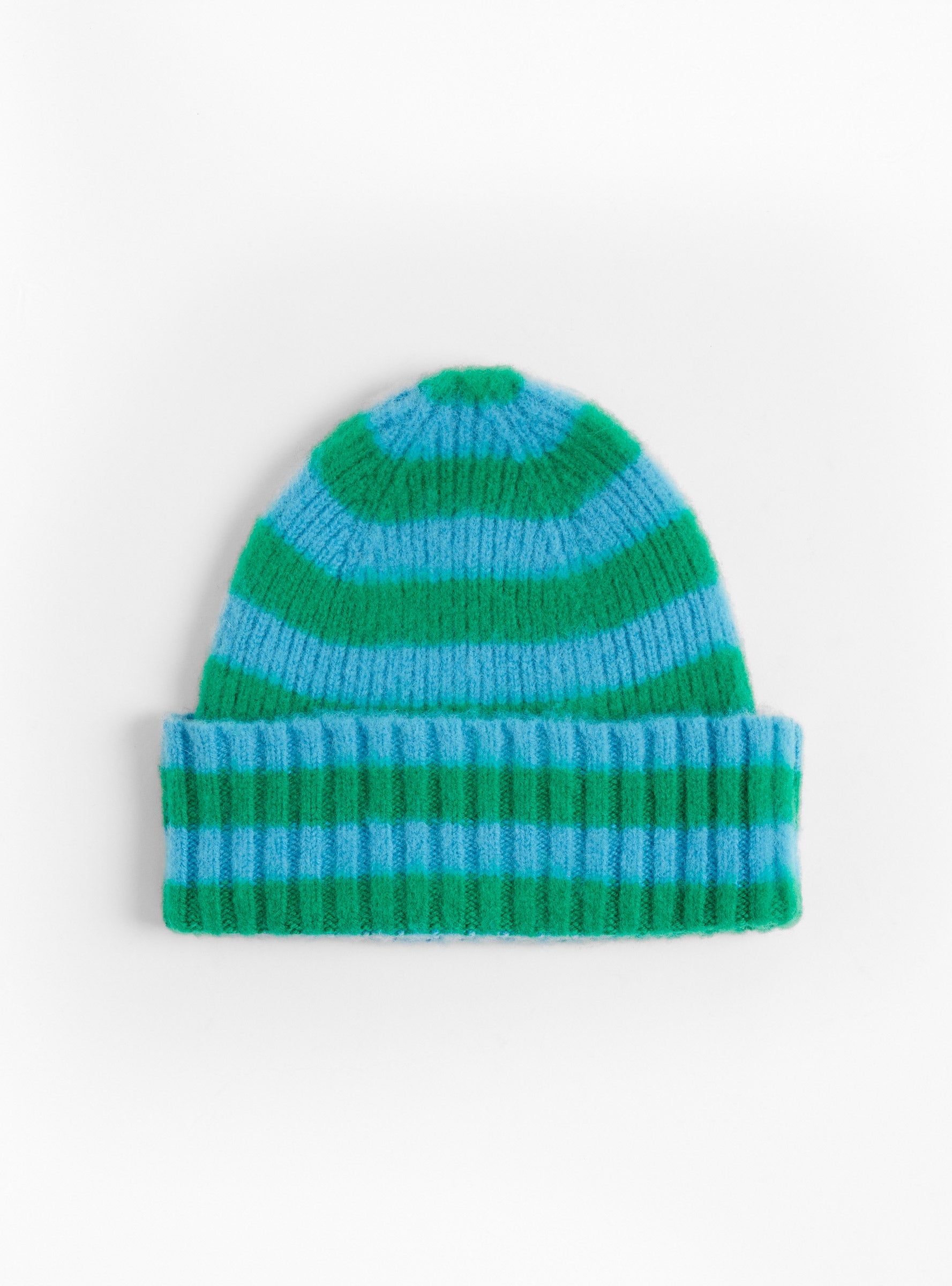 The Hard Working Hat in Green Delight from Howlin’ is a ribbed lambswool beanie with a blue and green stripe design. Made in Scotland, the hat offers warmth and stretch for everyday wear.