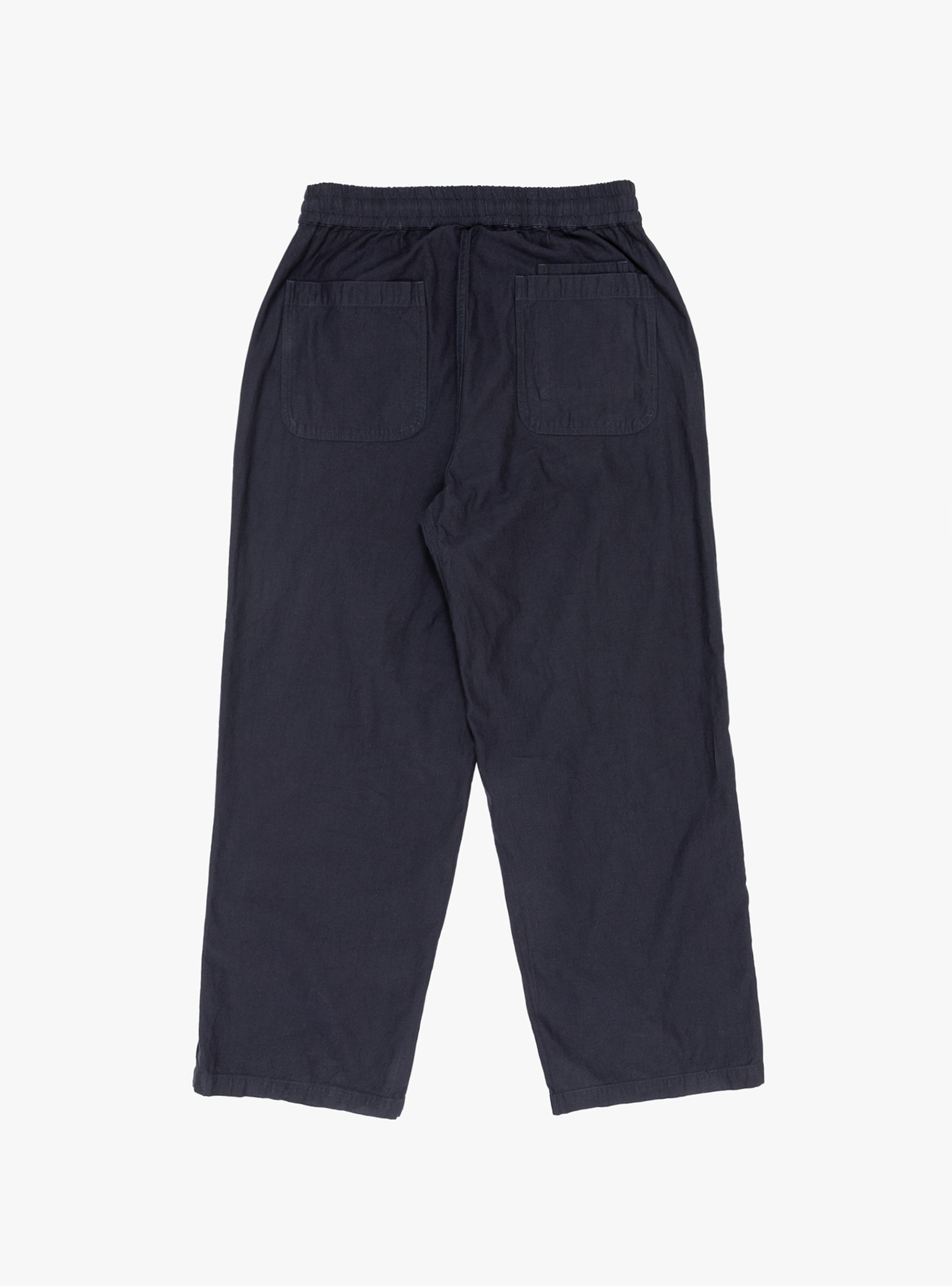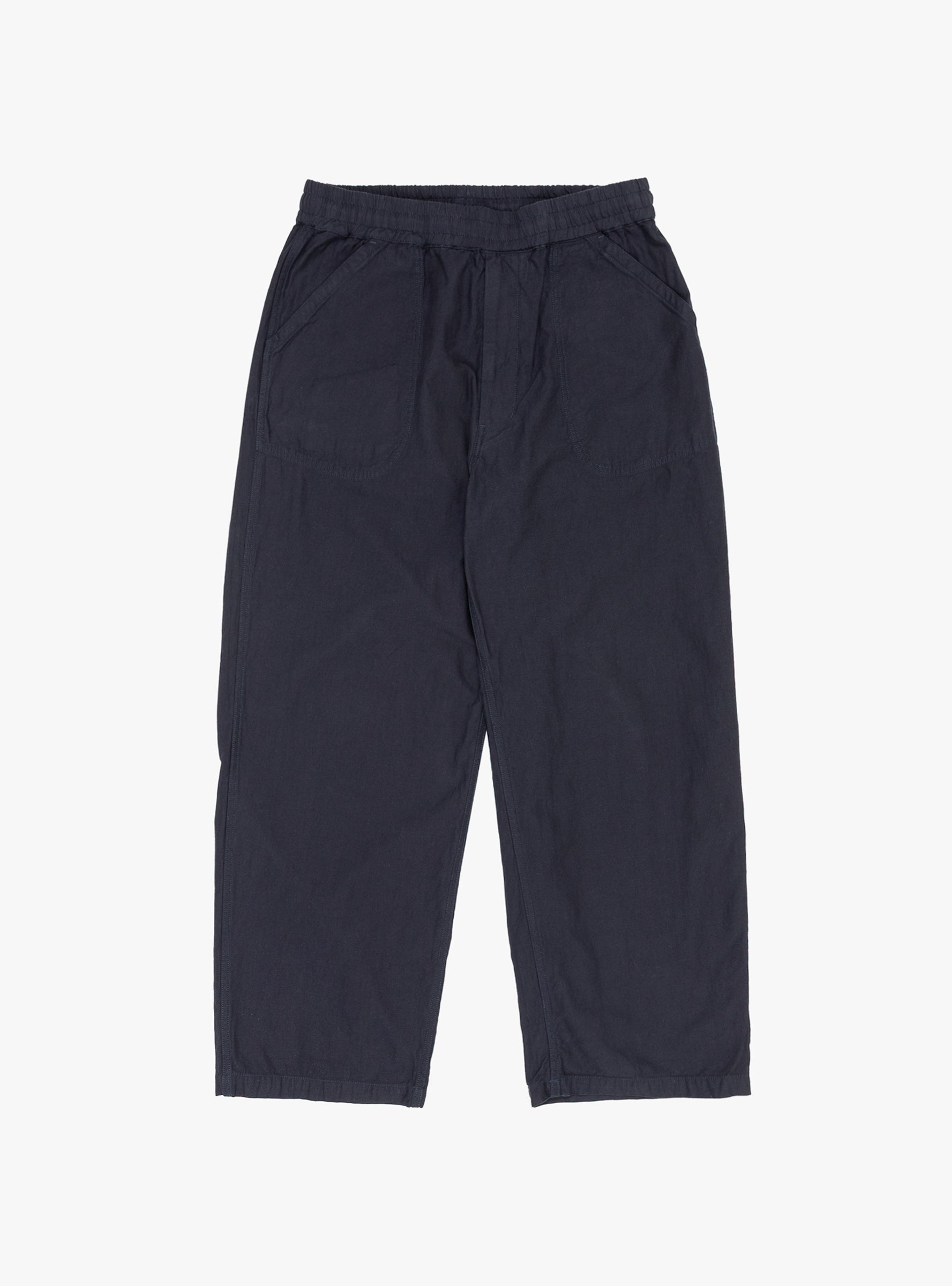 The Indigo Deck Pants from nanamica are wide straight-cut trousers crafted from durable indigo back satin. Designed for comfort and ease of movement, they feature an elasticated waist with drawcord, a front zip fly, and a gusseted inseam to allow greater mobility.