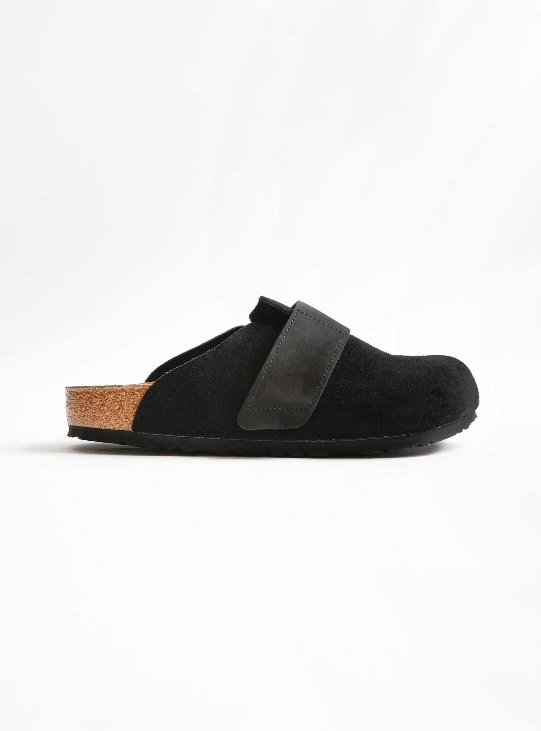 The Loma Suede in Black from Birkenstock is a casual slip-on sandal inspired by the classic Boston model. The compact design features a wide touch fastener and a soft suede upper that molds to the foot for comfort, paired with high-quality nubuck leather accents.
