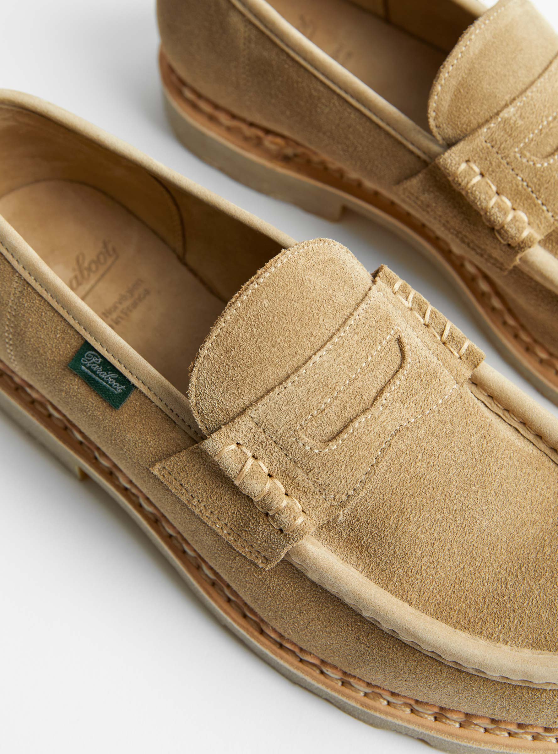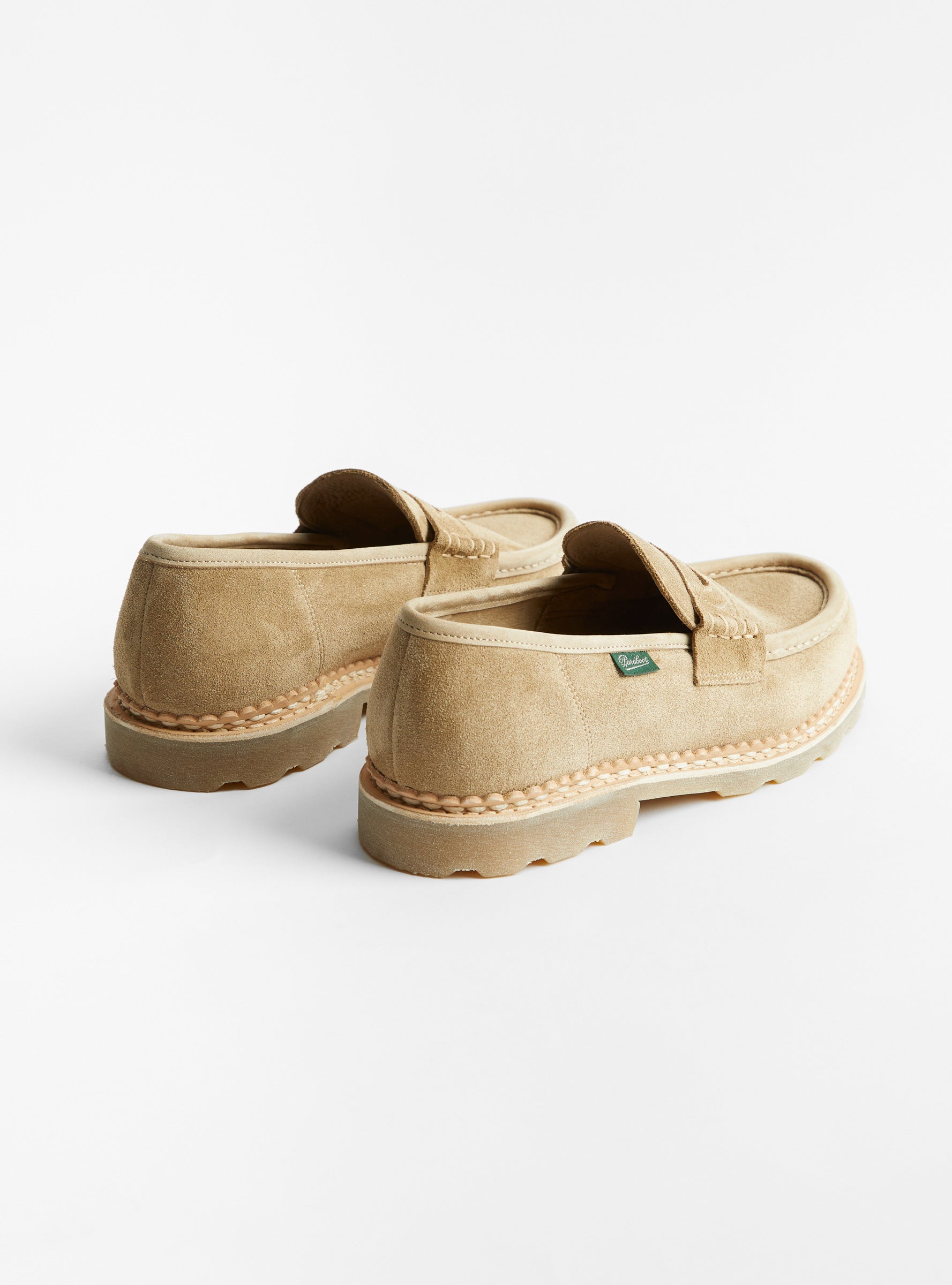 The Paraboot Nantes loafer is arrives in a sand suede upper, offering a refined yet rugged take on a classic silhouette.Handcrafted in France, this unlined version of the Reims model features a piped seam loafer construction with a classic saddle strap. A genuine Paraboot rubber sole provides excellent traction, while Blake stitch construction ensures durability.