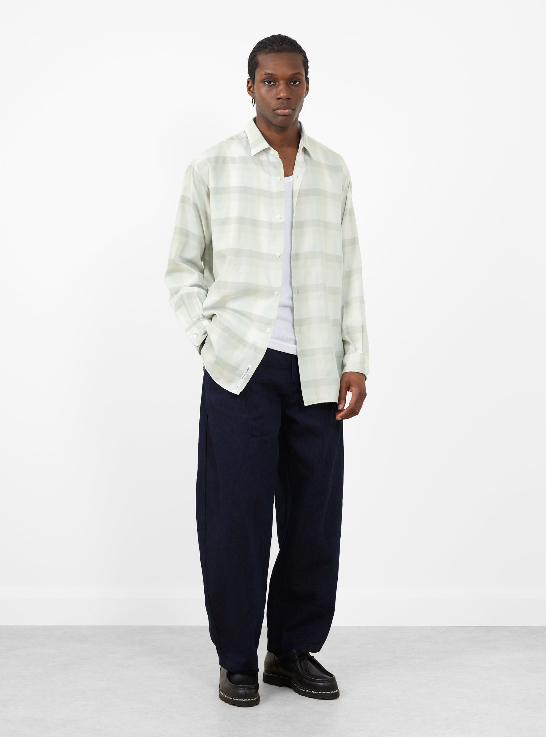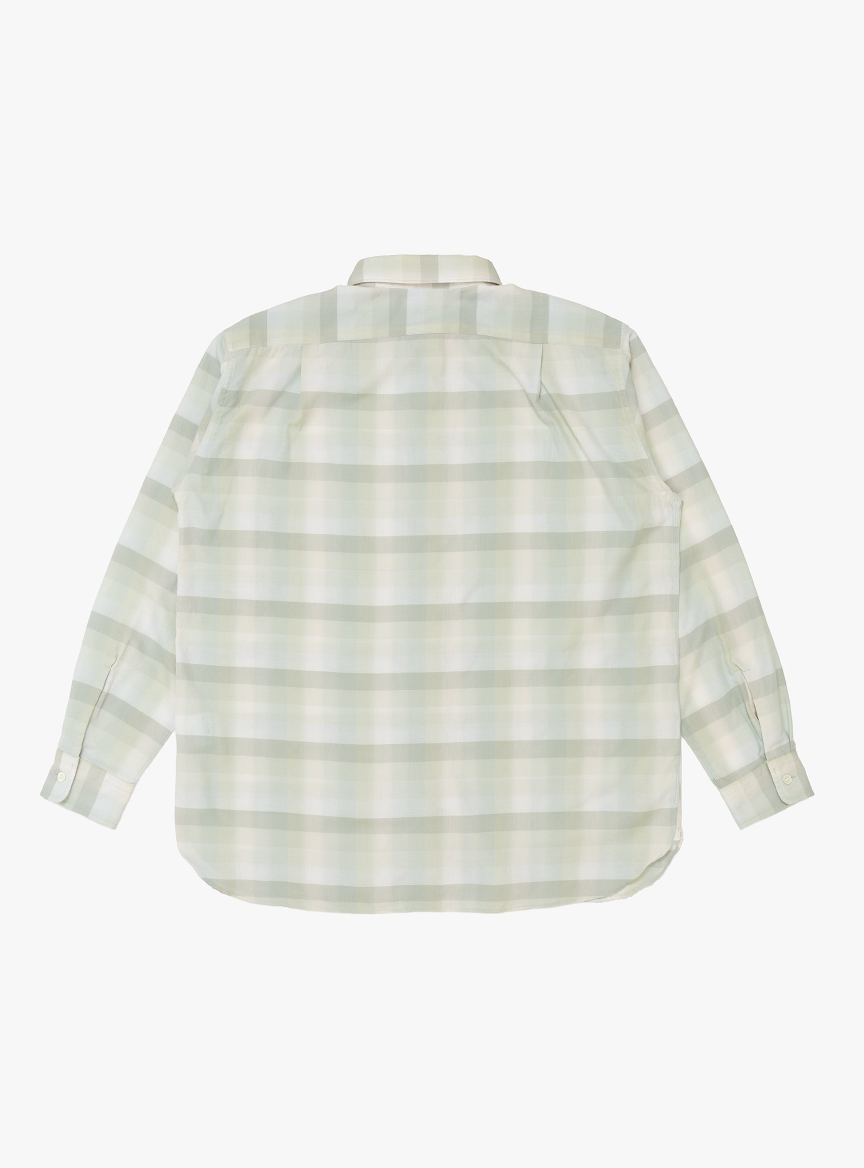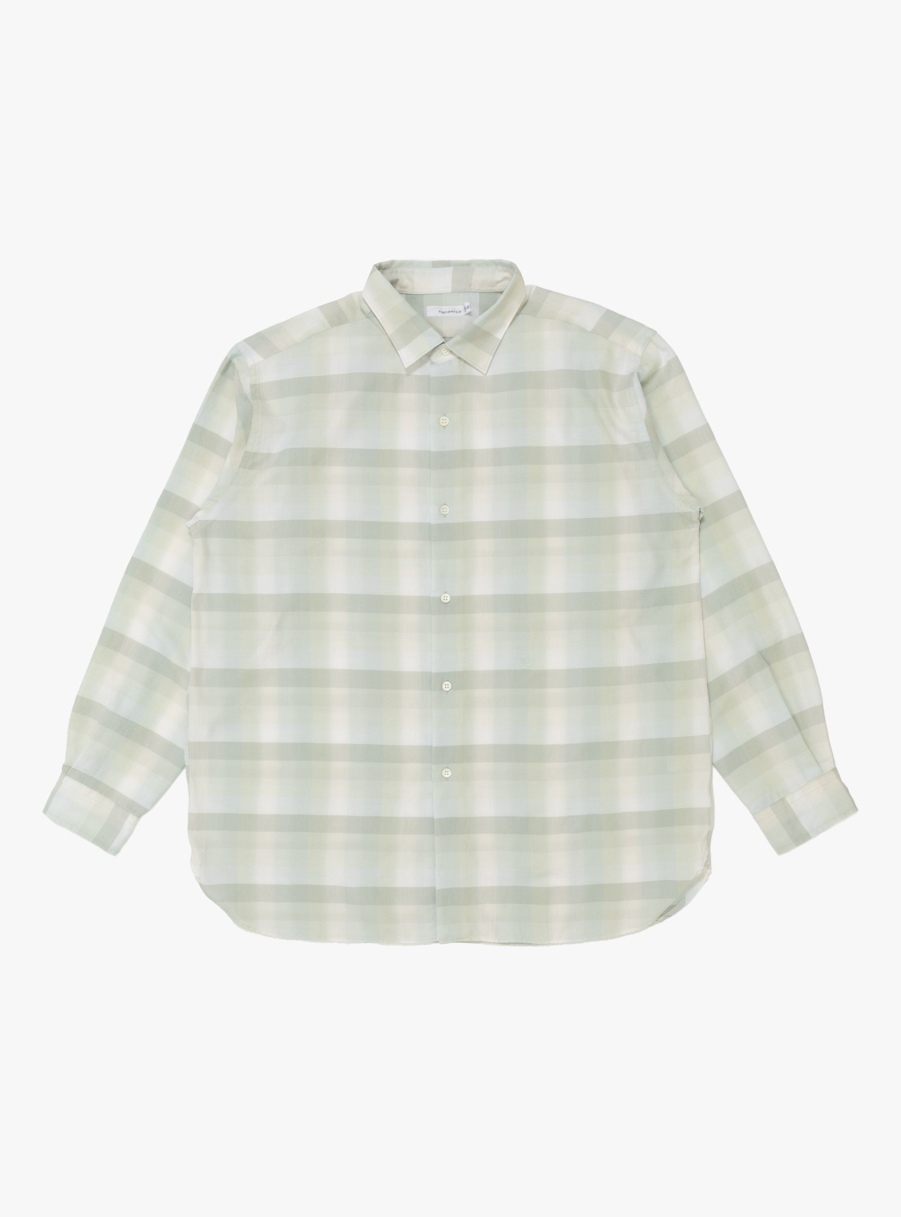 The Regular Collar Wind Shirt comes in Light Khaki and is made in Japan from a cotton blend. This shirt has a regular collar and relaxed fit, with ombré check fabric woven using covering core yarn. An embroidered nanamica logo sits on the front for a subtle brand detail.