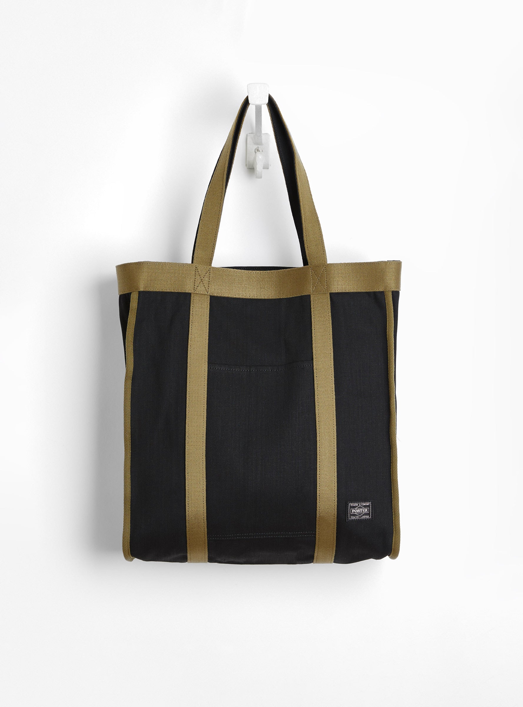 The Stand Tote Bag (L) from Porter Yoshida & Co. arrives in Black Denim. Crafted from 10.75 oz black denim, the vertical warp threads are rope-dyed so the colour gradually reveals the core over time, creating a distinctive vertical drop effect. The bag has a simple silhouette with an olive acrylic tape and long handles, designed to fit a laptop and carry comfortably on the shoulder.