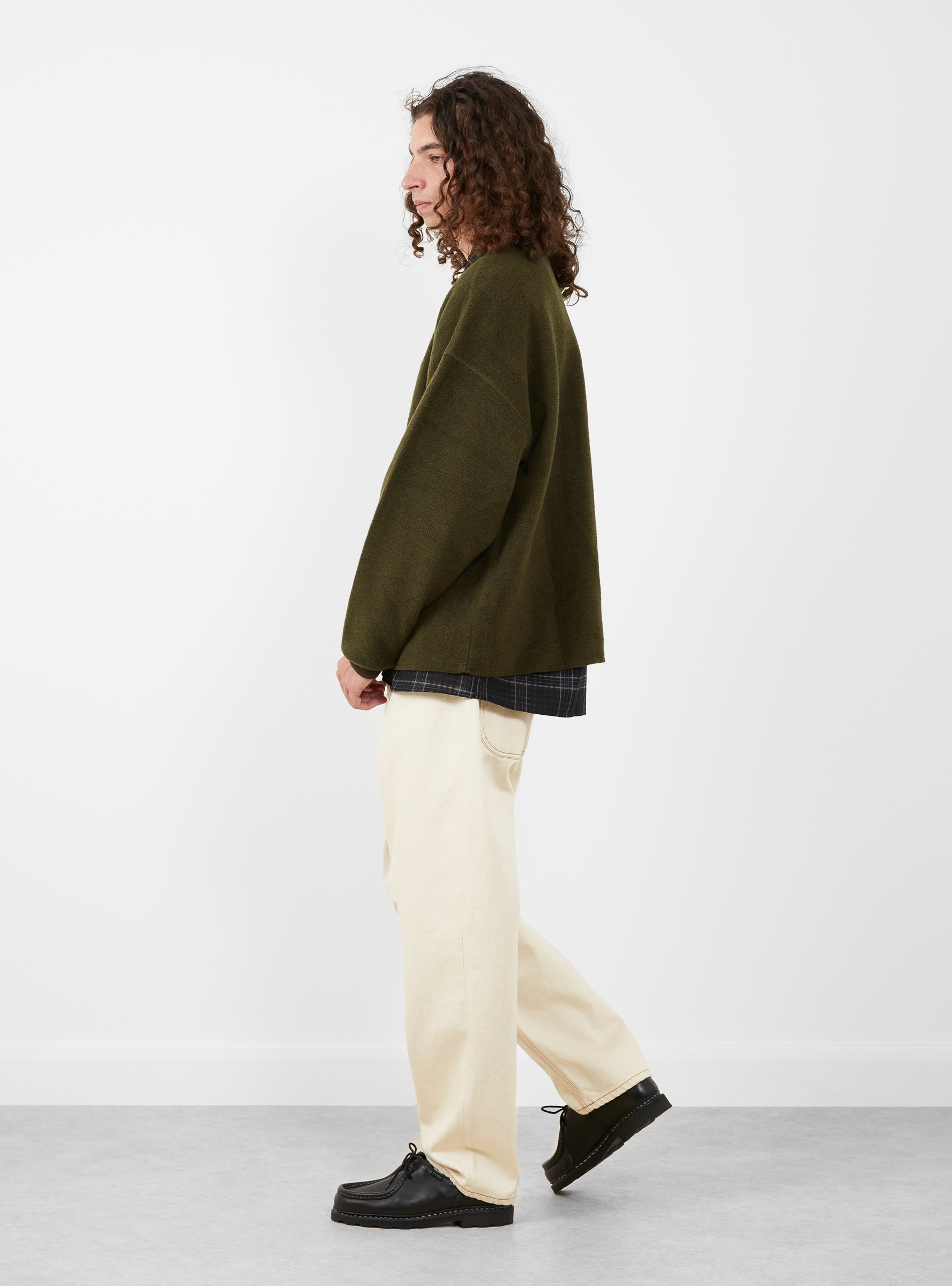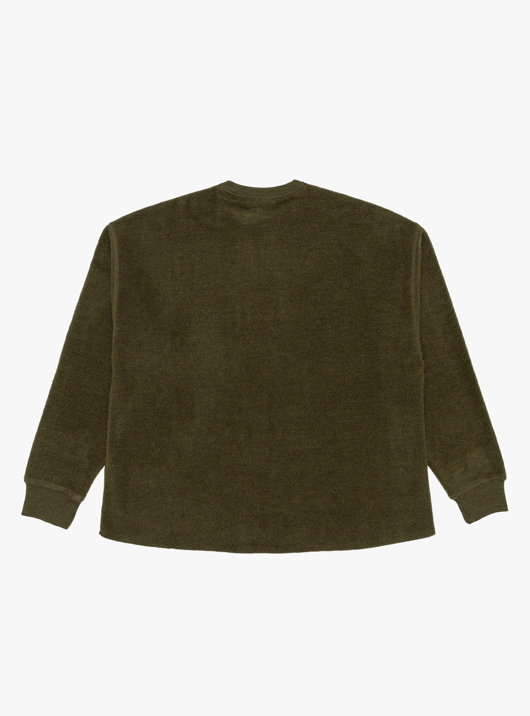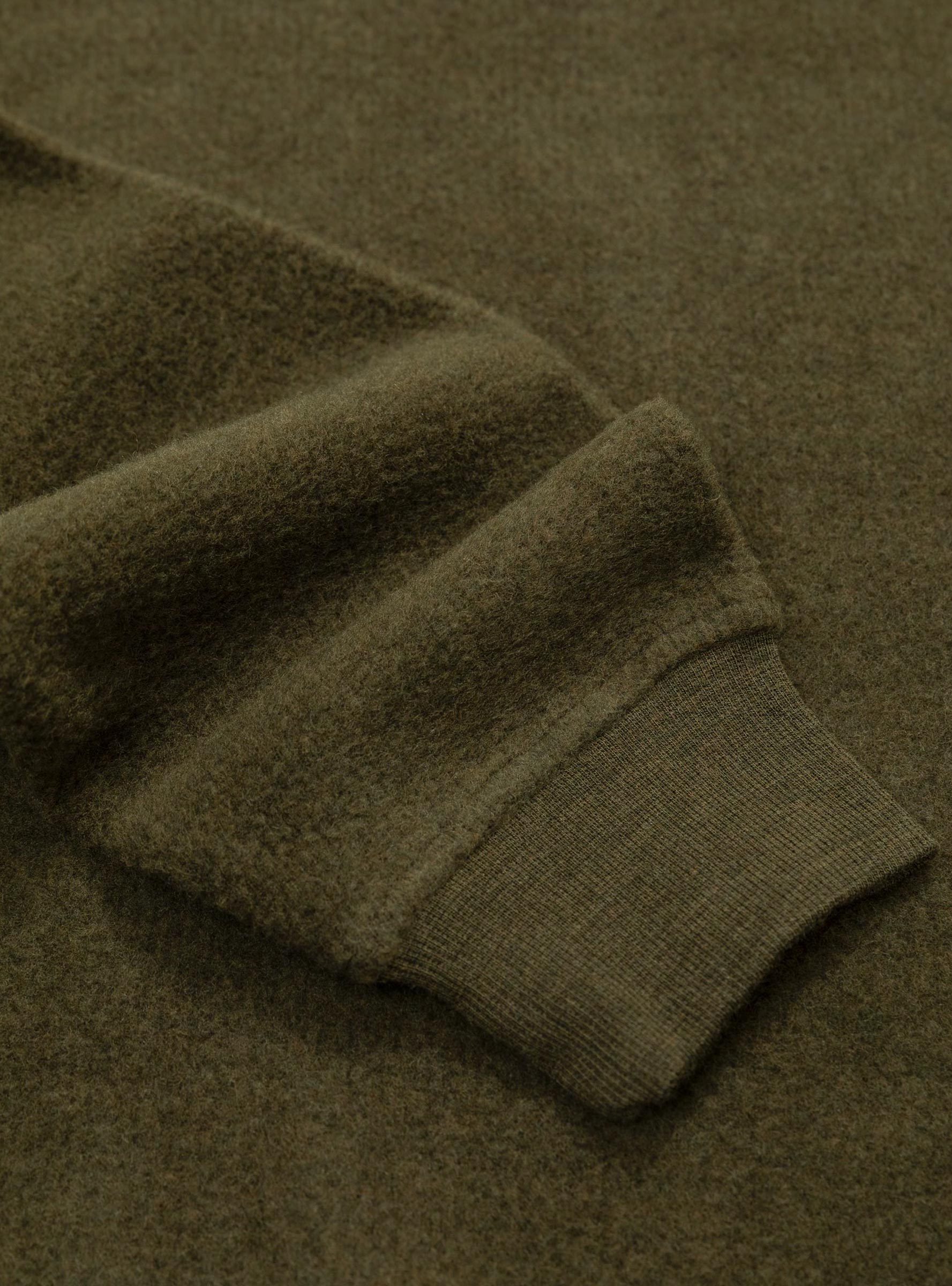 The Studio Sweatshirt in Dark Green from YMC is a double-faced crew neck style made from a Portuguese wool and cotton blend. Featuring a brushed finish for a soft hand feel, the sweatshirt is cut with an oversized silhouette and detailed with a bound neckband, ribbed cuffs, and a raw edge hem.