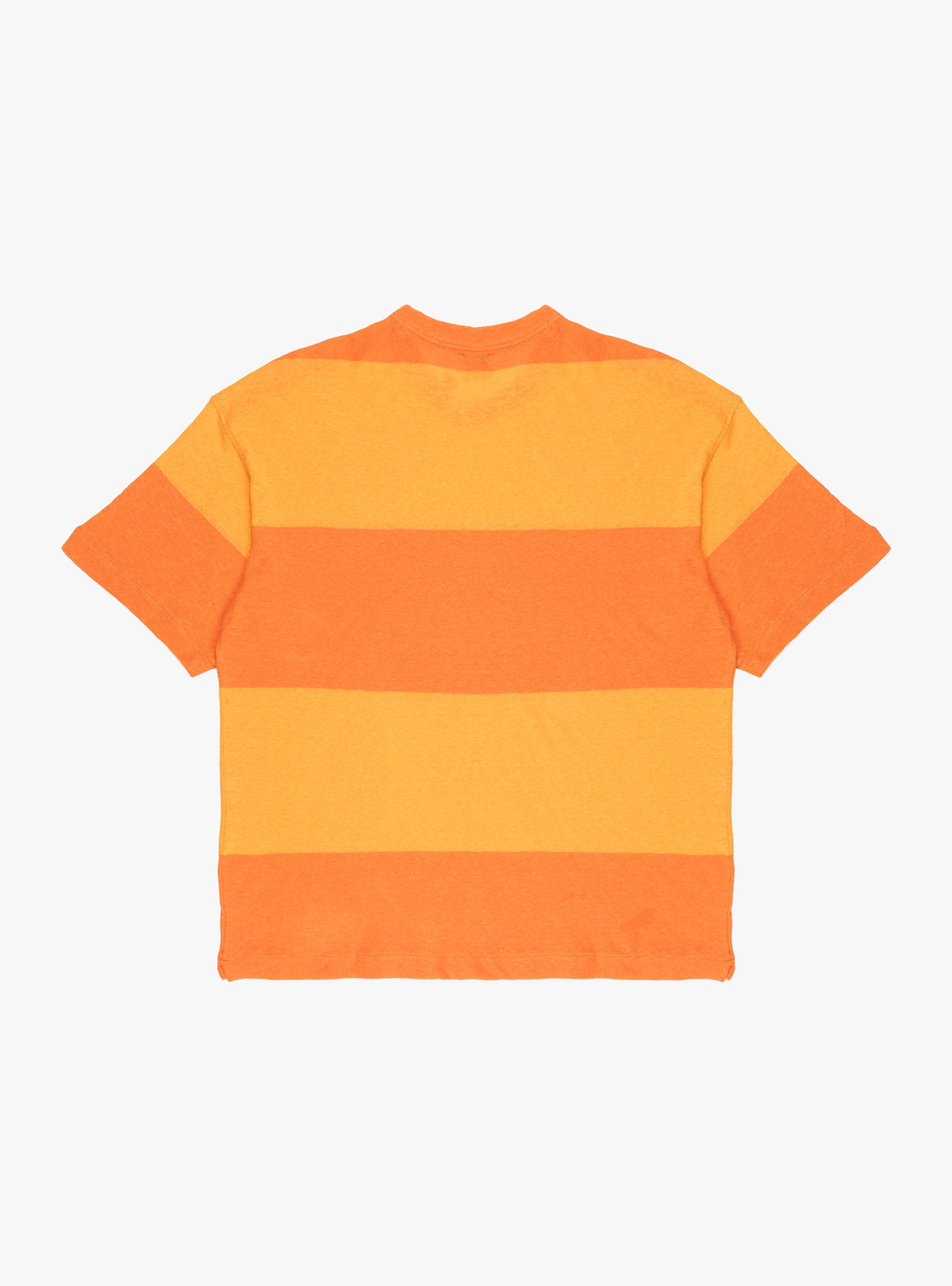 The Triple T-Shirt from YMC comes in Orange and Yellow and is made from a 50/50 cotton and linen blend. This short sleeve crew neck features a bound rib neckband, a block stripe design, a side pocket, and side seam vents for a relaxed, wearable fit.