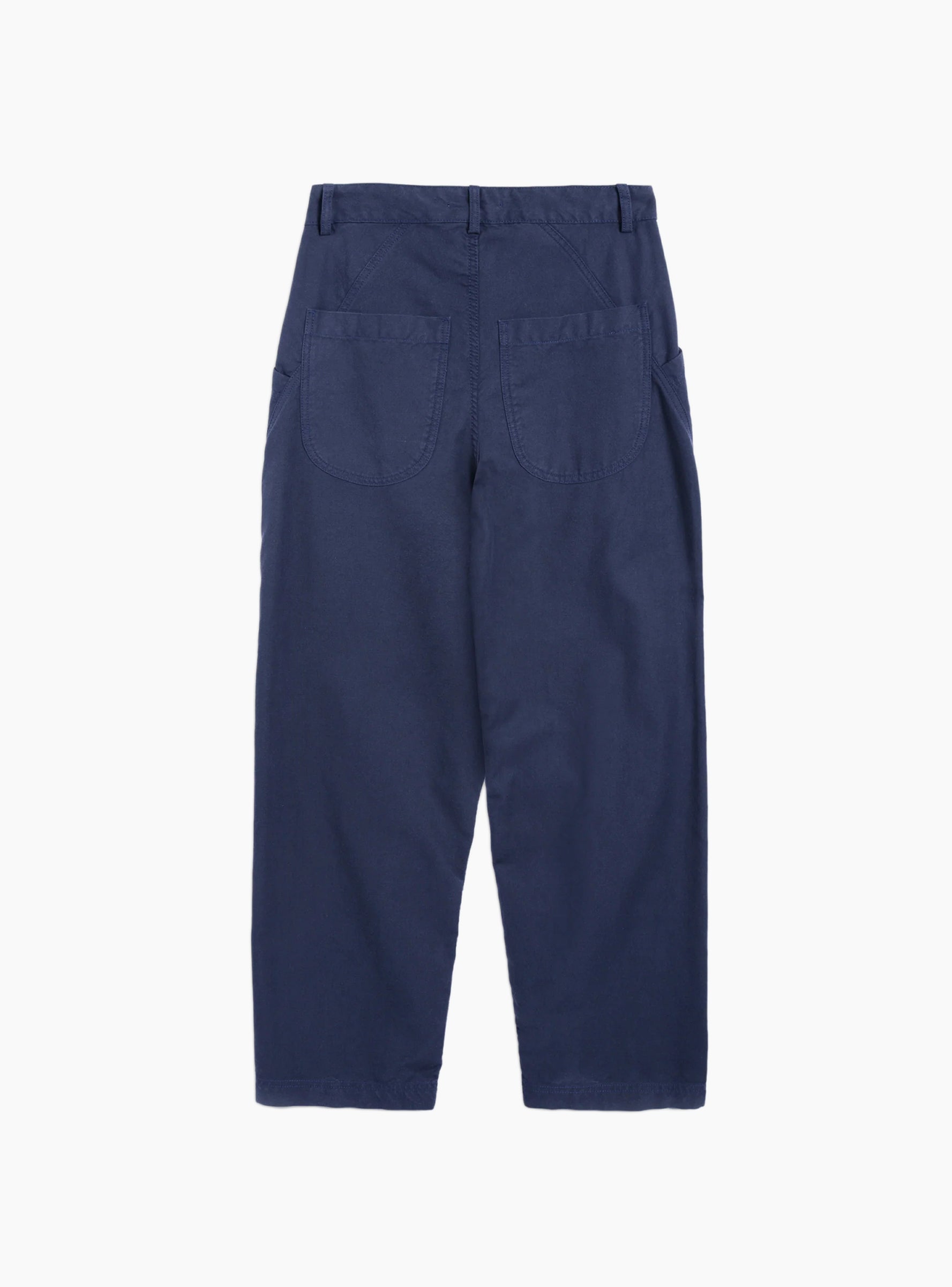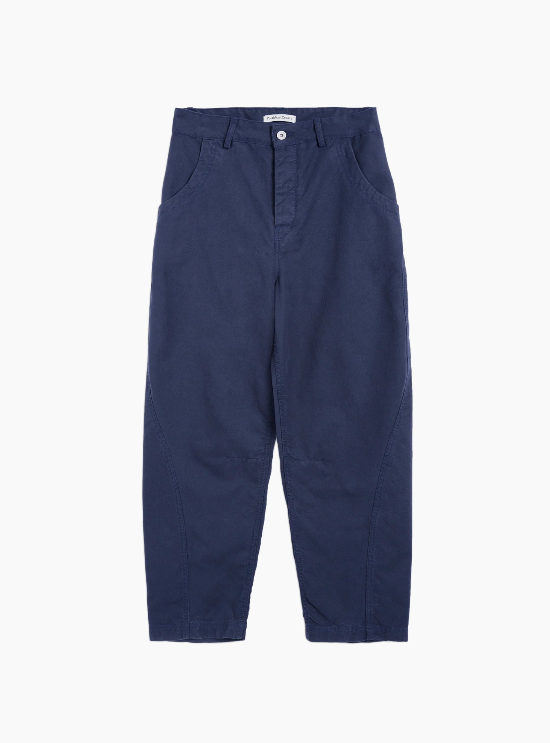 The Twisted Seam Trouser from YMC comes in Navy and is made in Portugal from a Tencel and cotton blend micro canvas. Cut to a low-rise, relaxed fit with a tapered leg, this piece-dyed twill style features twisted seam construction and knee shaping darts for ease of movement. Finished with curved front and back patch pockets and a metal button fly.