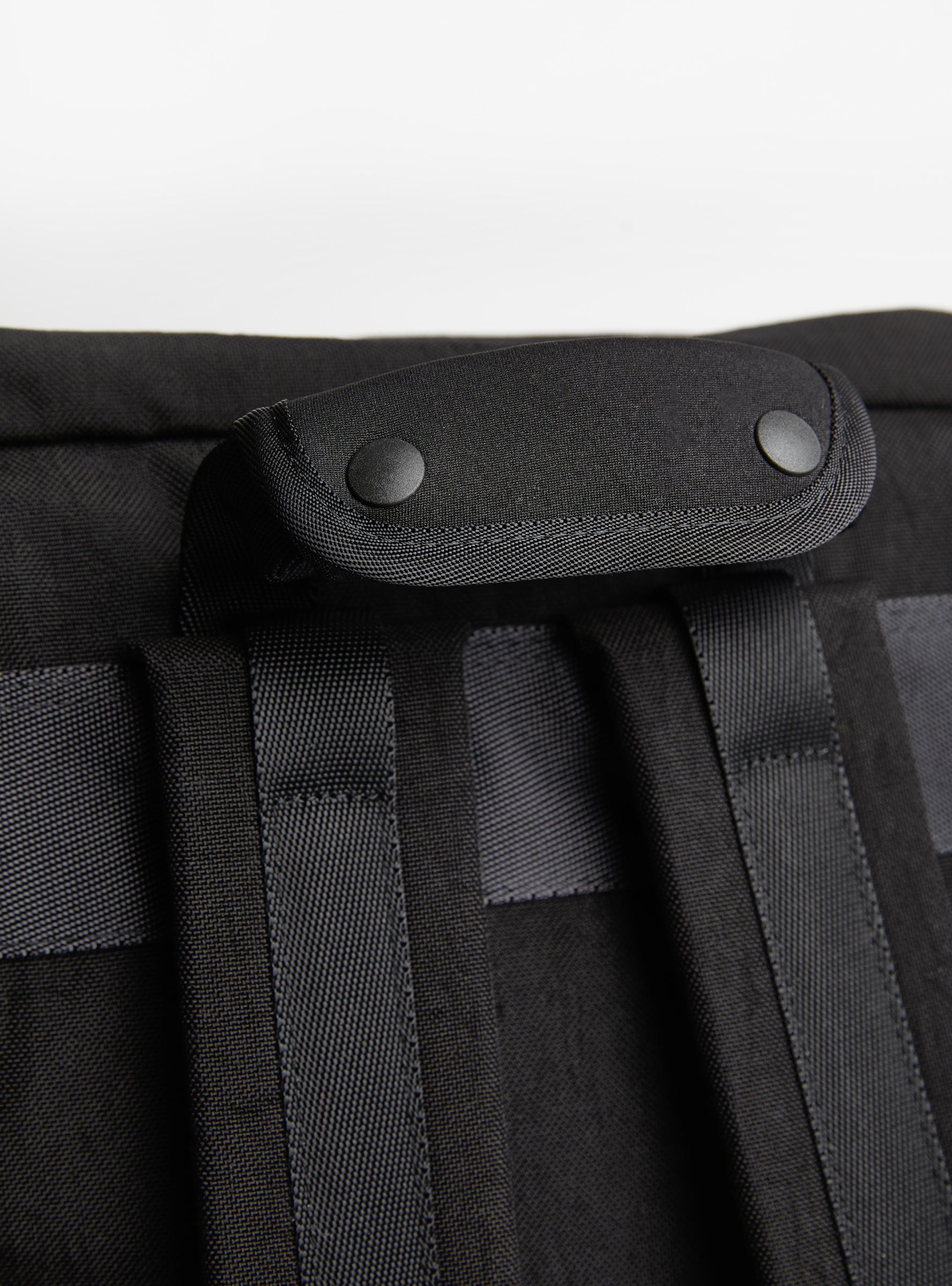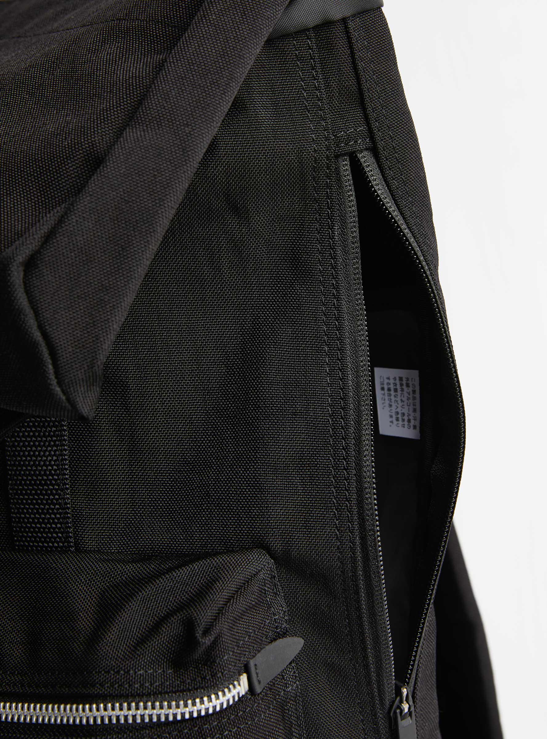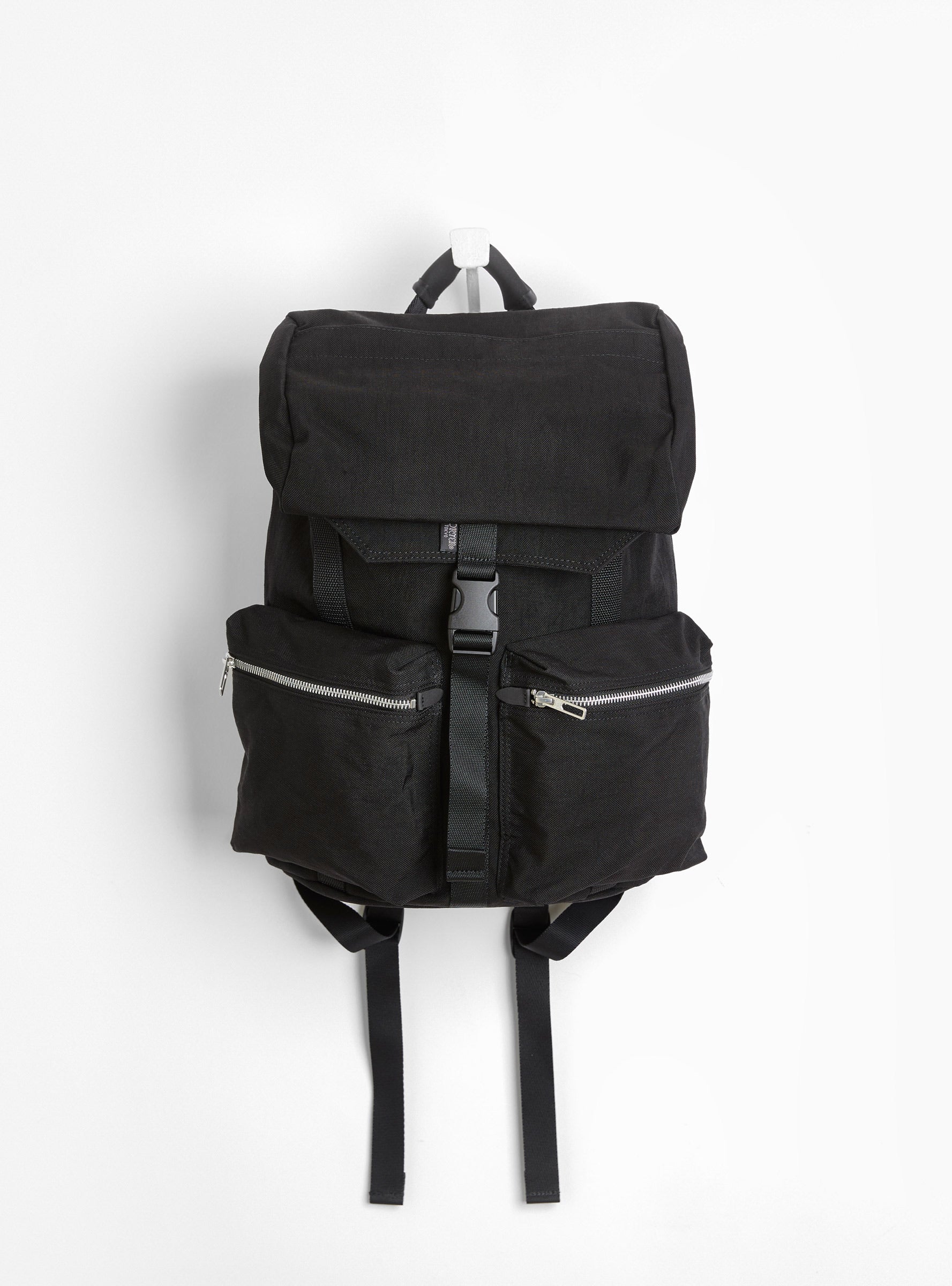 The Willow Rucksack from Porter Yoshida & Co. arrives in Black. Crafted from thick nylon treated with a salt-shrinking process, the fabric develops soft wrinkles and a natural cotton-like texture. The padded handle ensures comfort, while the rucksack features multiple exterior pockets and a side zipper for easy access to the main compartment without opening the flap.