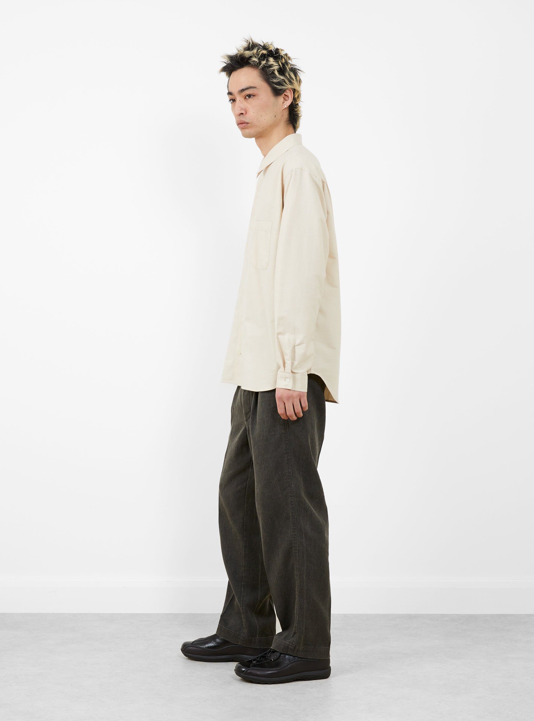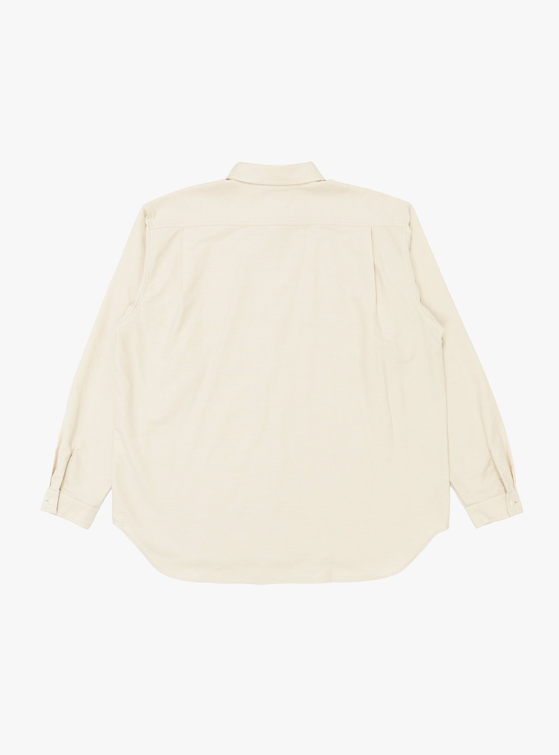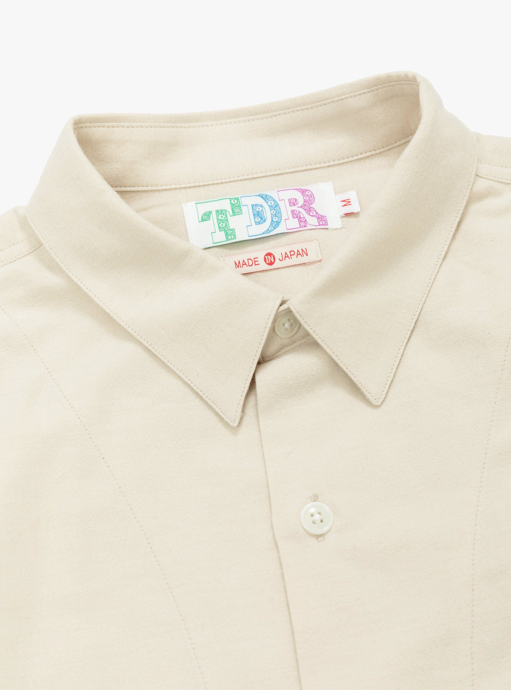 The Made in Japan Grande Shirt from TDR comes in White and is crafted from a 1950's reproduction Japanese cotton and wool brushed flannel. Cut to a relaxed fit, it features an edge-stitched collar, a Y-shaped front placket, off-white corozo nut button closure, and a single chest pocket. A pleated rear yoke completes the construction.