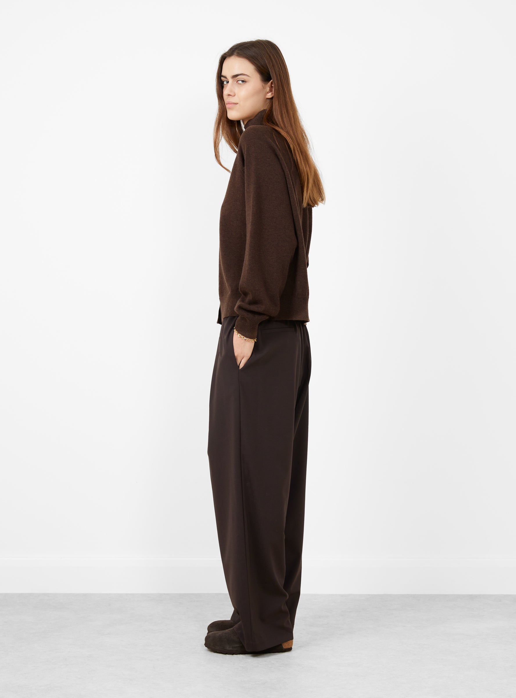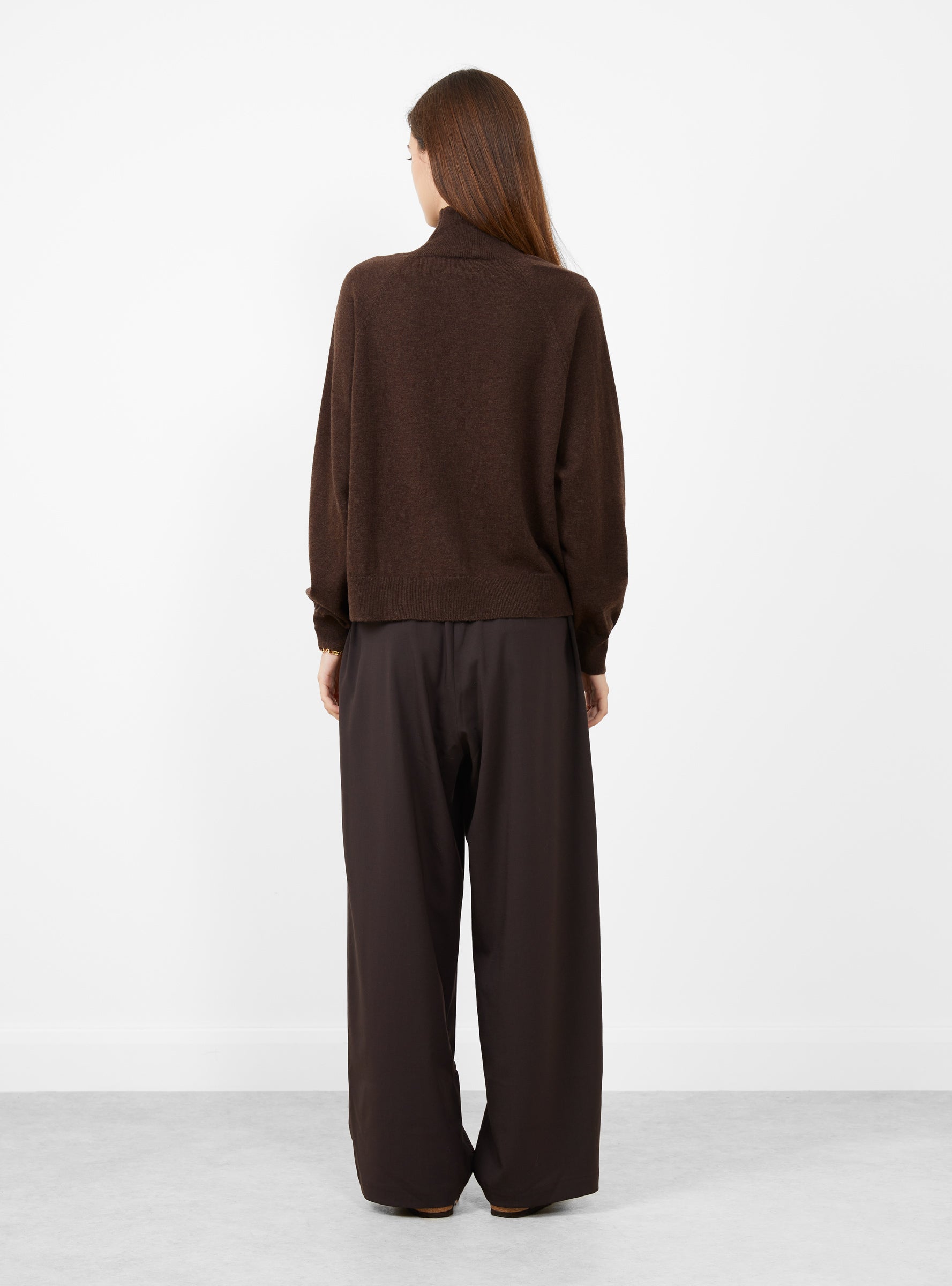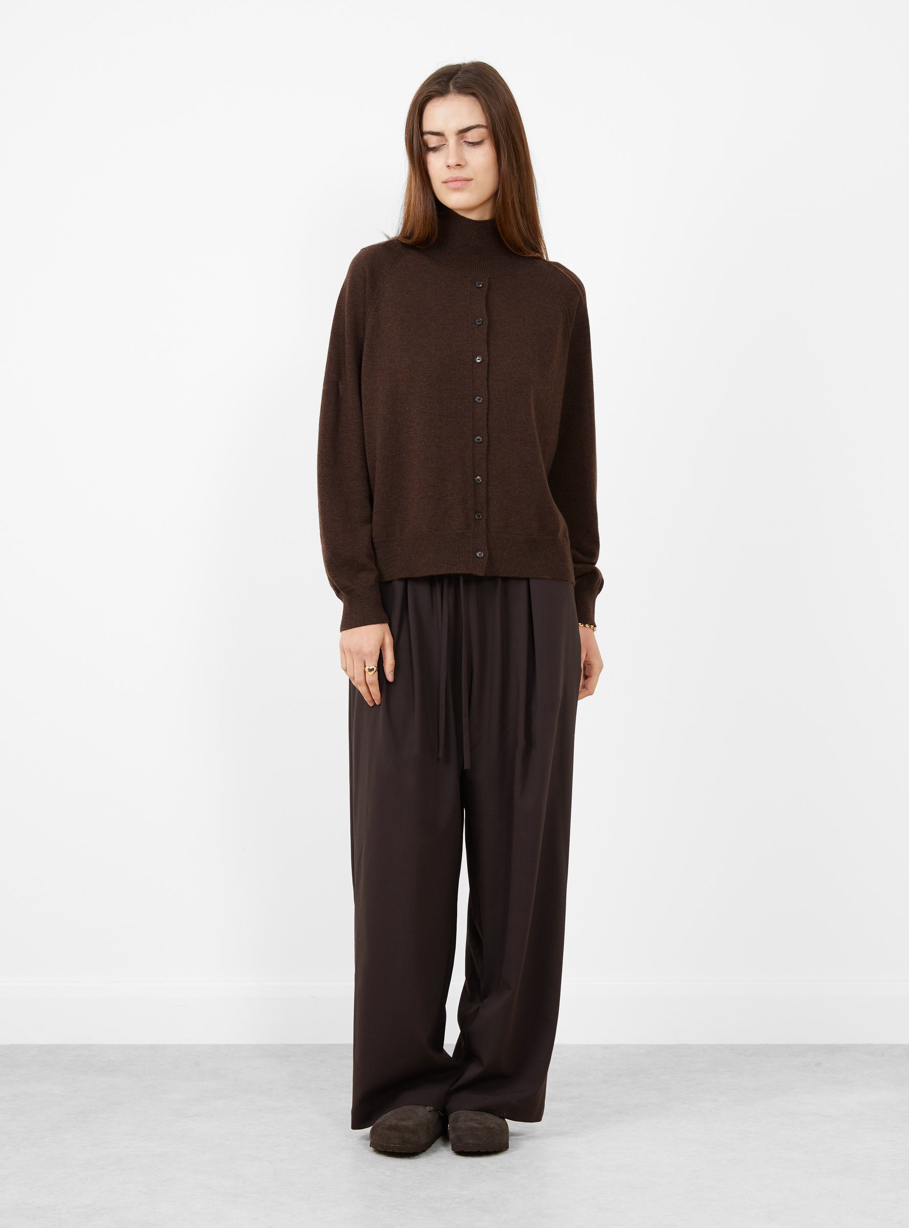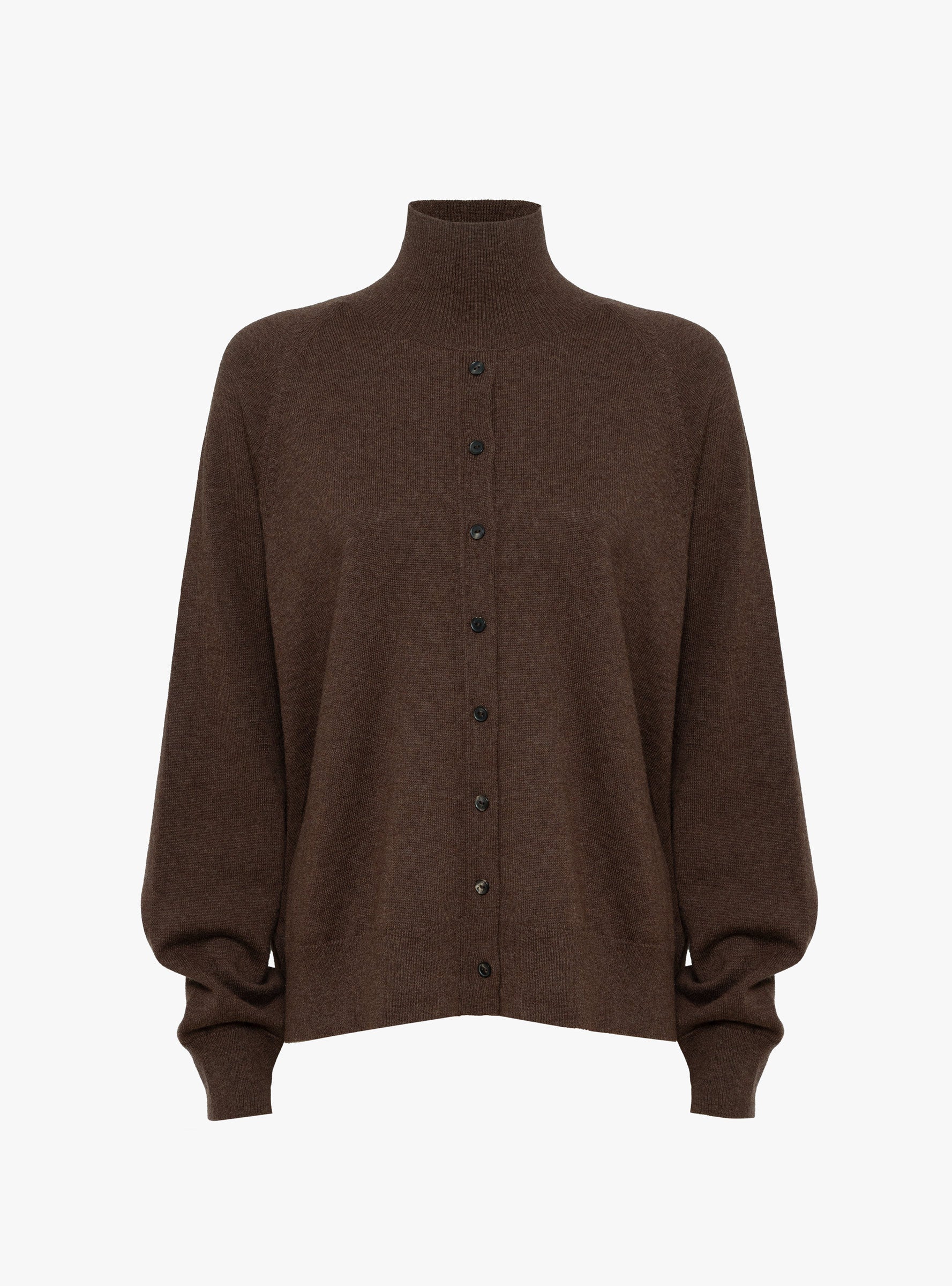 The Merino Wool Buttoned Sweater from Cordera comes in Espresso and is crafted in Spain. This oversized knit is made from lightweight extrafine merino wool and features a snug high neckline with small decorative buttons at the front. Finished with ribbed cuffs and hem, it offers both warmth and a clean, structured look, ideal for layering.