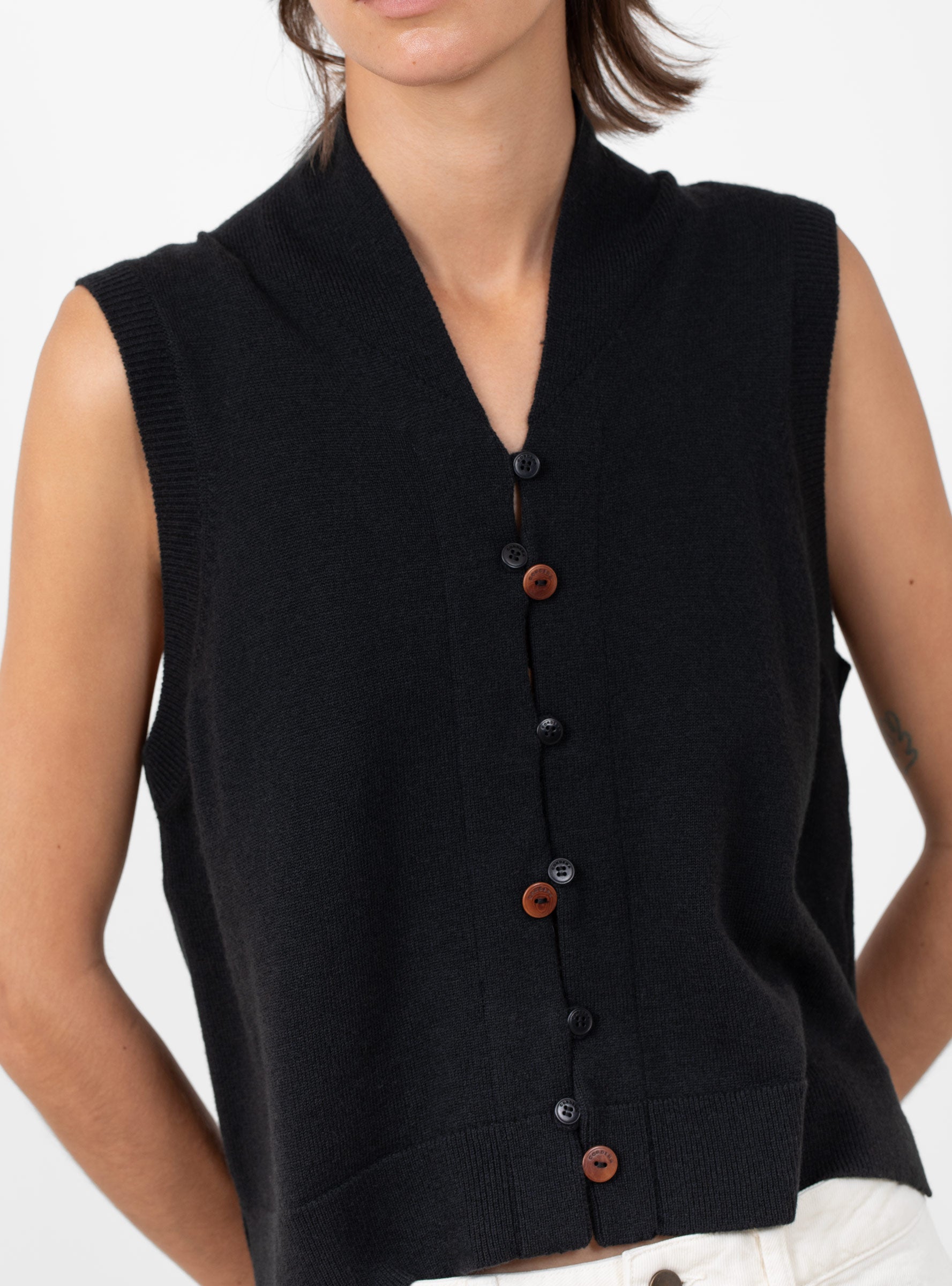 The Merino Wool Waistcoat from Cordera arrives in Black. Made from 100% merino wool, this waistcoat features a cropped, boxy fit with wide armholes and subtle side openings. It is designed with an irregular arrangement of buttons for a playful touch, and a V-neckline that rises at the back.