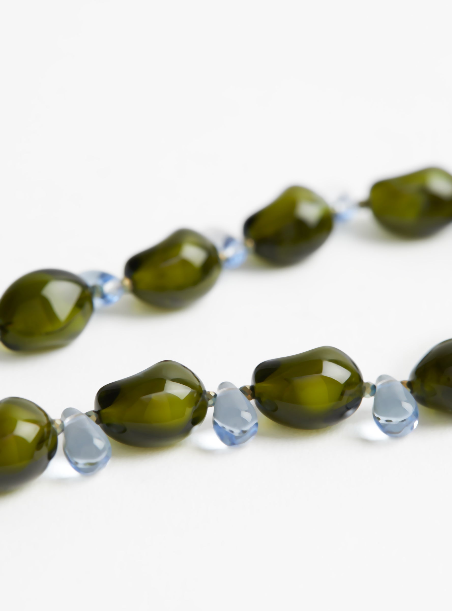 The Mini Glass Beads Necklace comes in Olive Green from AGLAGLA and is handmade in Switzerland. This necklace features green and blue glass beads combined with pyrite accents for subtle detail, finished with a stainless steel clasp.