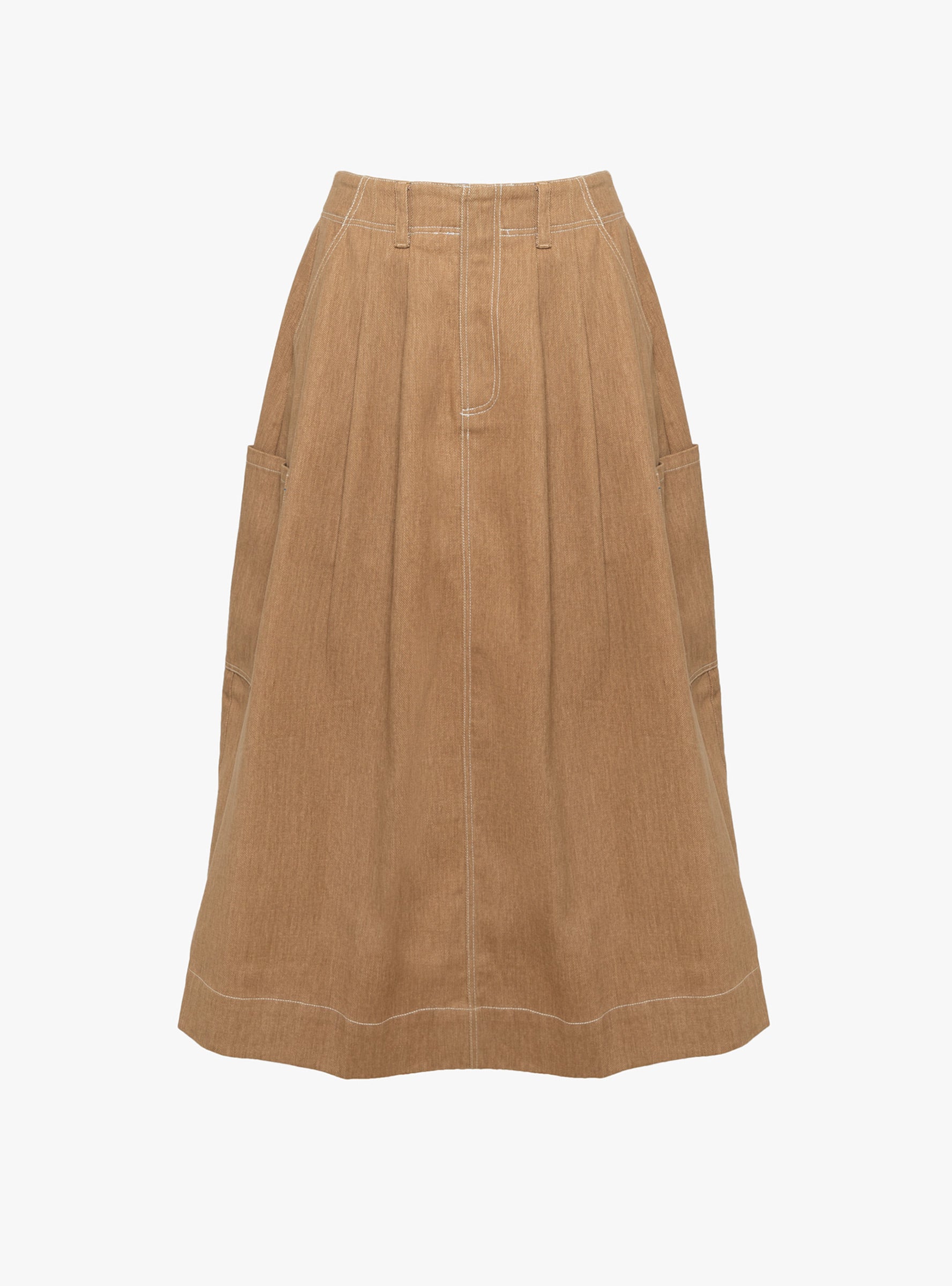 The Minty Skirt comes in Toffee from Sideline and is cut from cotton denim. Designed in a relaxed midi silhouette, it features front pleats and a zip fastening with hook and bar closure. Slant front pockets, flat side patch pockets and patch back pockets add utility, while an elasticated section at the back waist allows for a flexible fit.