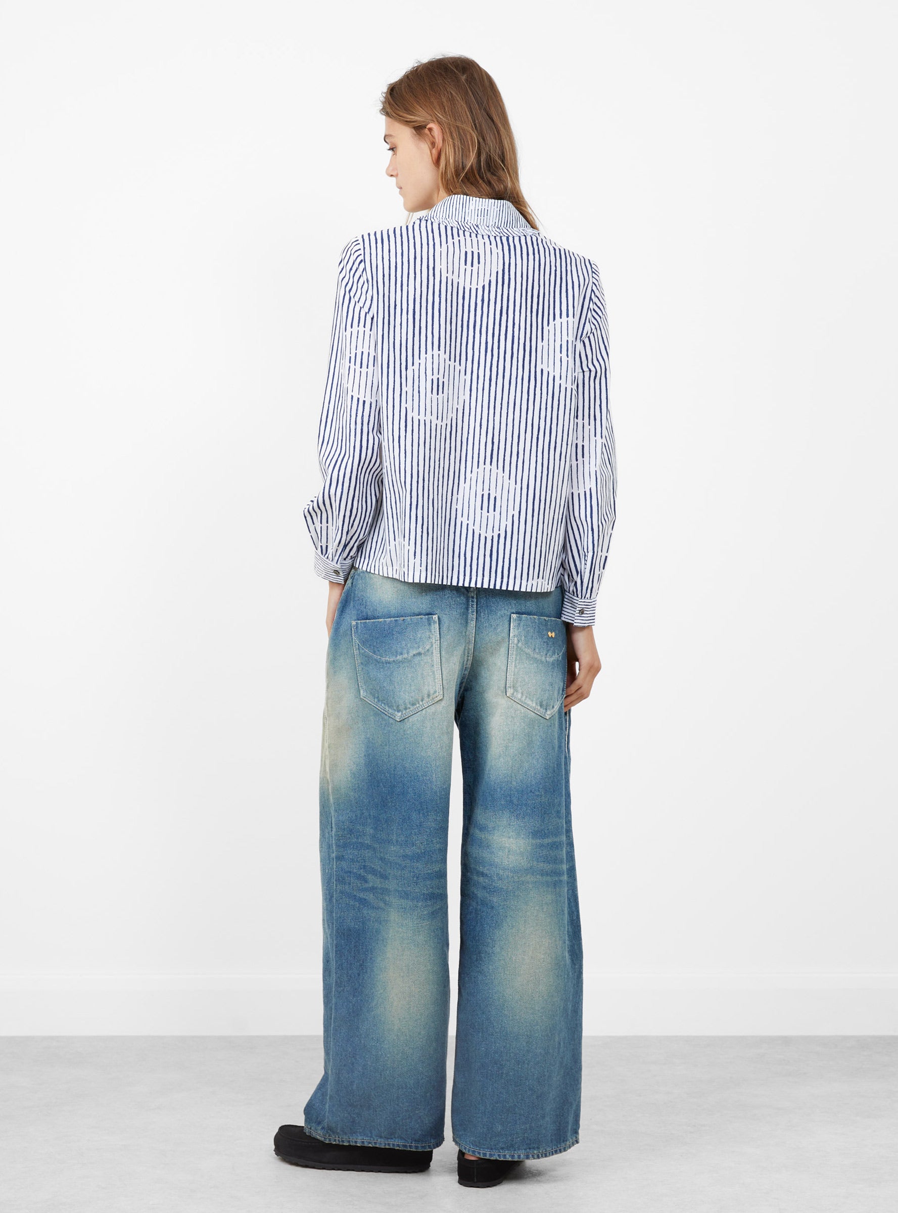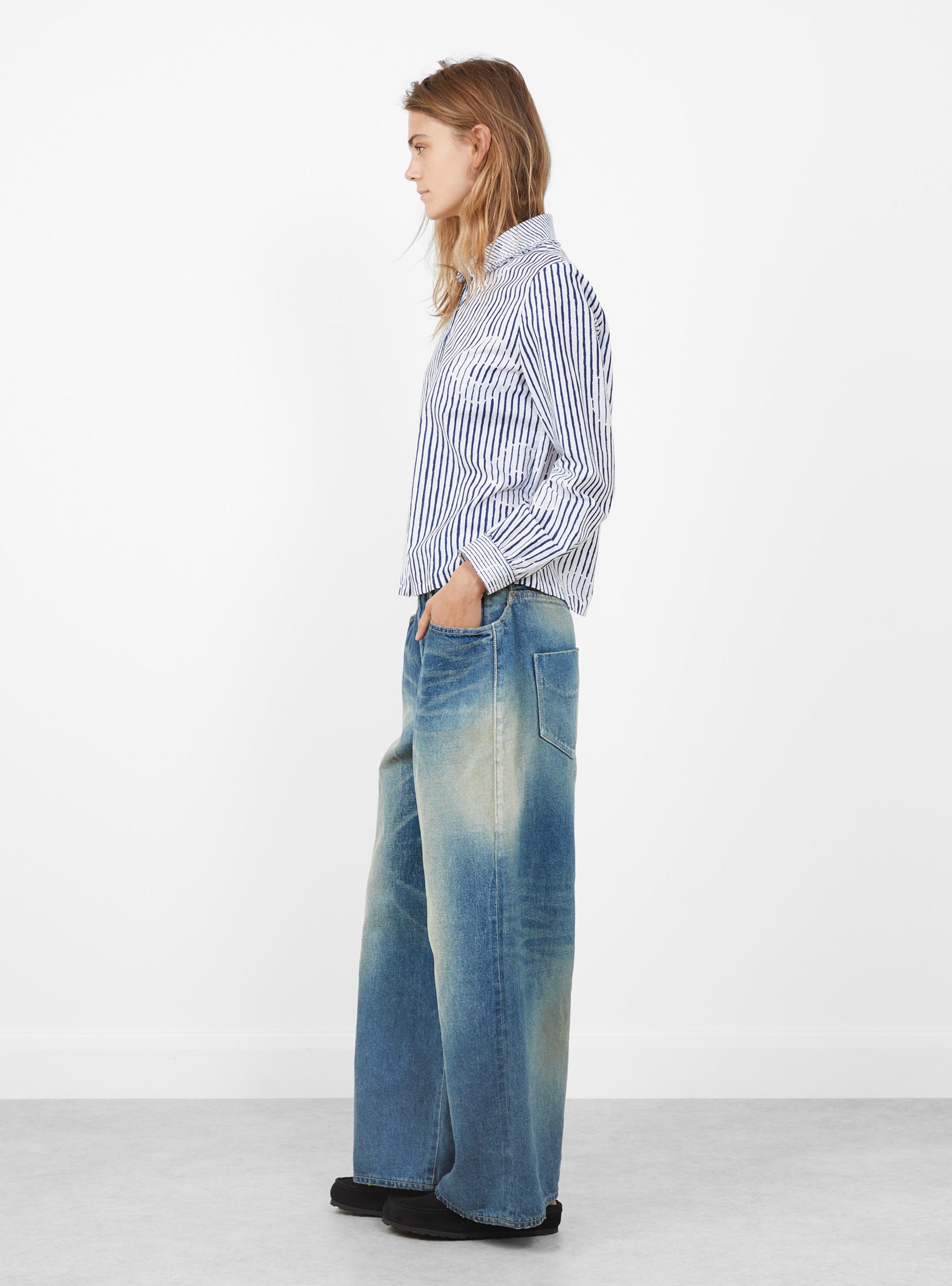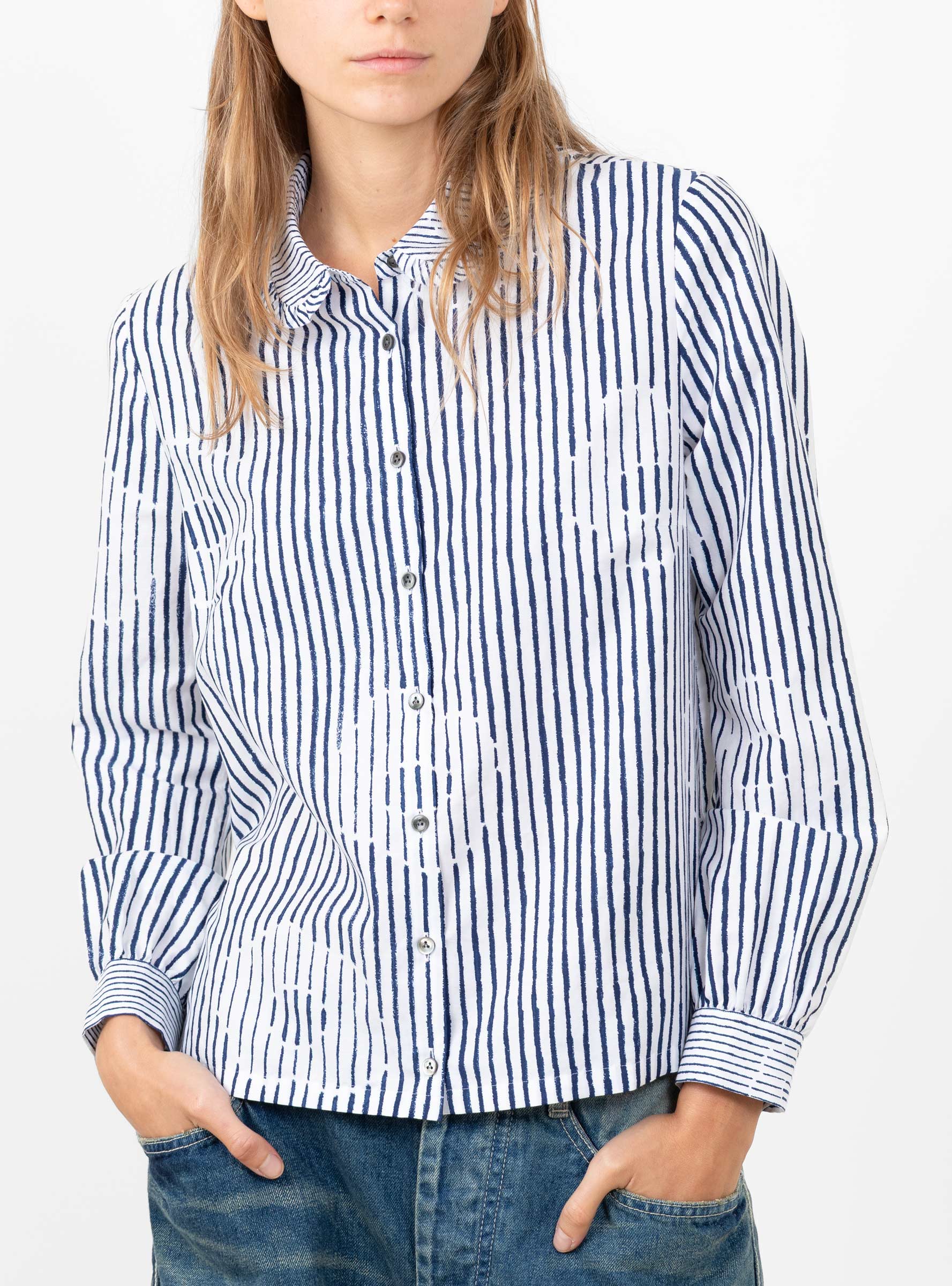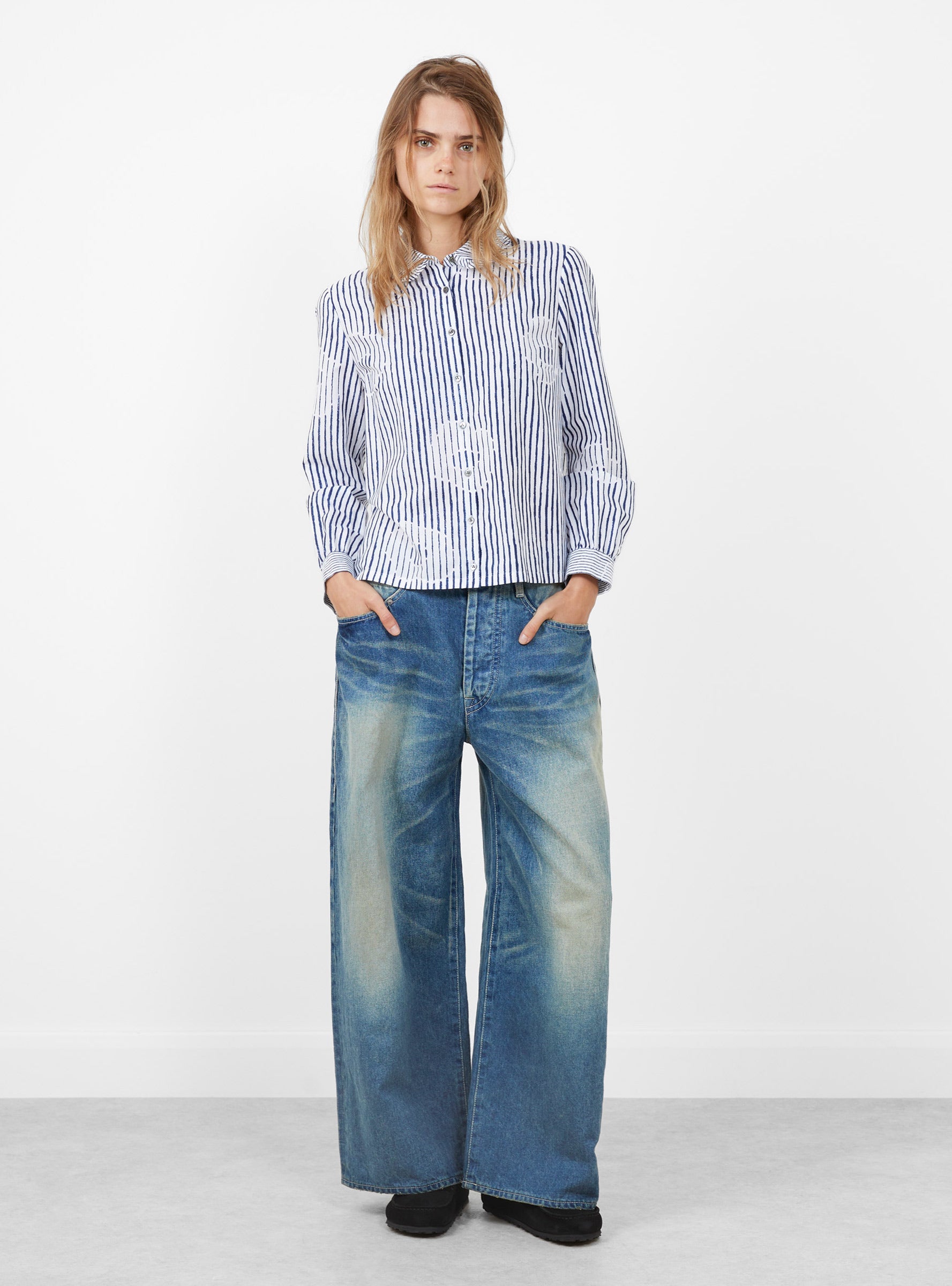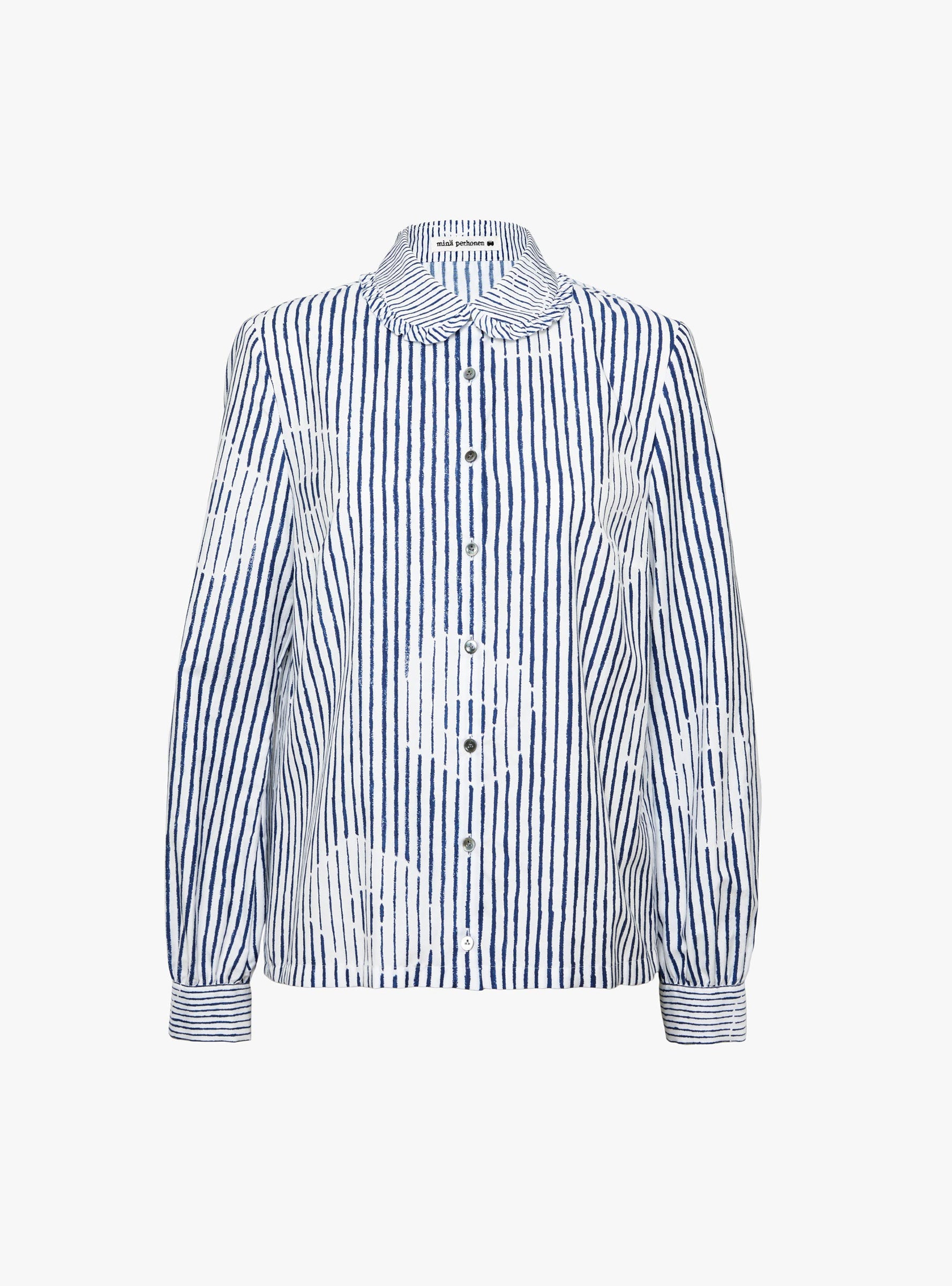 The Misty Flower Shirt from Minä Perhonen arrives in White, crafted in Japan from a silk and cotton blend. The "Misty Flower" print layers soft floral shapes over a striped base, with broken lines creating an irregular rhythm across the fabric. Designed in a regular fit, the blouse is finished with a delicate frill around the collar, enhancing its light and supple texture.