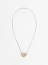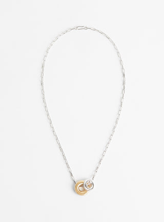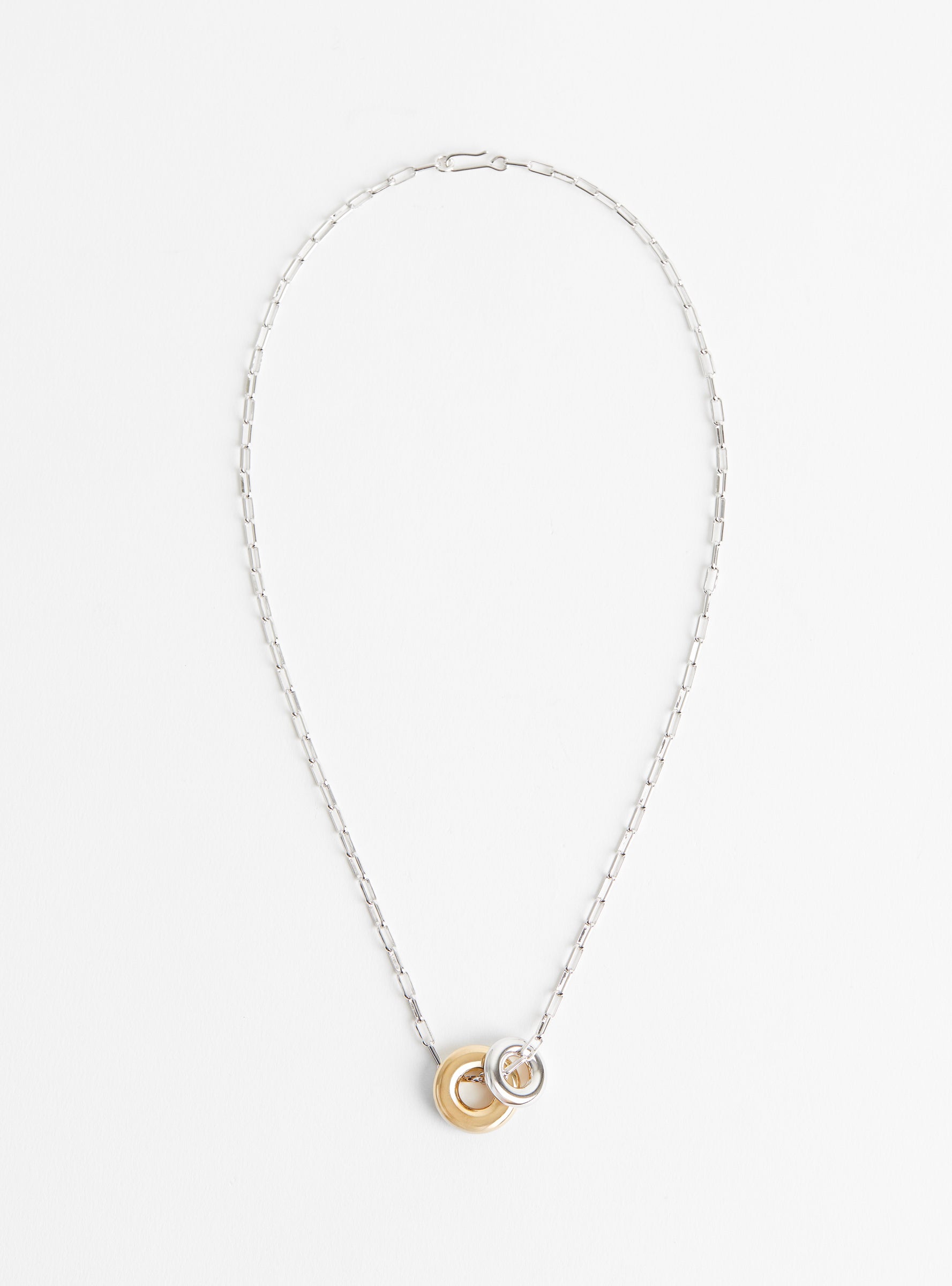 The Moneta necklace by Laura Lombardi is crafted in the USA from 14k gold and rhodium plated brass with oval links. It secures with a hook closure and features two layered circular pendants in gold and silver.