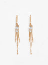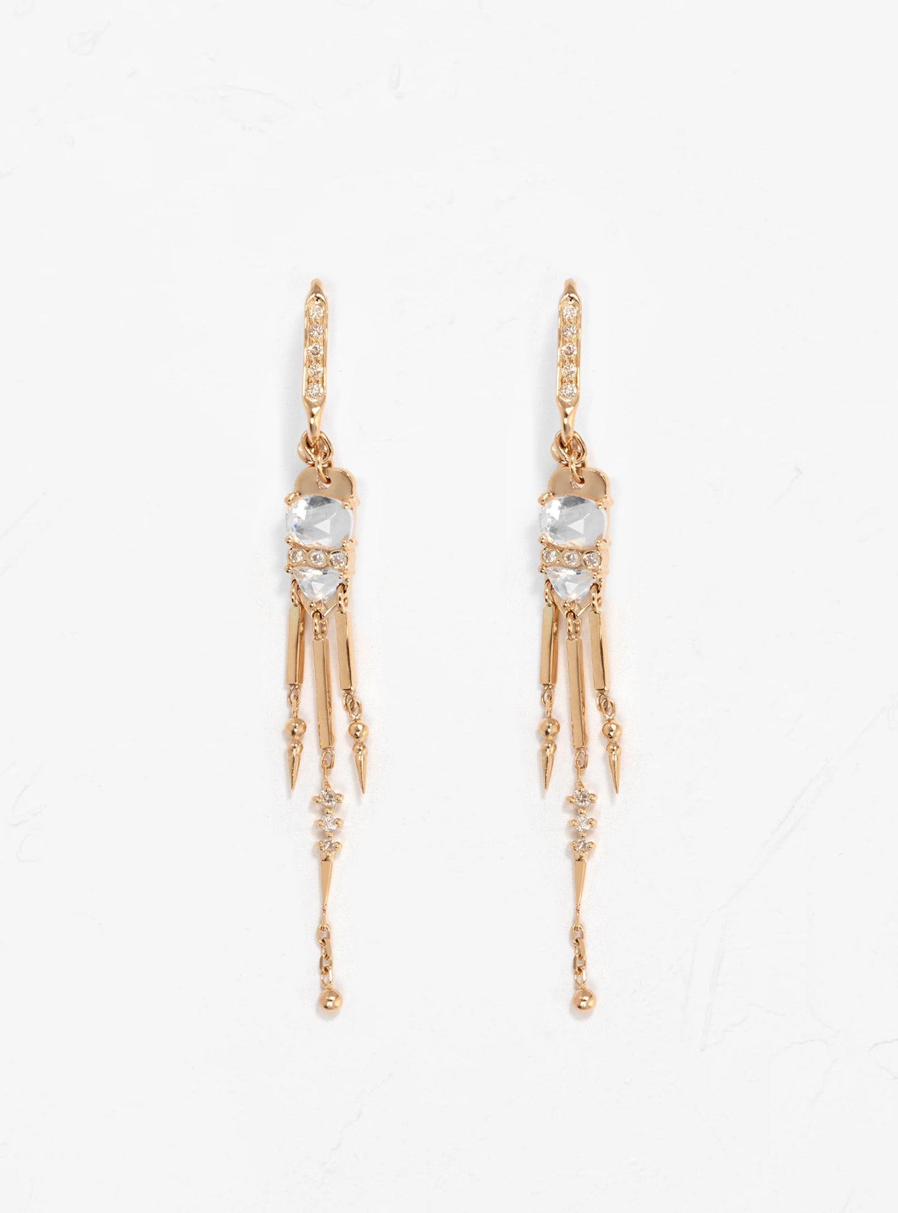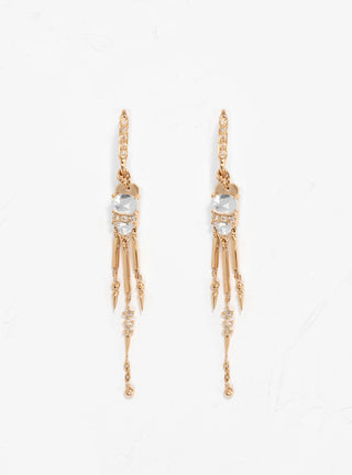 Inspired by her experiences travelling between India, France and Belgium, jewellery designer Celine Daoust’s pieces are a fusion of ancestral craftsmanship and cultural references. These delicately articulated Moonstone & Diamond earrings feature 2 large cut moonstones set in 14k yellow gold with drop pendants underneath reminiscent of protective talismans.
