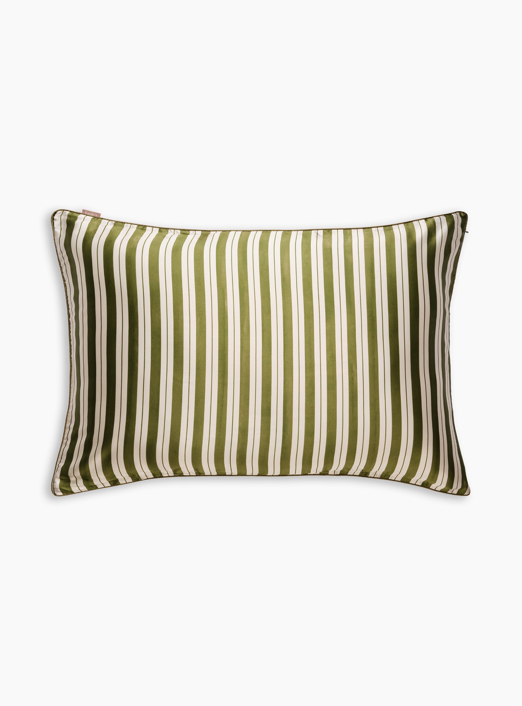 The Mulberry Silk Pillowcase from Emily's Pillow comes in Green Stripe and is made from 100% organic mulberry silk, 22 momme. Crafted from Grade 6A silk, it offers a soft, smooth surface that reduces friction on skin and hair, helping to maintain hydration, reduce frizz, and promote a comfortable, restorative sleep.