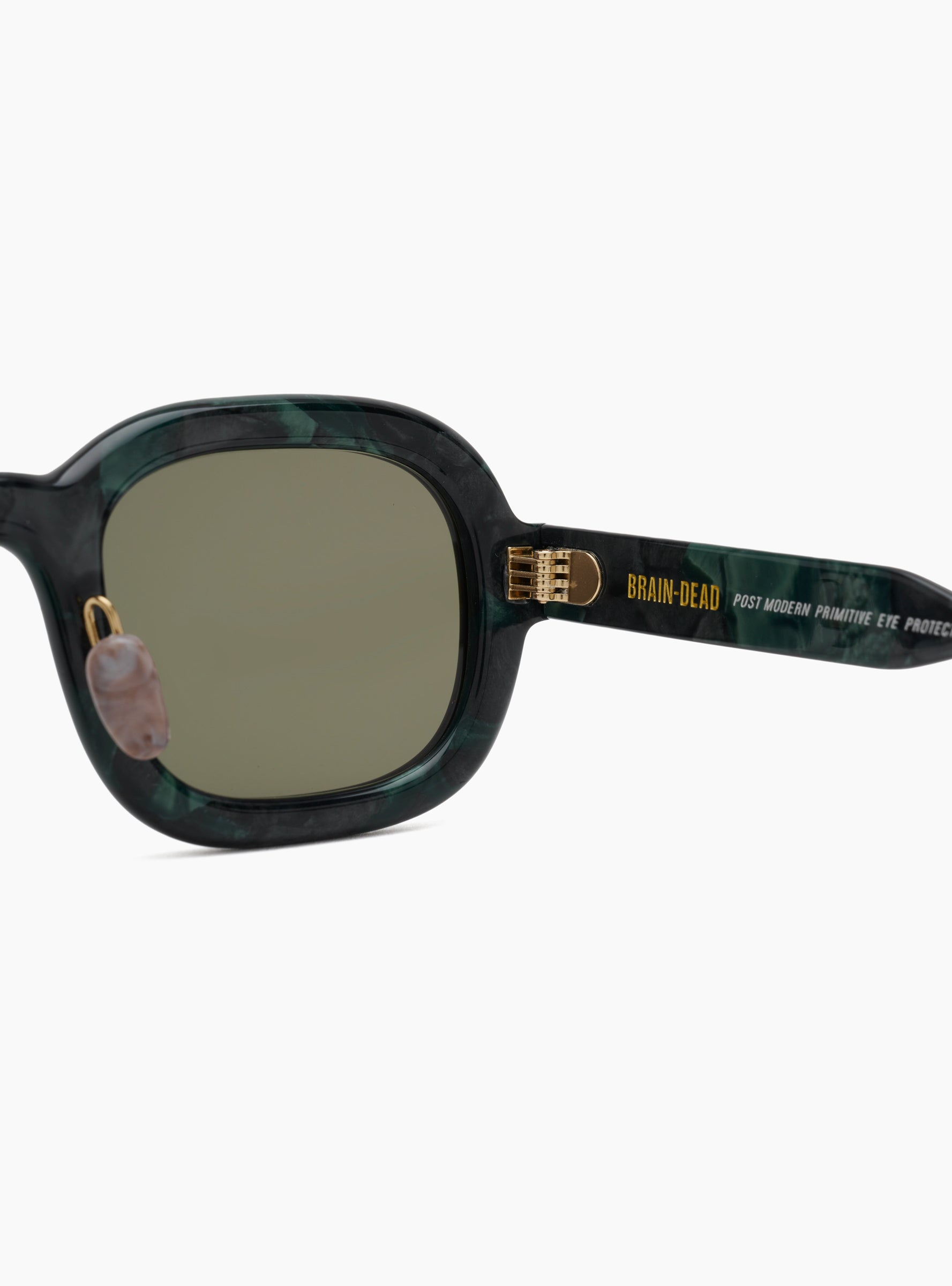 The Newman Sunglasses from Brain Dead's Post-Modern Primitive Eye Protection series arrive in a Green Pearl tortoiseshell. Handmade from cellulose acetate, the glasses also feature stainless steel cores for strength as well as flexibility for moulding to your head shape. The glasses are complete with optical nylon lenses with 100% UV protection and a custom Brain Dead case and cloth.