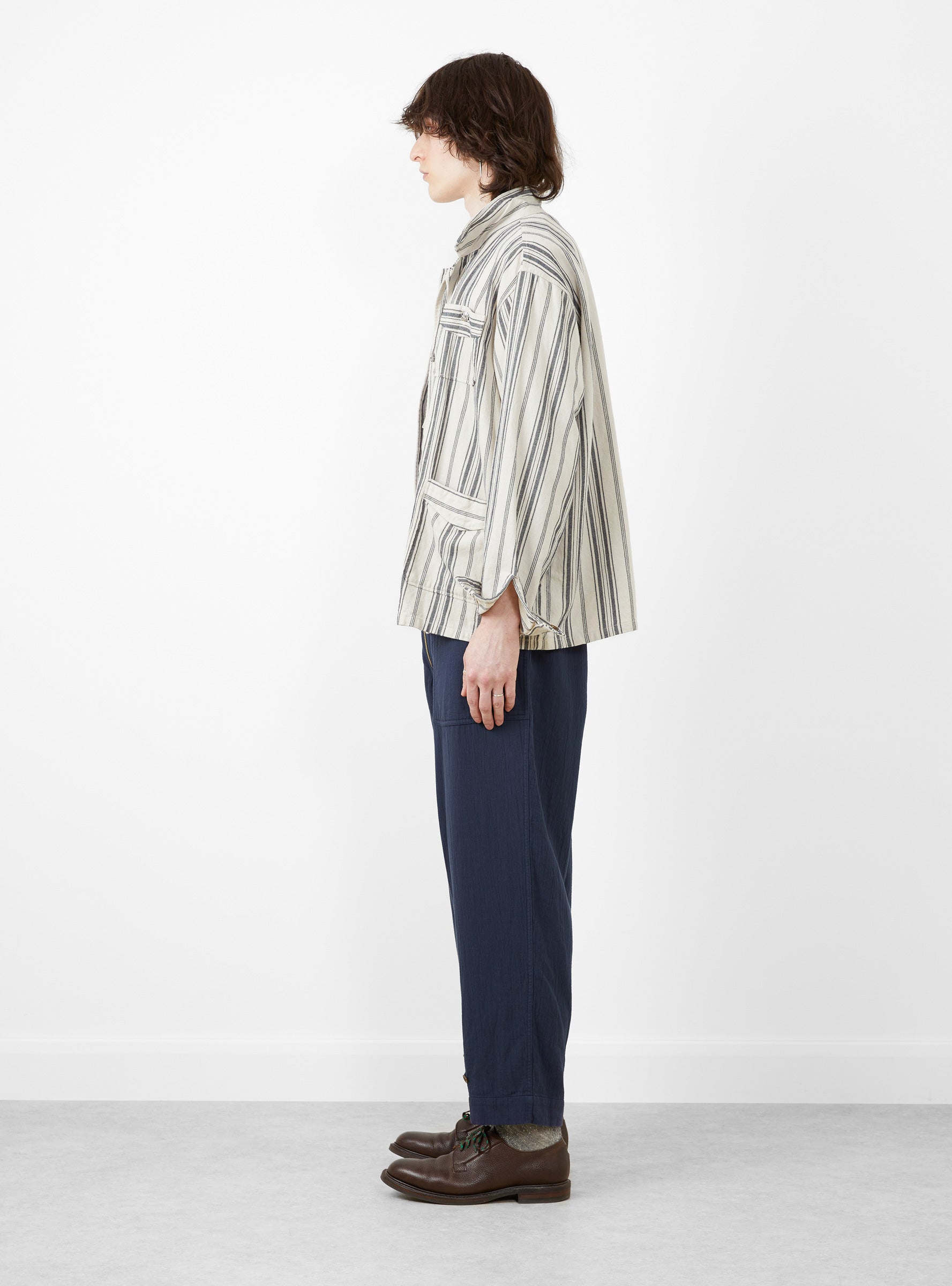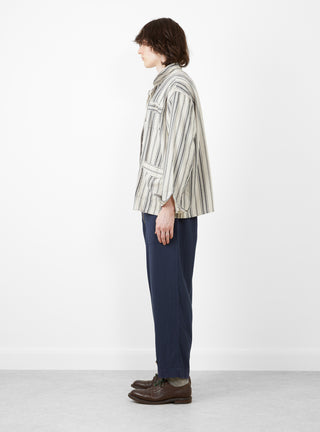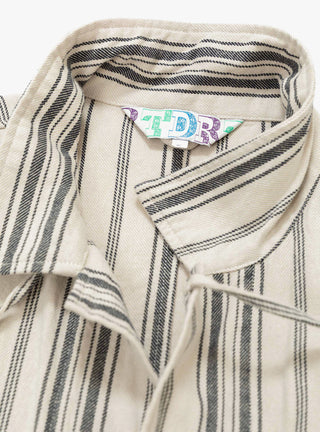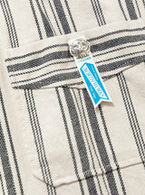 The Noragi Jacket from TDR arrives in an ecru and black stripe. The jacket is constructed from a Japanese cotton and linen blend and falls to a relaxed fit. Inspired by vintage Japanese workwear, the jacket is closed with a unique four tie closure system. Patch pockets at the chest and the hip finish the jacket, with the chest pocket adorned with a NORTH WORKS silver skull.