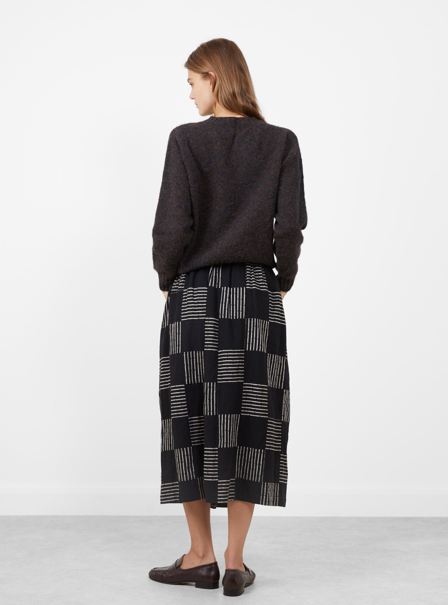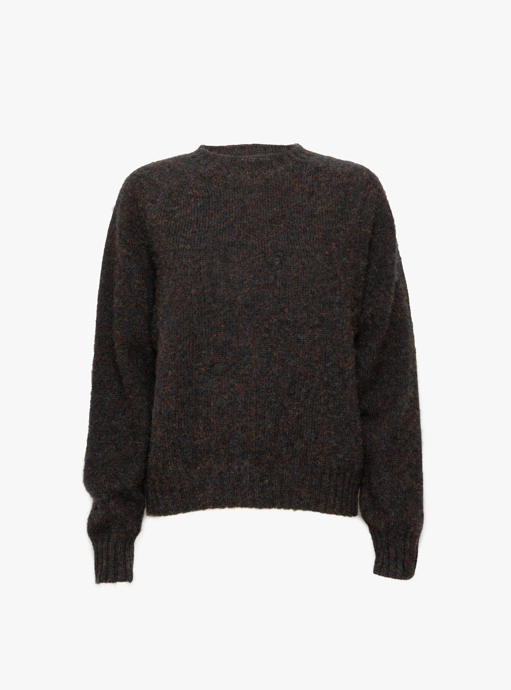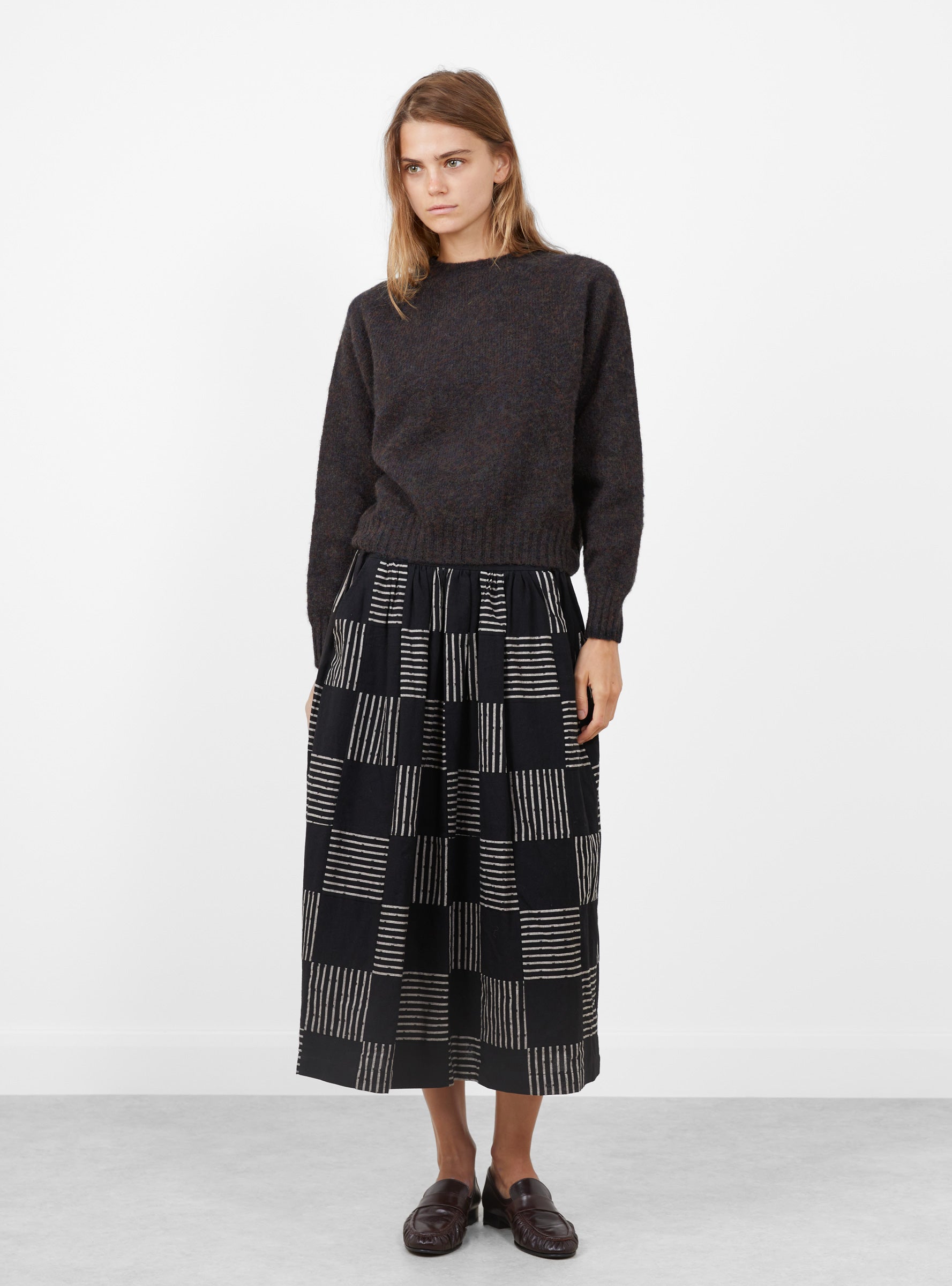The Nova Jumper in Black Marl from Sideline is crafted from 100% wool using traditional seamless knitting machines, ensuring no waste during production. The silhouette is slightly boxy and sits just below the waistband. The surface is brushed for a soft, cosy texture.