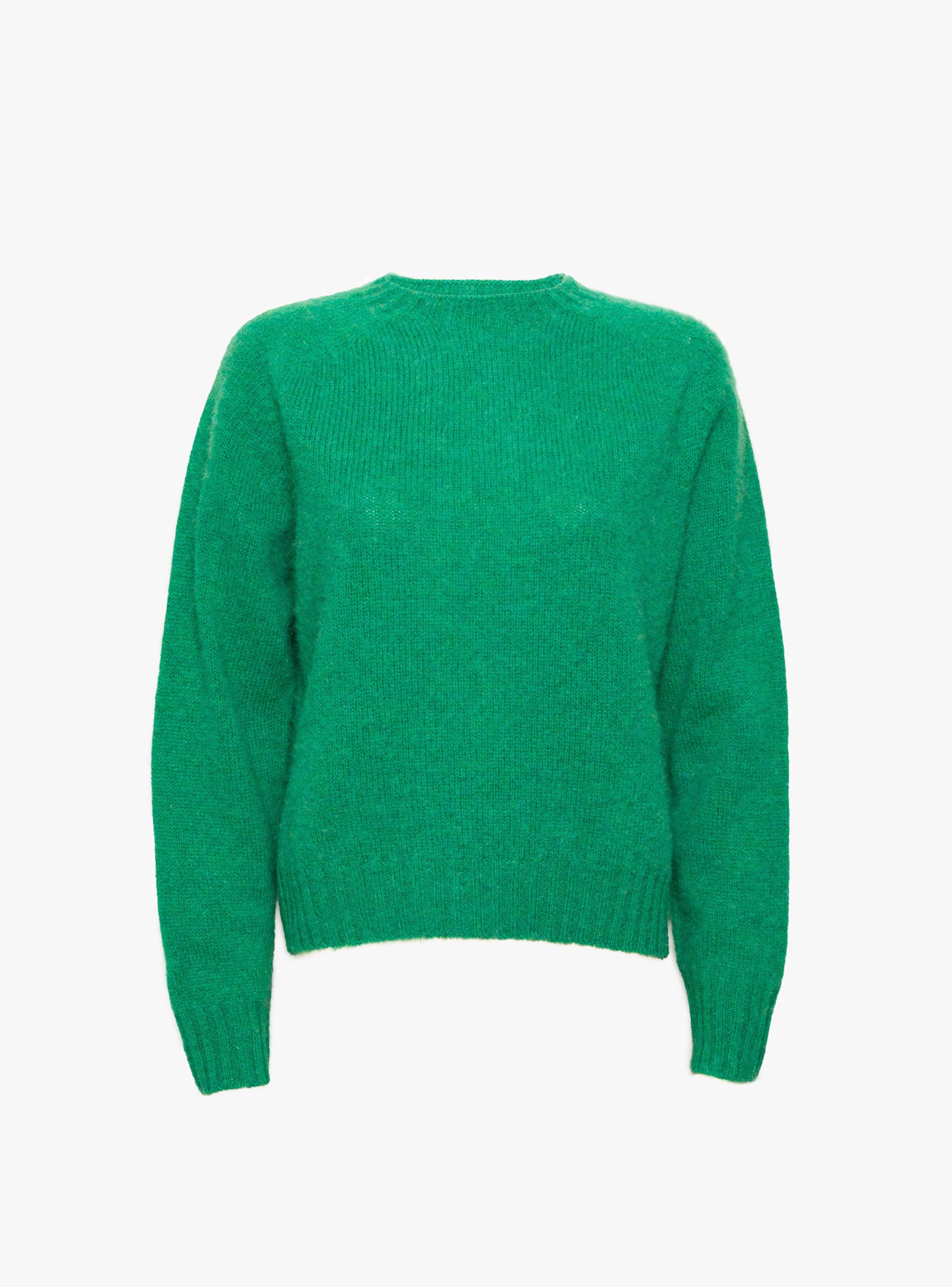 The Nova Jumper in Green from Sideline is crafted from 100% wool using traditional seamless knitting machines, ensuring no waste during production. The silhouette is slightly boxy and sits just below the waistband. The surface is brushed for a soft, cosy texture.
