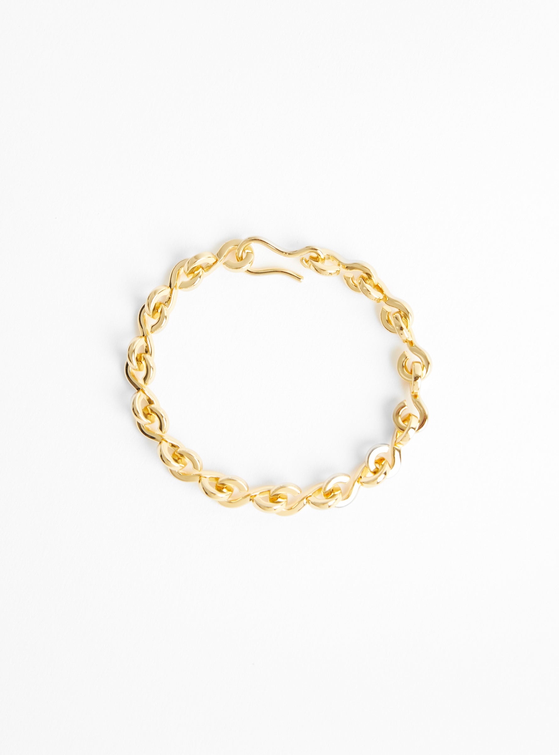 The Nuova Bracelet from Laura Lombardi comes in Gold. Inspired by padlock forms and ornamental chain references, the bracelet features interlocking cast hook links with square wire detail and a hook clasp.