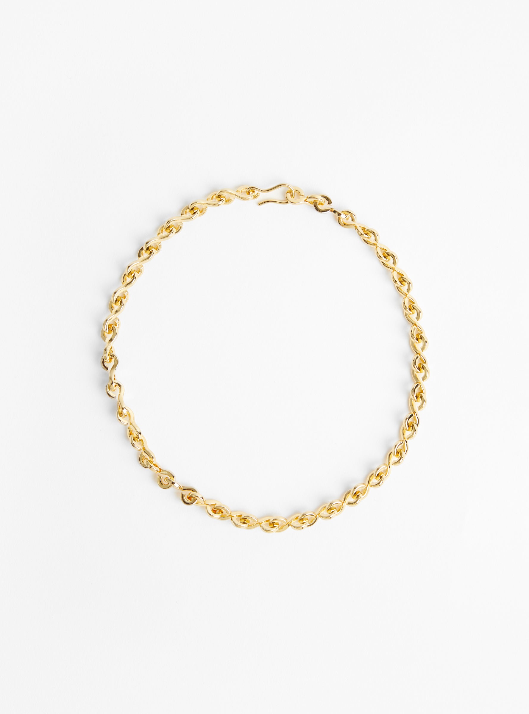 The Nuova Necklace from Laura Lombardi comes in Gold and is crafted from 14k gold-plated brass. Inspired by padlock forms and ornamental chain references, the design features interlocking cast hook links with square wire detail, creating a refined yet striking silhouette. Finished with a secure hook clasp, the 16-inch chain offers versatile wear for everyday styling.