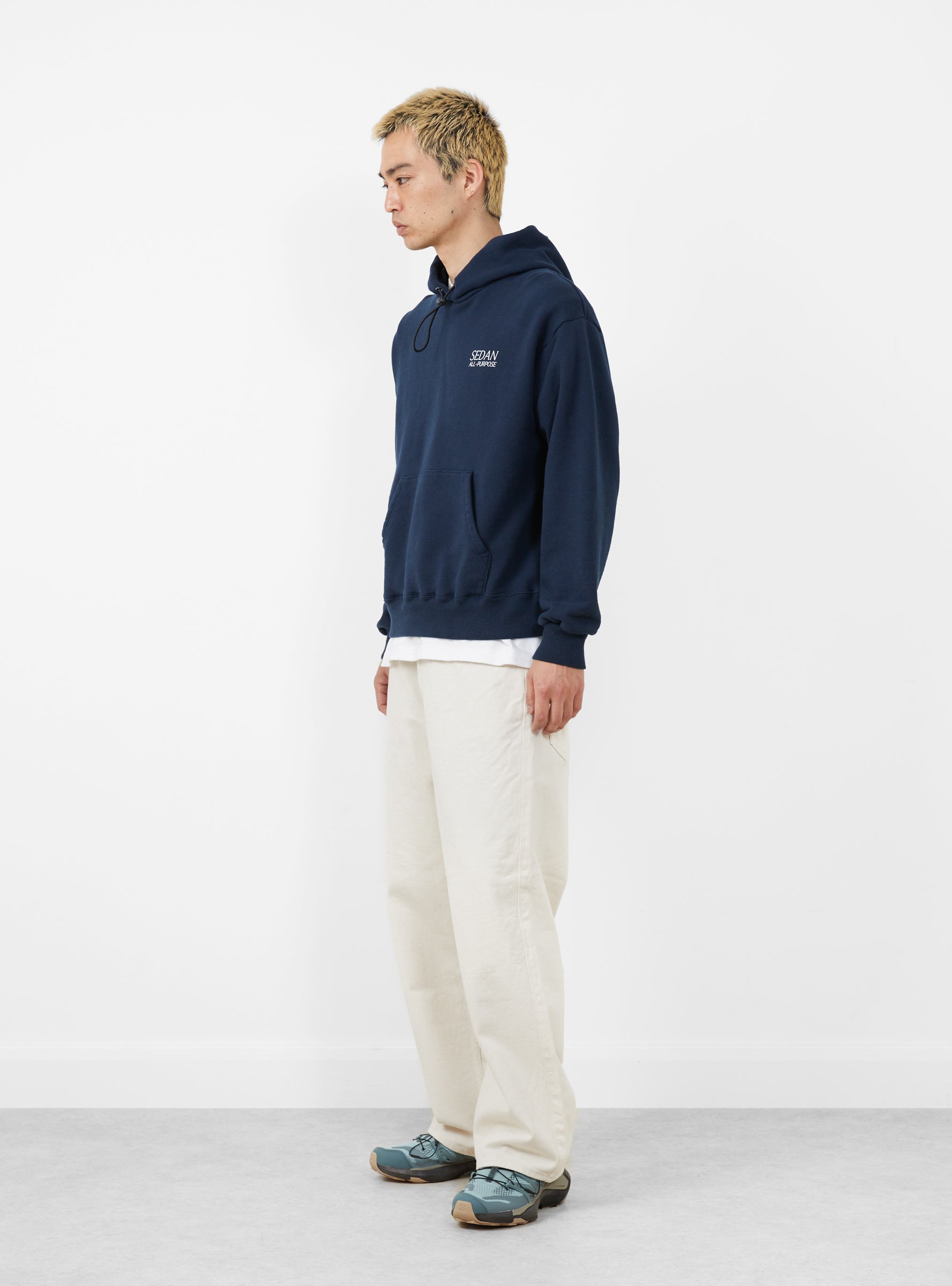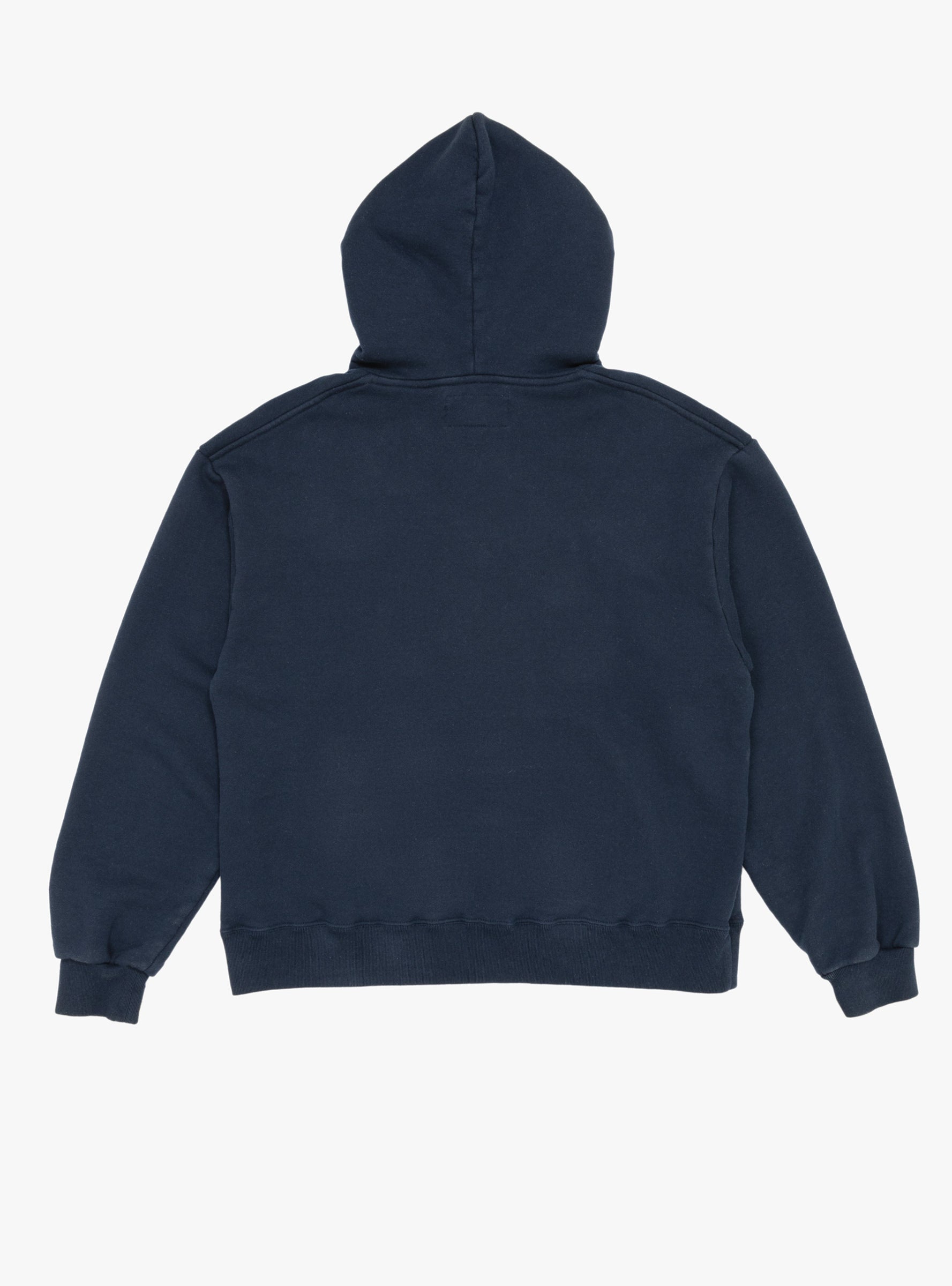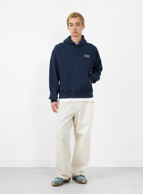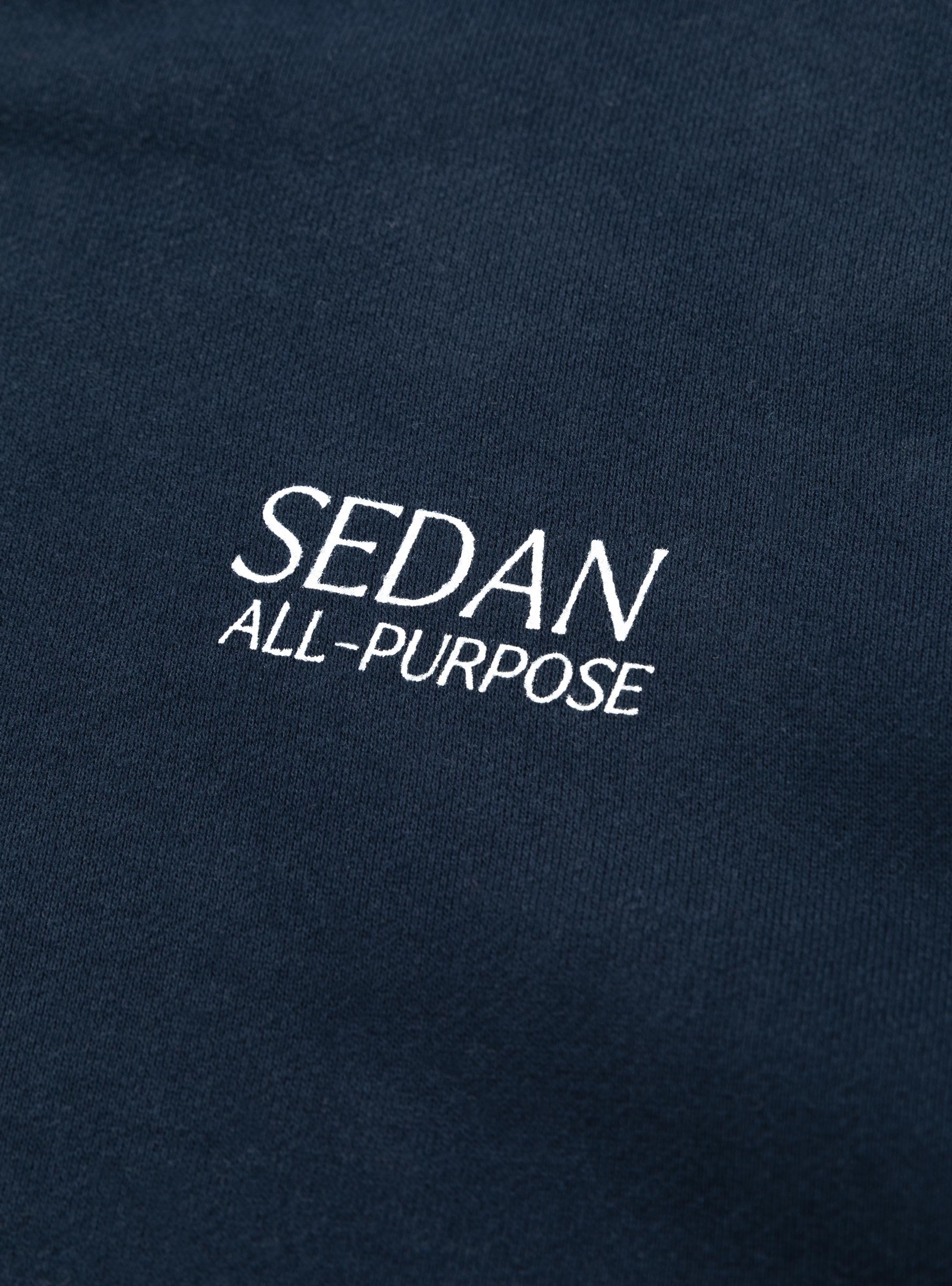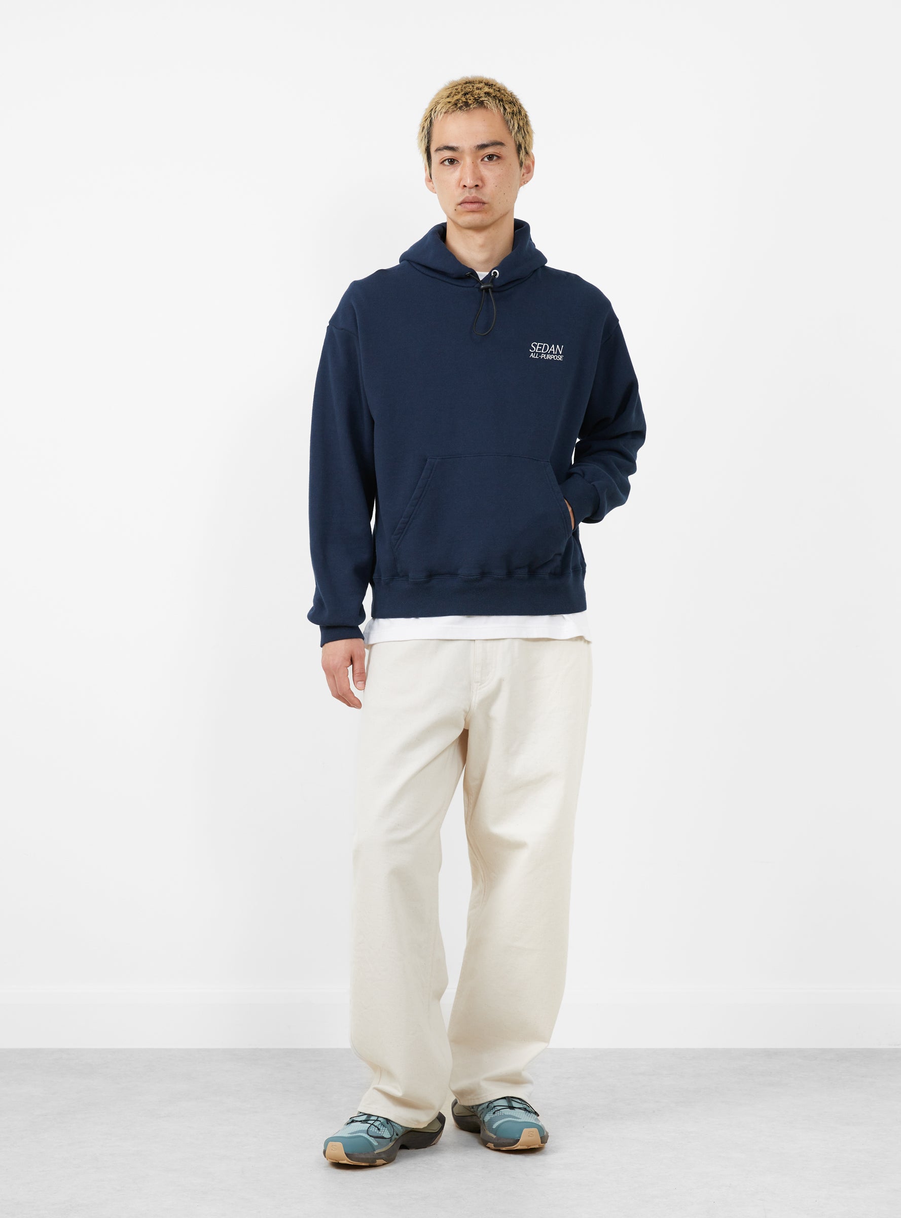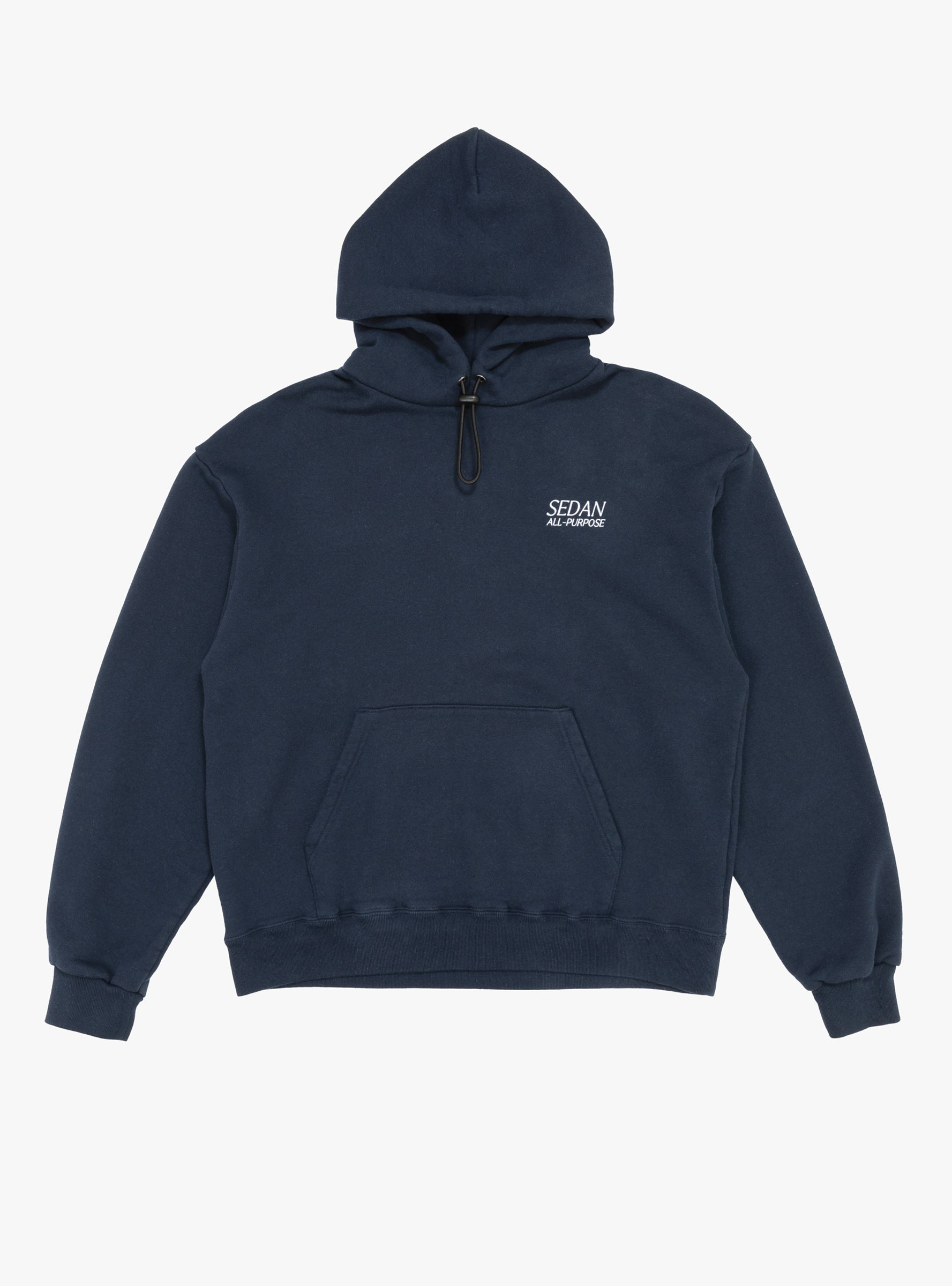 The OG Logo Elastic Cord Hoodie from Sedan All-Purpose is cut from a Navy coloured cotton and falls to a relaxed fit. A singular elastic cord at the hood serves as the drawstring, offering a functional aesthetic. A kangaroo pocket at the centre and an OG Sedan Logo is printed at the chest, with a plain back.
