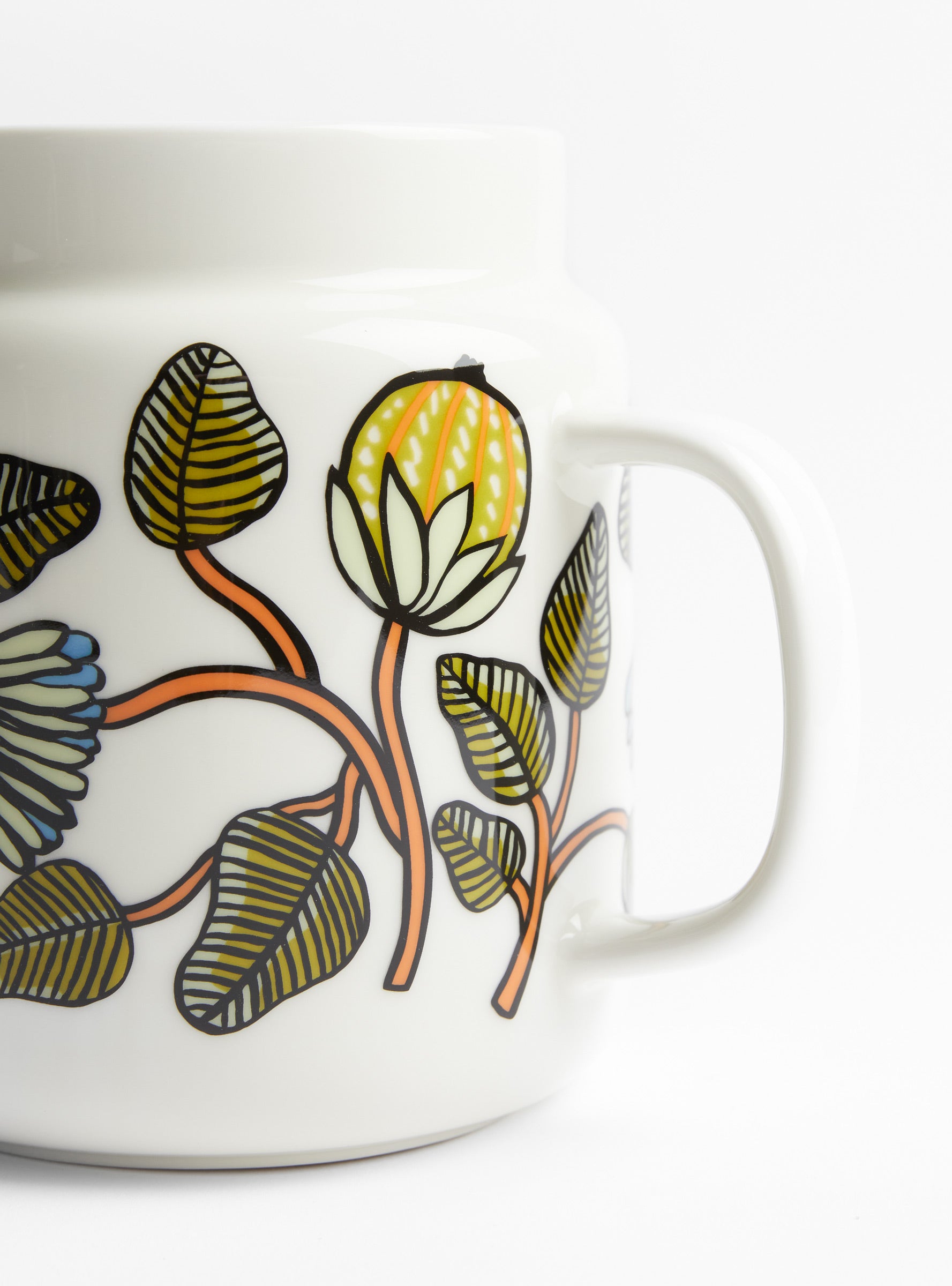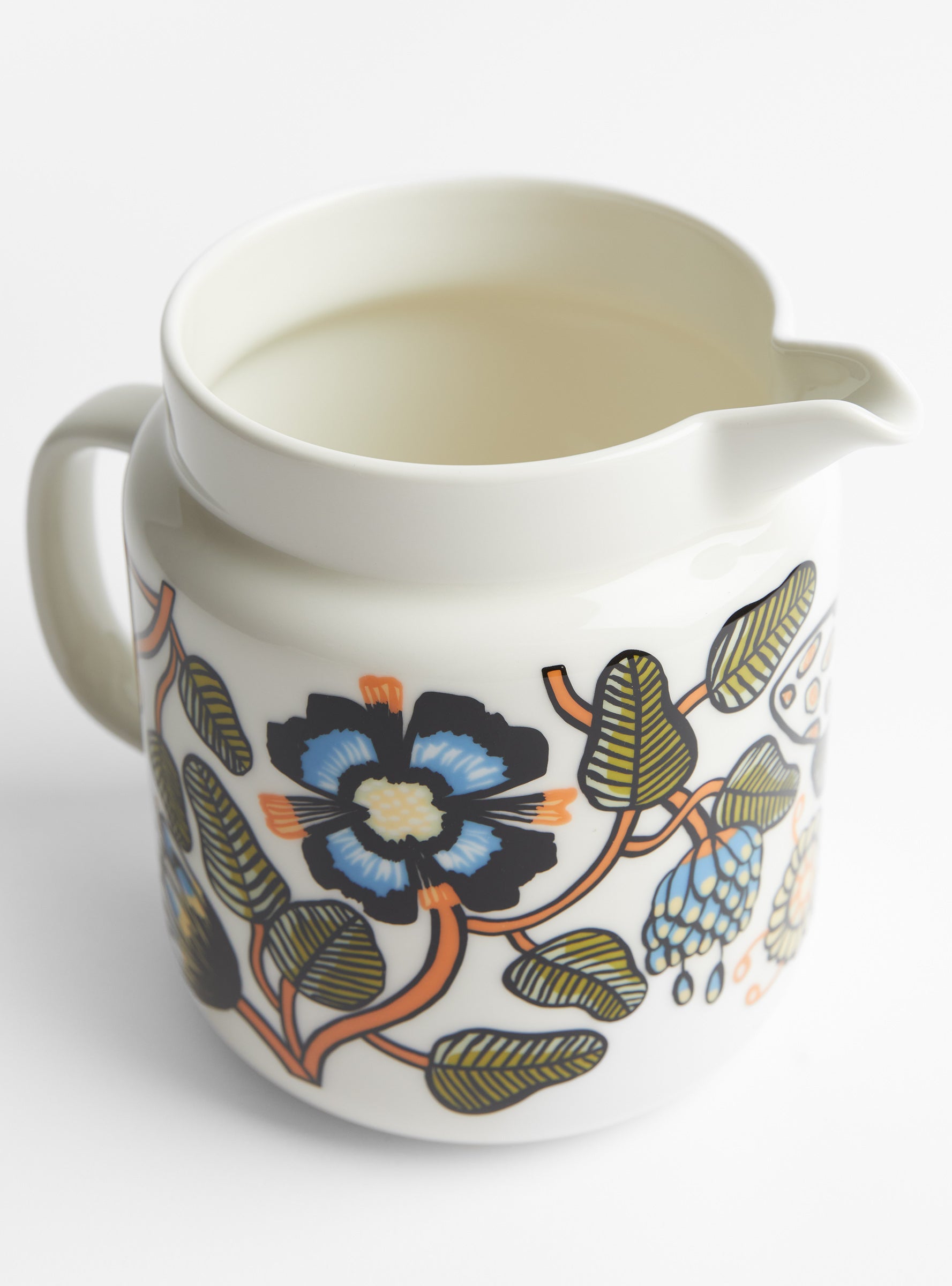 The Oiva Tiara Jug from Marimekko comes in a multi-coloured floral pattern and is made from white stoneware. Designed by Sami Ruotsalainen, this jug features a nature-inspired floral decal by Erja Hirvi. It is dishwasher safe and ideal for serving beverages or as a decorative piece.