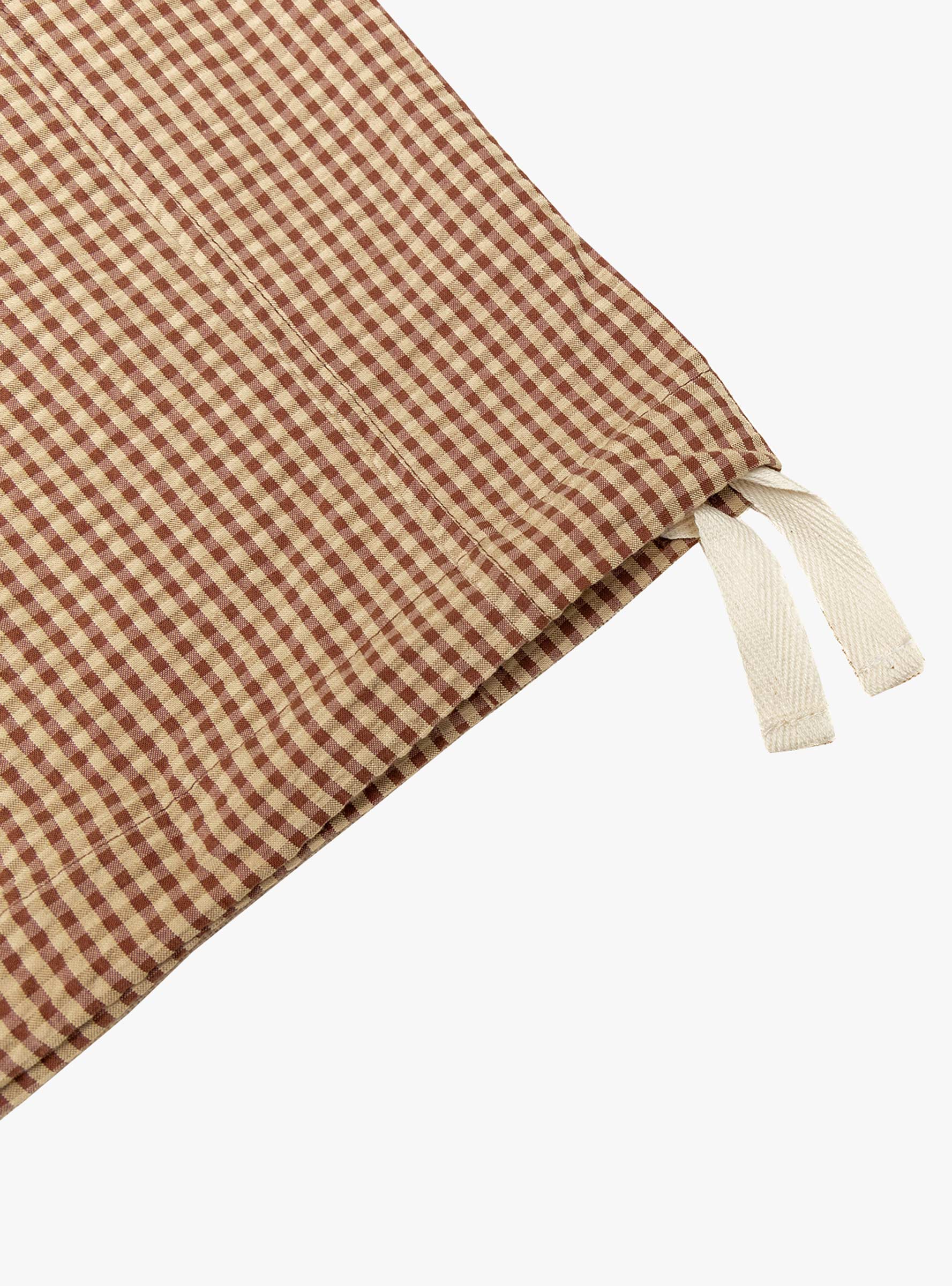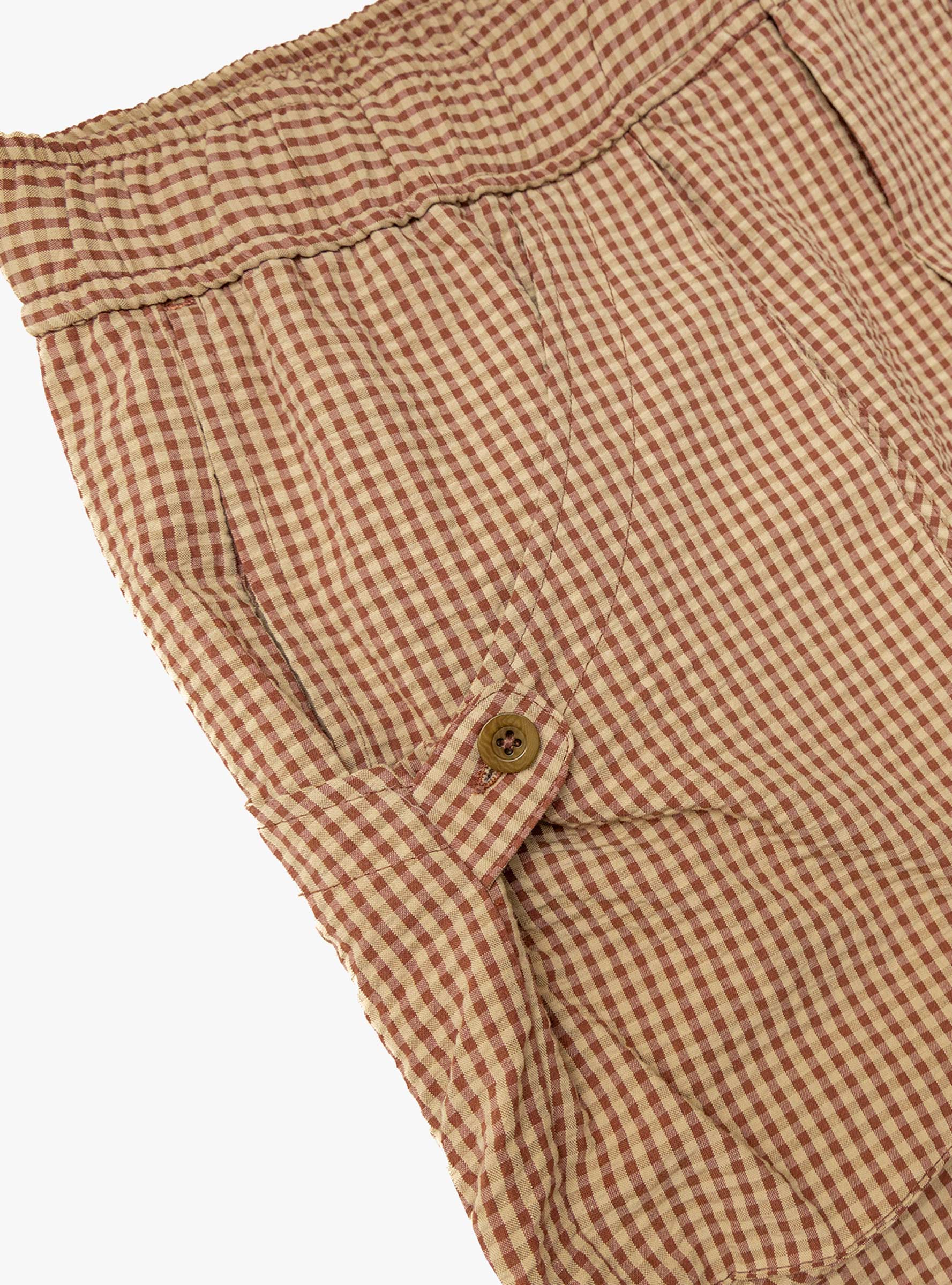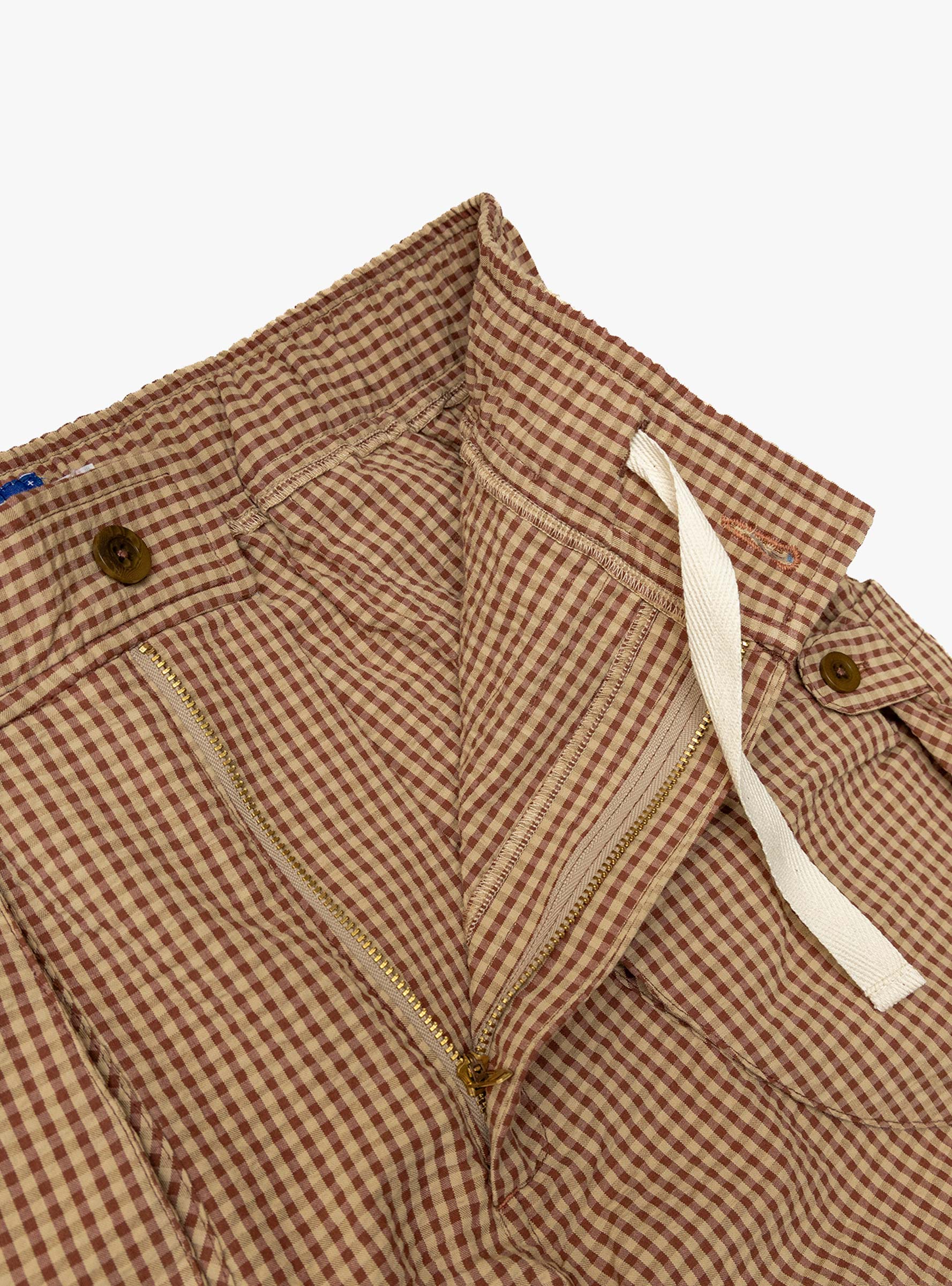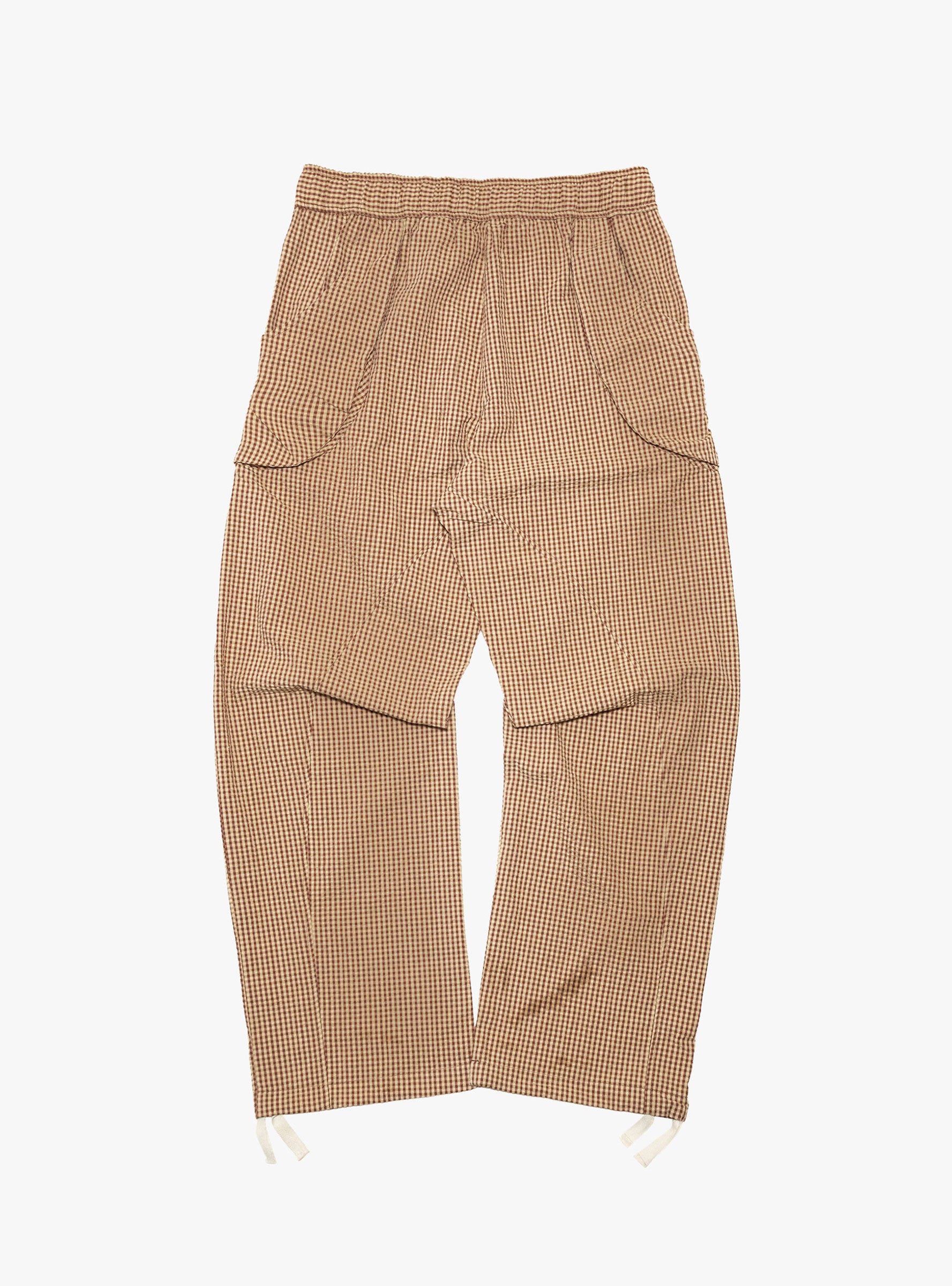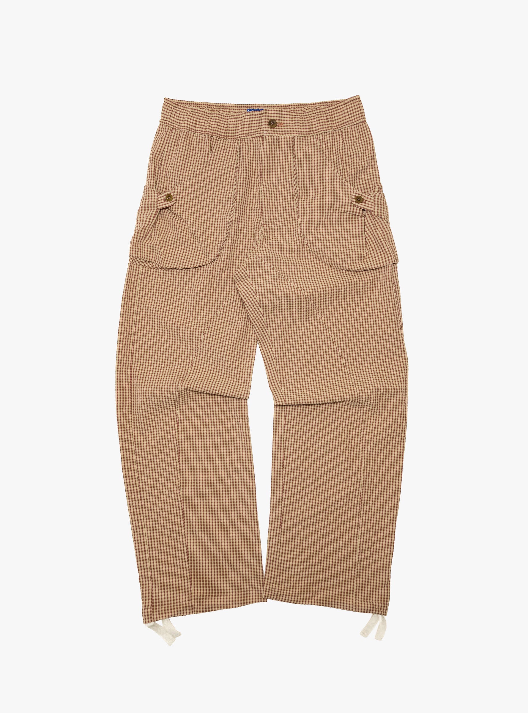 The Osage Pant from Paratodo comes in Red and Khaki Seersucker and is made in the USA from 8 oz. Japanese cotton seersucker. The pants feature a relaxed, straight-leg silhouette with a drawstring waist and zipper fly. Adjustable wrap-around cargo pockets sit on the leg, while concealed side hand pockets provide additional storage. Pant-leg drawstrings allow for a custom fit at the hem, and front seams add structure to the design.
