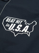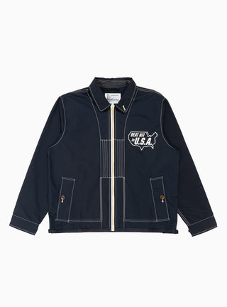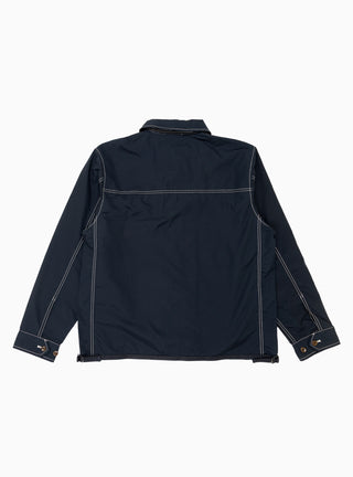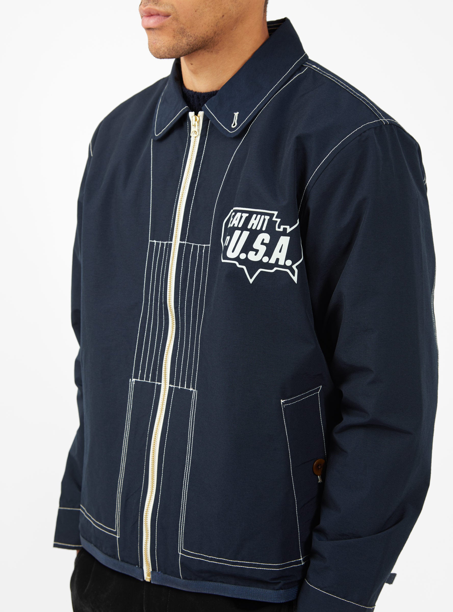 This midnight-blue Overnik jacket from Garbstore's AW23 offering is inspired by vintage track styles, updated with a printed chest graphic as a nod to the collection’s beatnik influence. Made from cotton-blend sailing cloth, famed for its lightweight and water-repellent properties, it’s cut to a boxy silhouette with contrast topstitching and adjustable webbing straps at the hem.