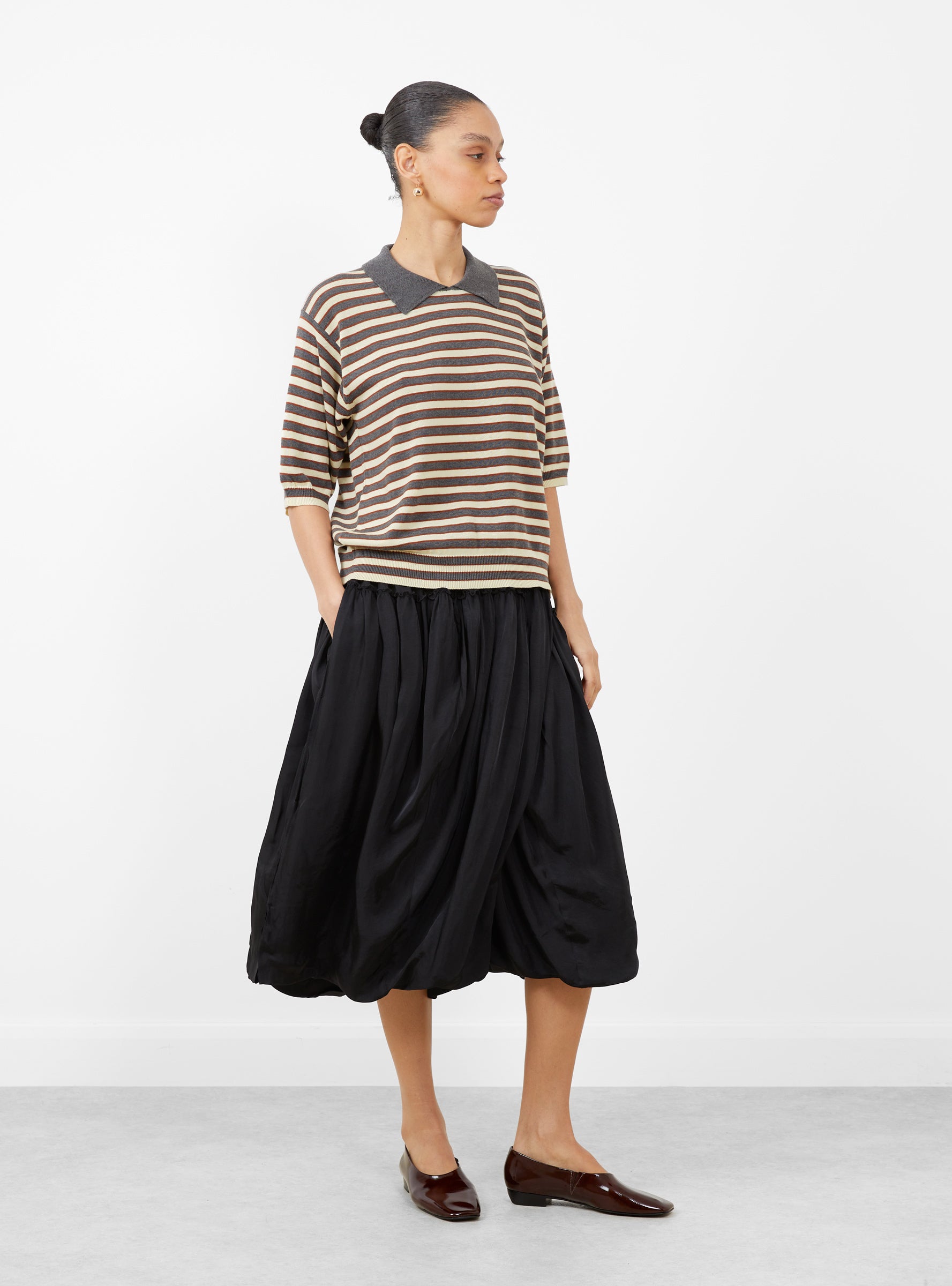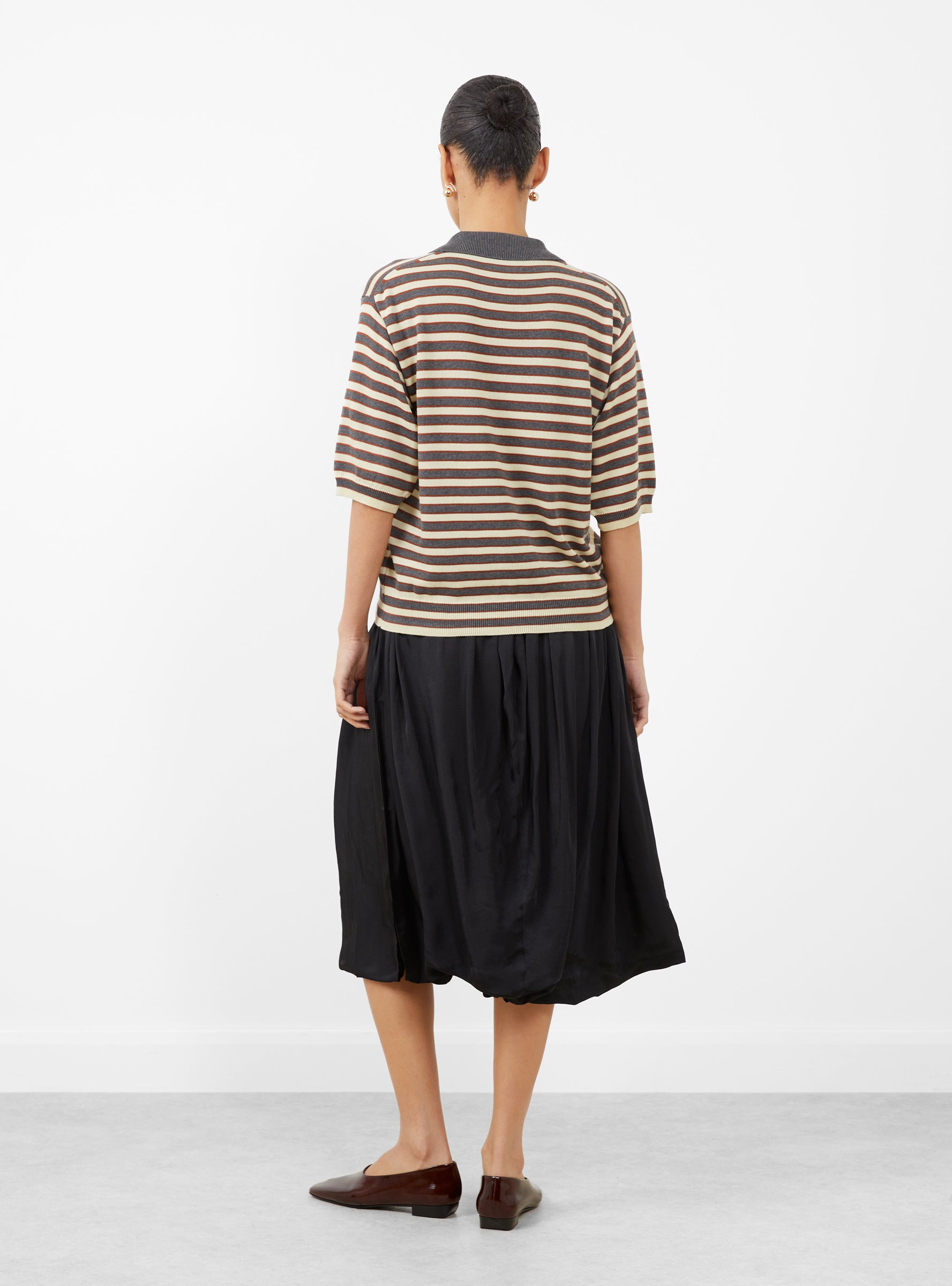 The Oversized Cotton Striped Polo from Cordera comes in a mix of grey, terracotta, and vanilla stripes and is made in Spain from lightweight organic cotton. It has a regular fit with an open polo collar designed without buttons for an easy, relaxed look. The soft handle and breathable weight make it ideal for everyday wear, while ribbed cuffs and a ribbed hem add gentle structure to the silhouette.