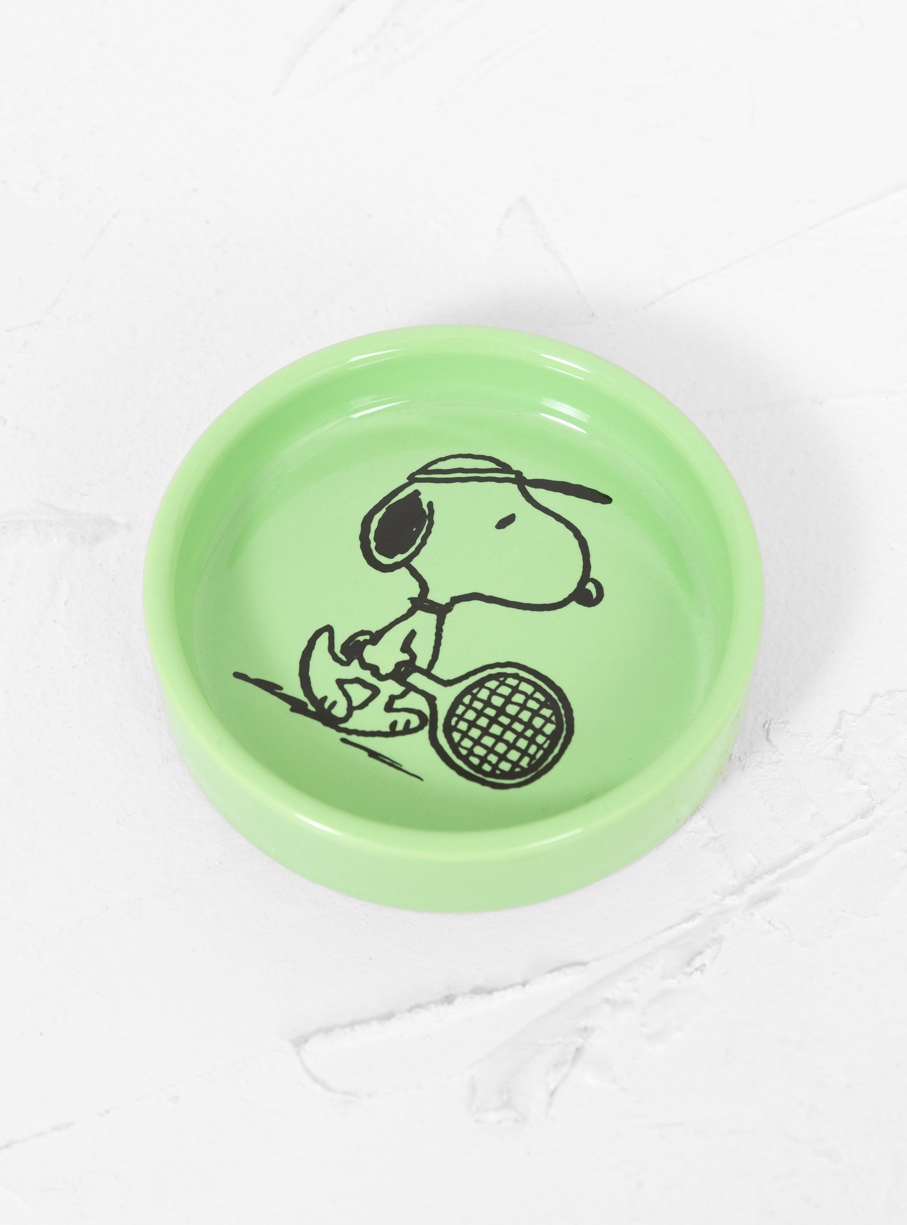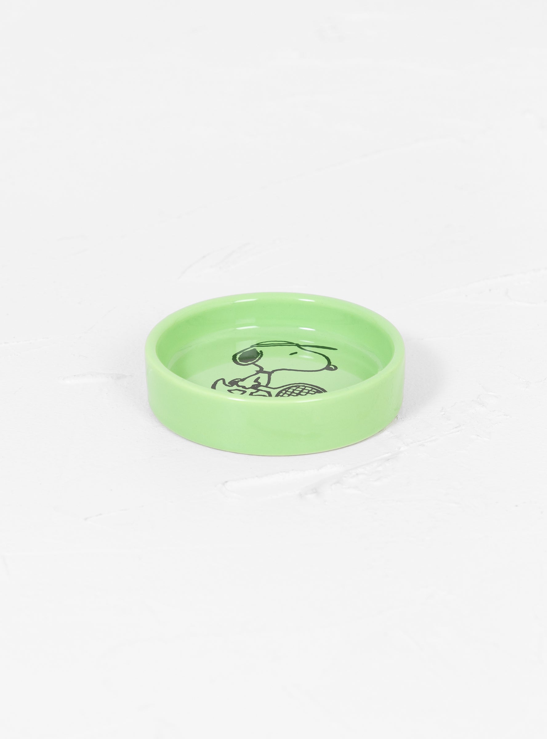The Pin Dish from Magpie arrives in a green. The small, round shaped tray is made from a vegan ceramic and decorated with a black decal of a tennis-ready Snoopy.