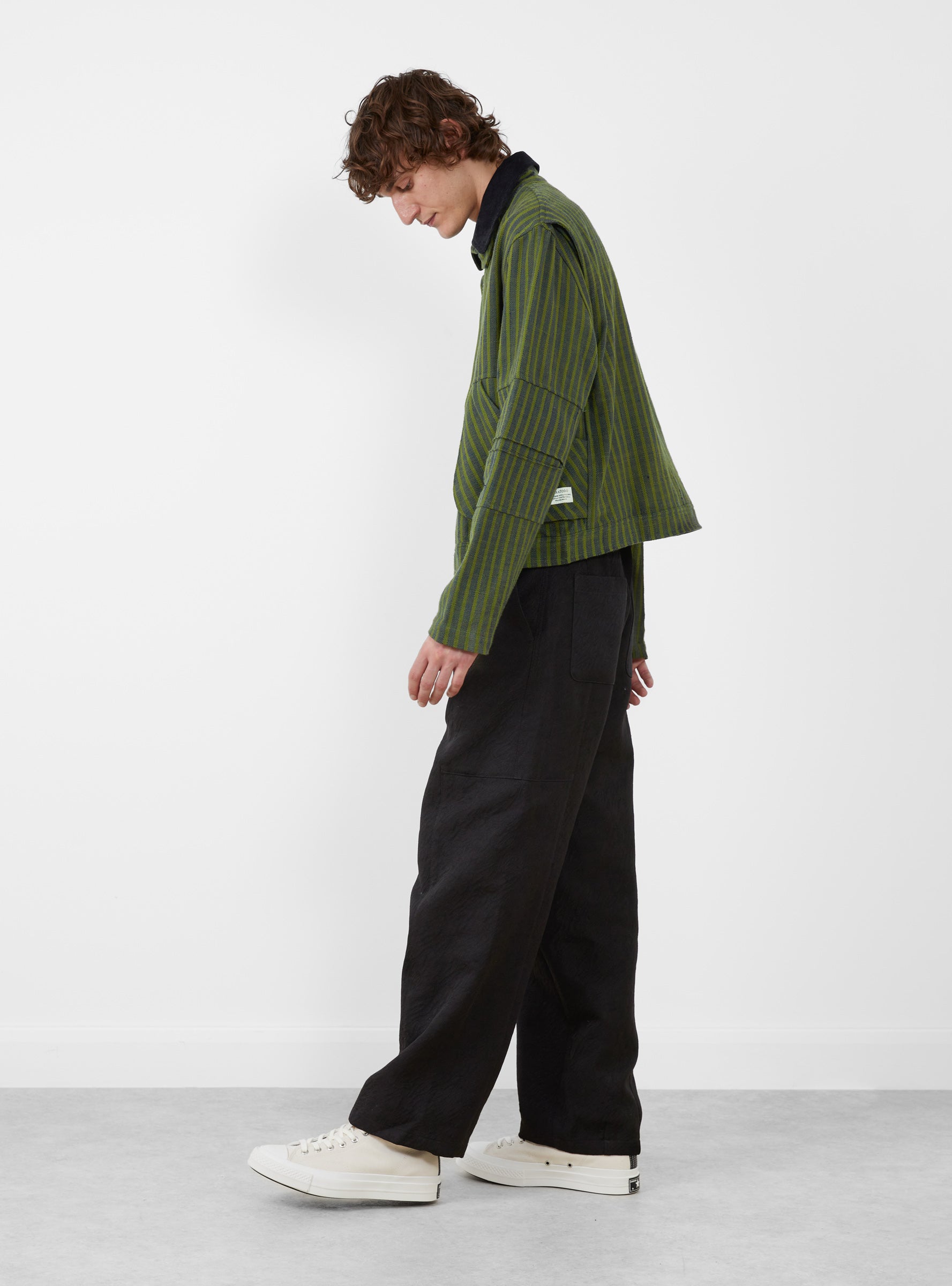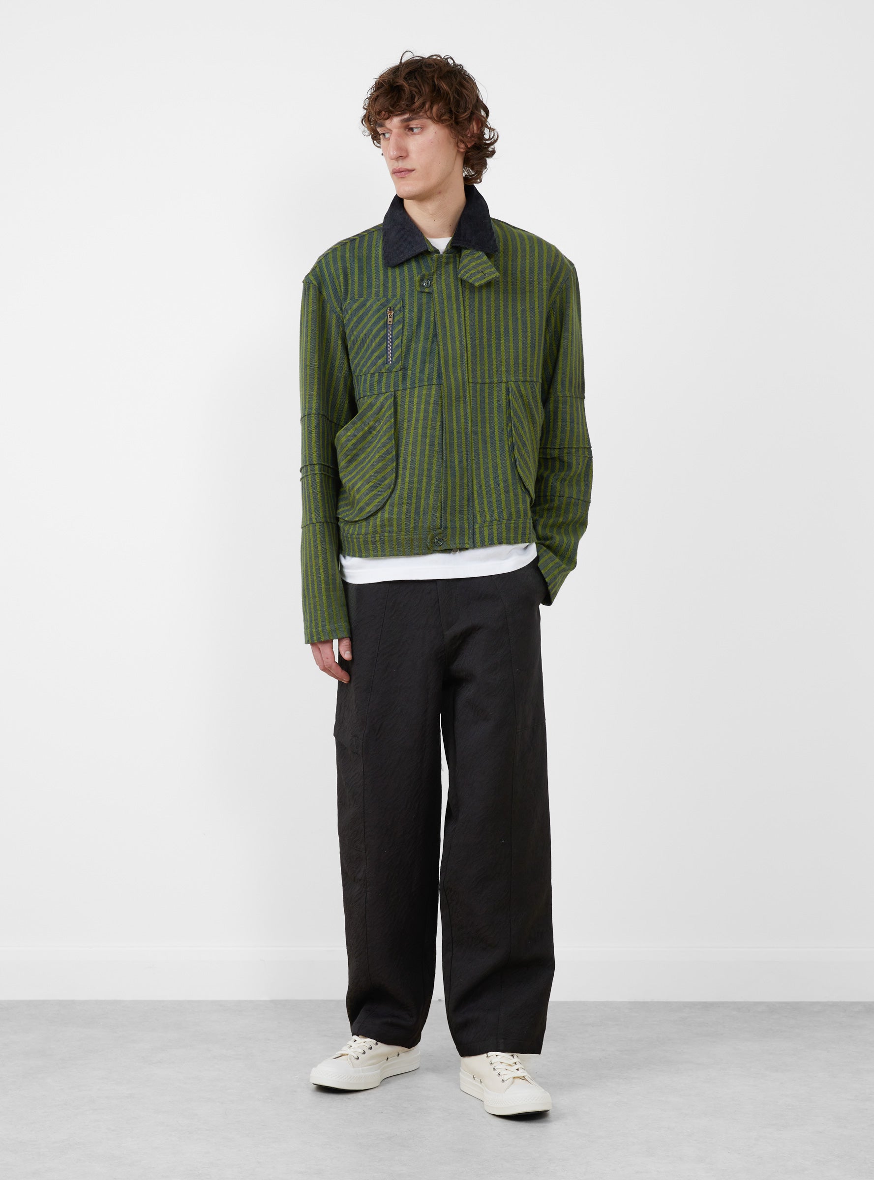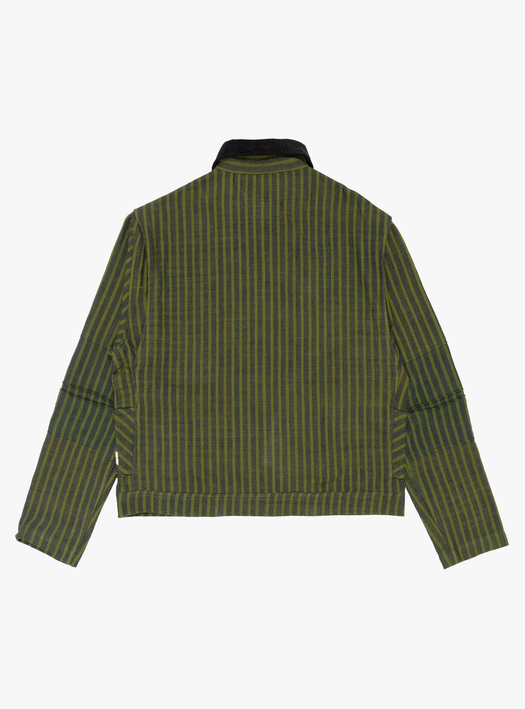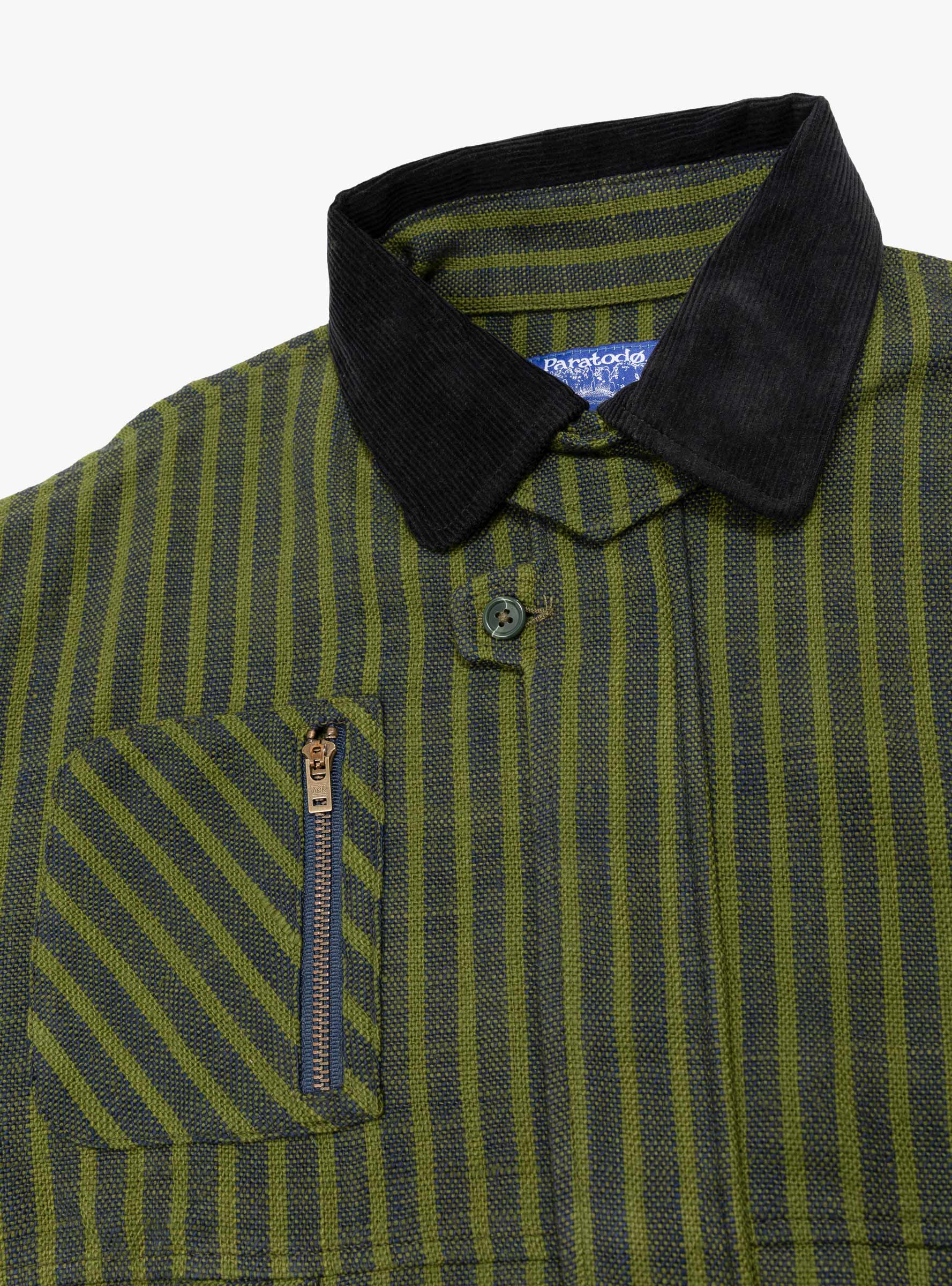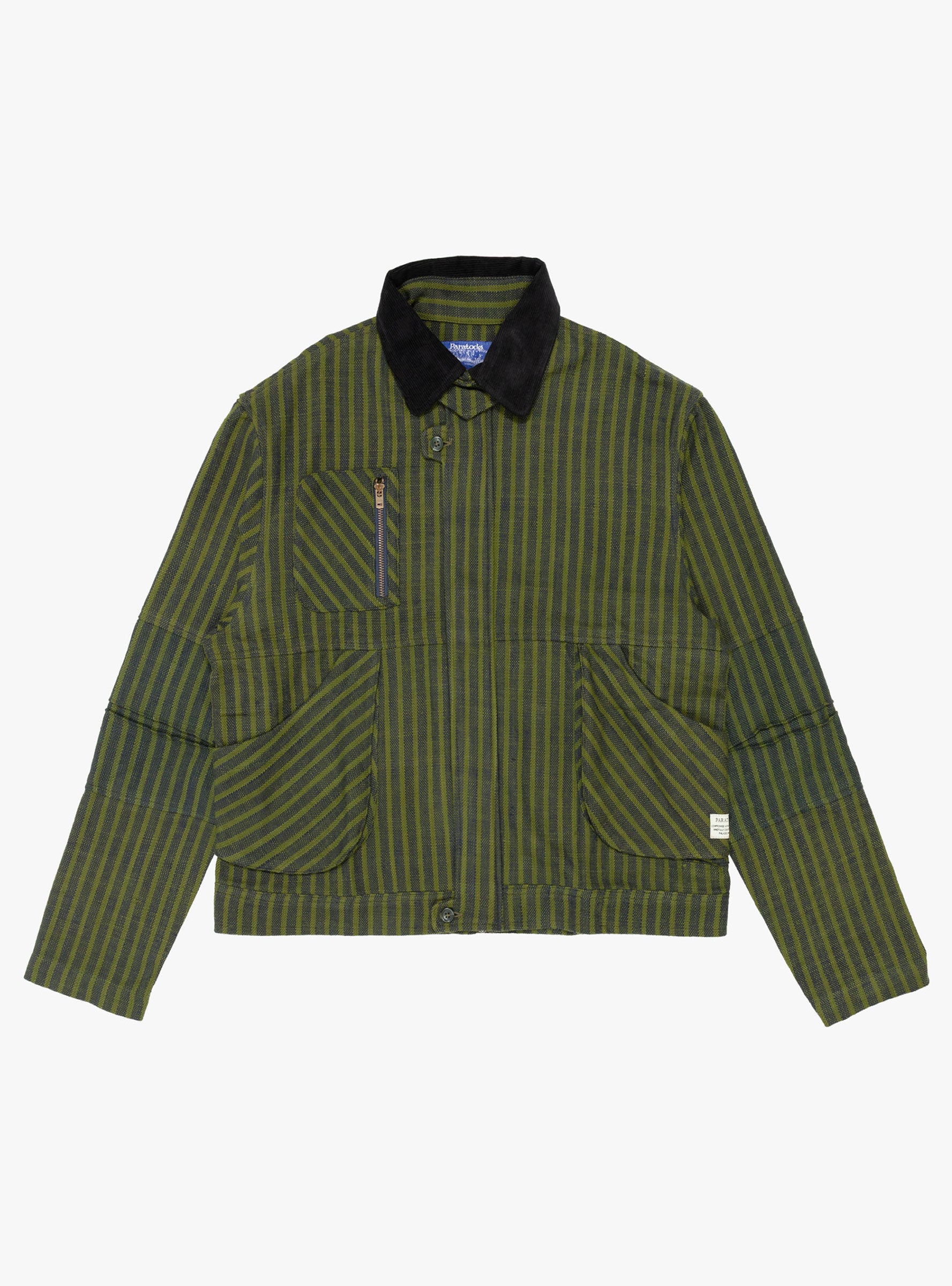 The Pine Blouson Jacket from Paratodo is made from cotton Khadi fabric in a navy stripe finish. Designed with function and mobility in mind, it features a concealed front zip closure and collar strap, alongside two hand pockets and a zipped chest pocket referencing classic workwear styling. Pleated elbows add ease of movement through the sleeves, while the textured Khadi cotton lends structure and durability for everyday wear.