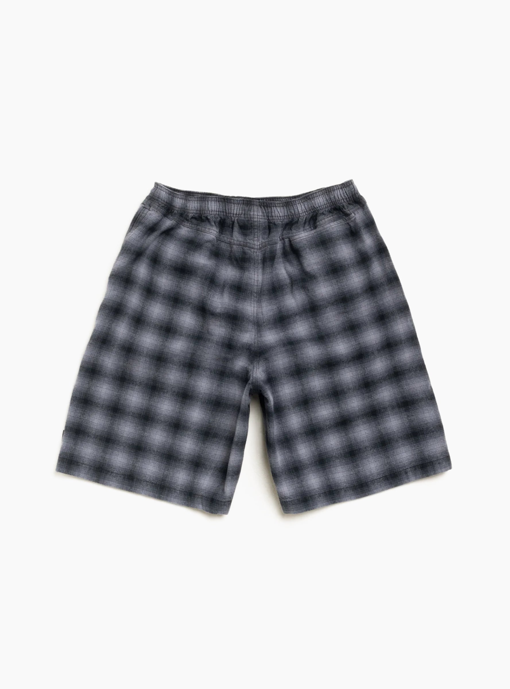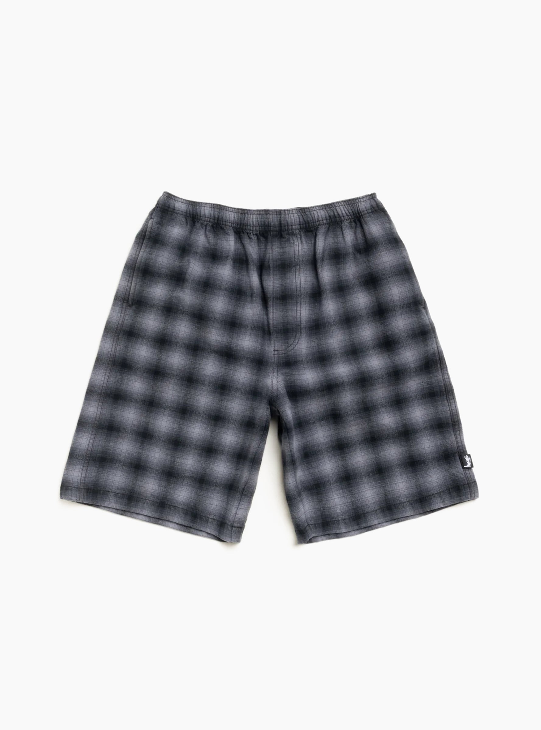 The Plaid Beach Short from Stüssy comes in Black and is made from heavyweight yarn-dyed cotton flannel. These baggy-fit shorts feature an elastic waistband with internal drawcord, faux fly, side seam pockets, a back yoke, on-seam rear pocket, and the Stüssy big stock flag label at the side seam.