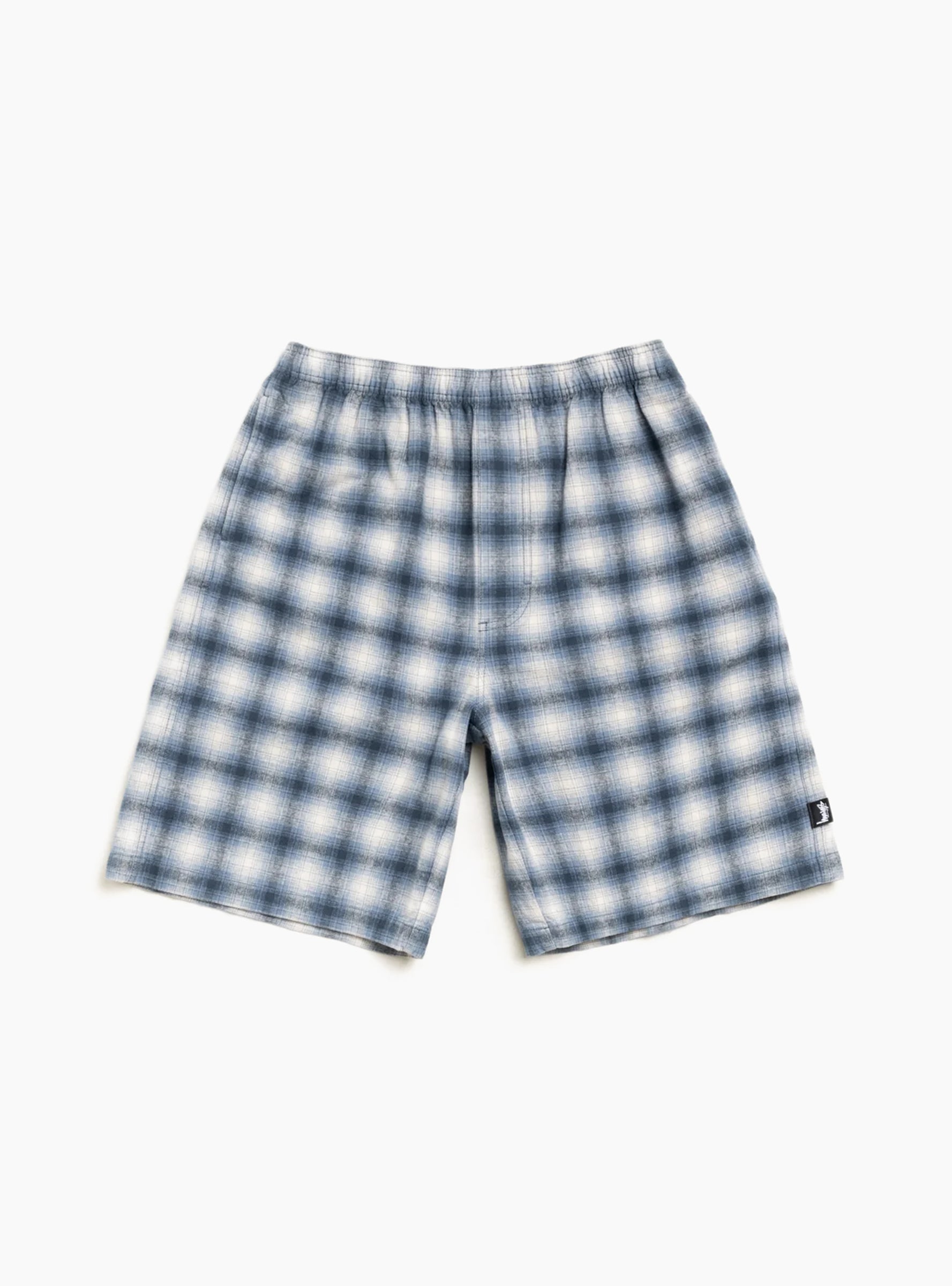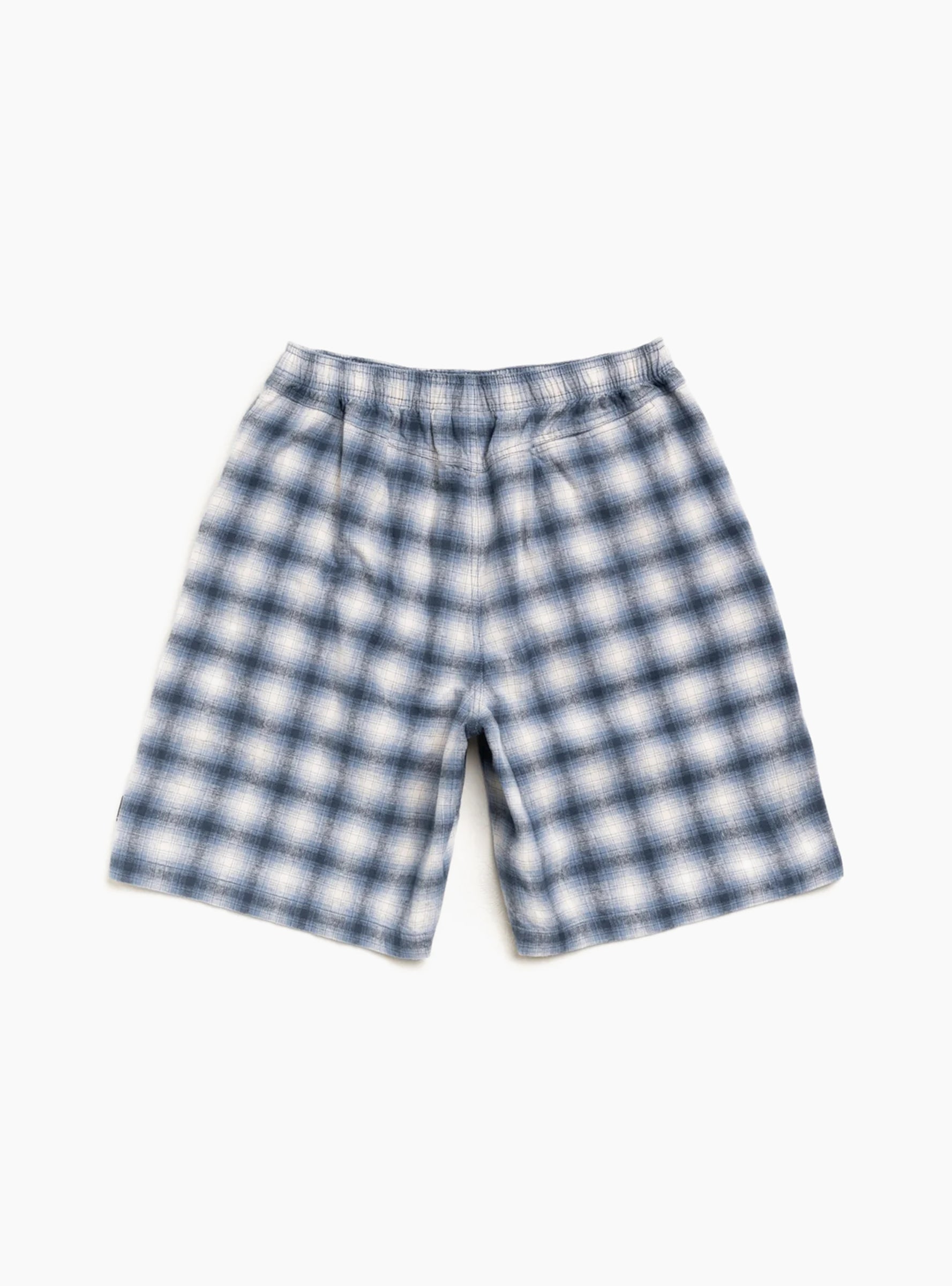The Plaid Beach Short from Stüssy comes in Blue and is made from heavyweight yarn-dyed cotton flannel. These baggy-fit shorts feature an elastic waistband with internal drawcord, faux fly, side seam pockets, a back yoke, on-seam rear pocket, and the Stüssy big stock flag label at the side seam.