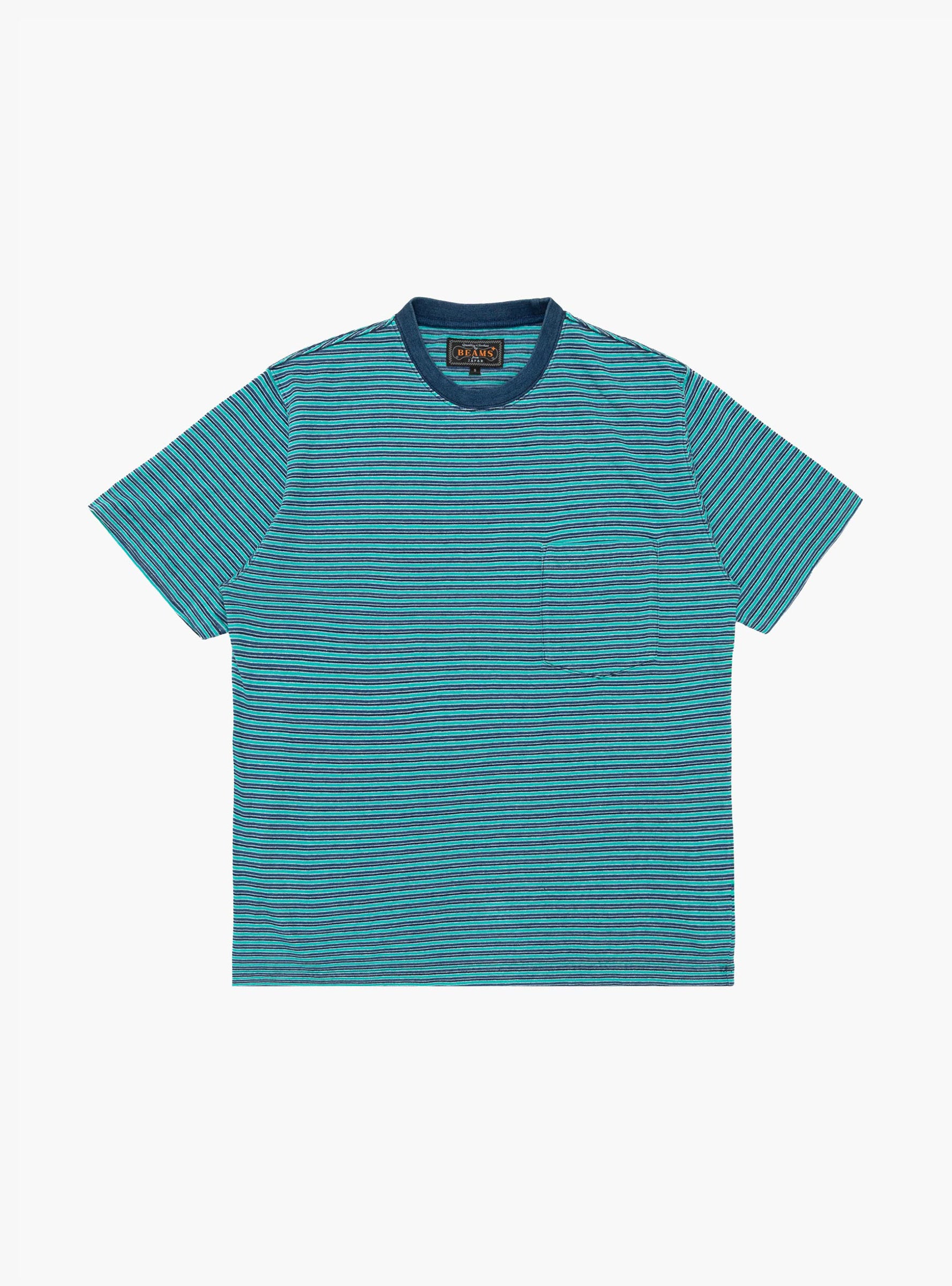 The Pocket Tee Green Indigo from Beams Plus is cut from 100% cotton with a stripe design. Finished with a crewneck collar and single chest patch pocket, it offers a clean everyday style.