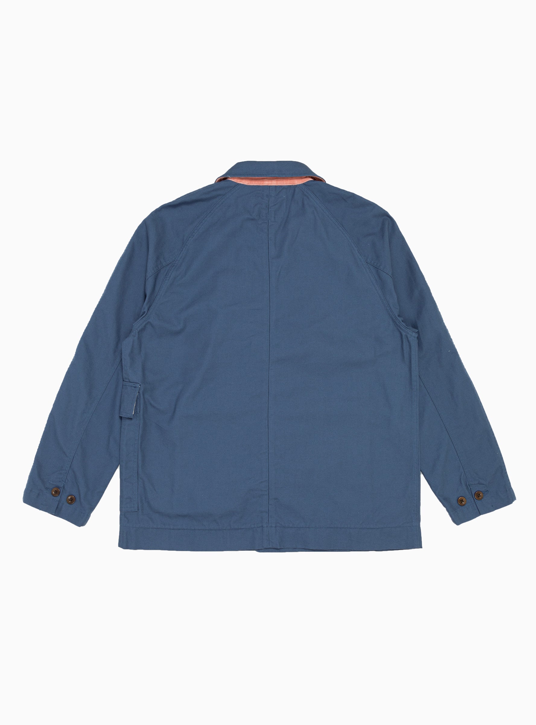 Inspired by vintage uniforms, this blue Postal jacket from Garbstore’s SS23 collection is informed by cleverly constructed sleeves, presenting set-in at the front and raglan at the back. Made from Japanese cotton canvas, it’s cut to a boxy silhouette with large patch pockets and a concealed corozo nut button fastening.