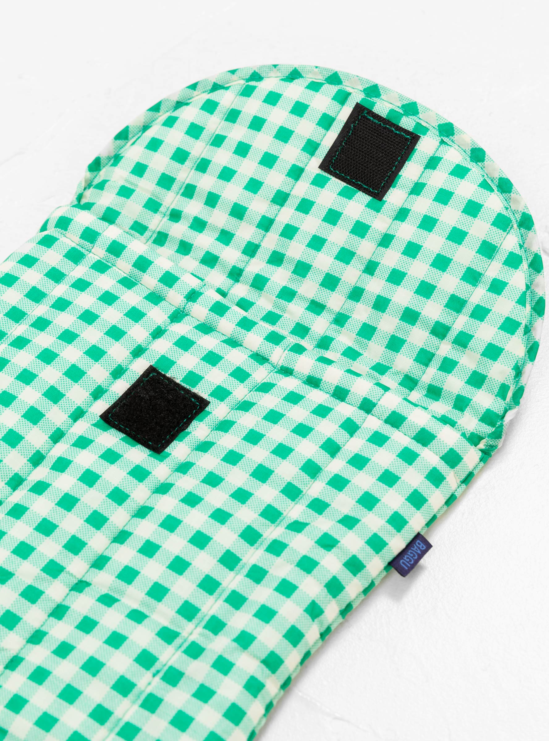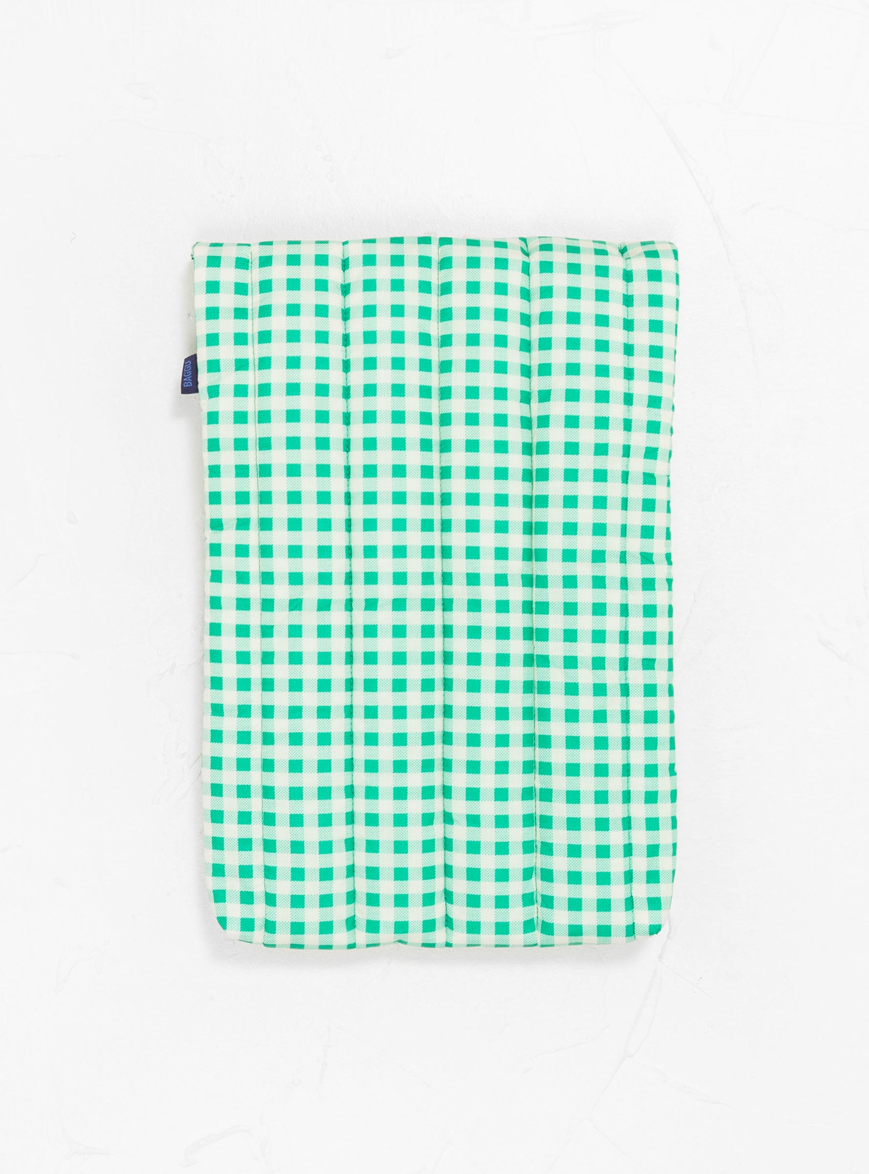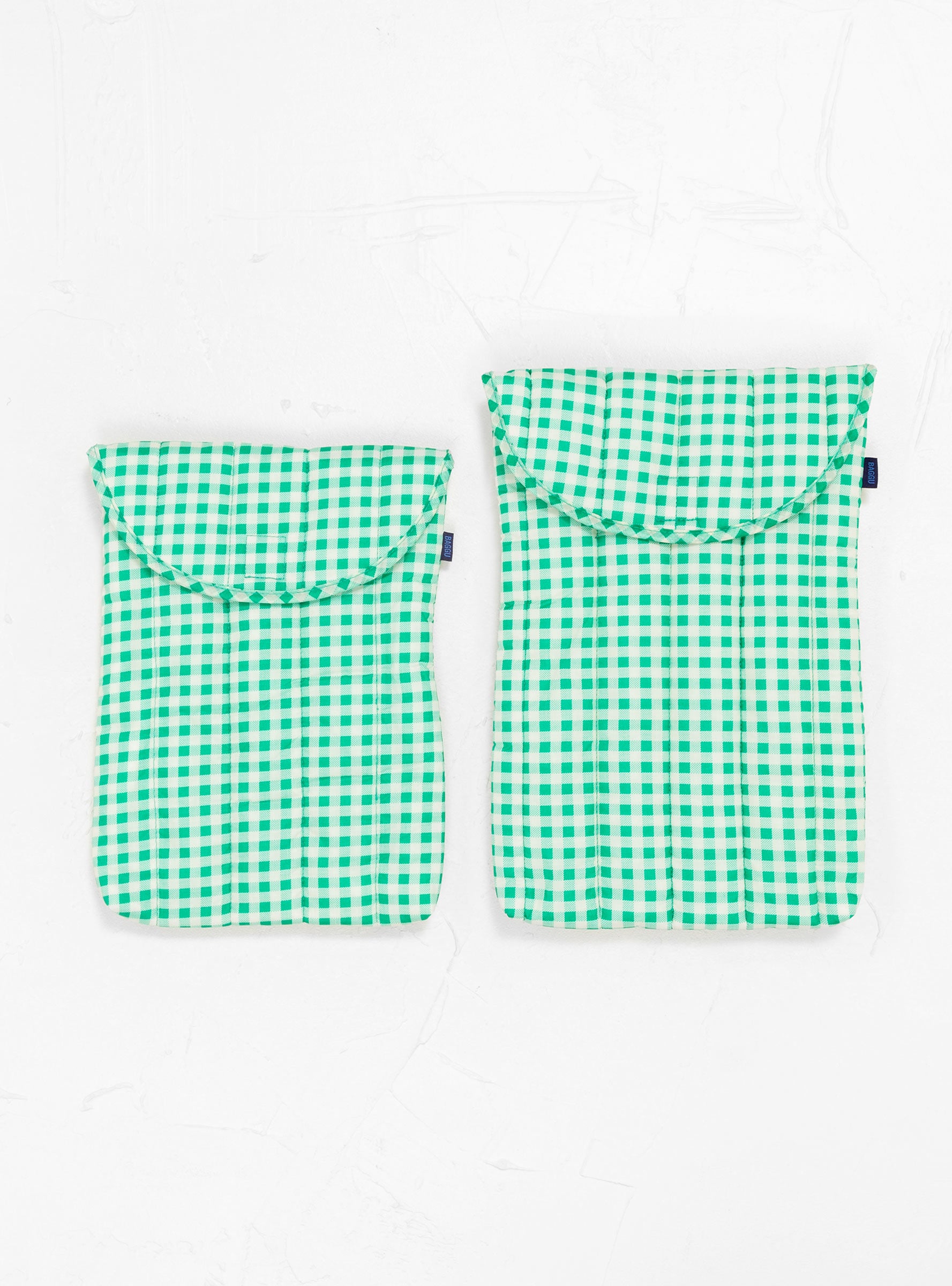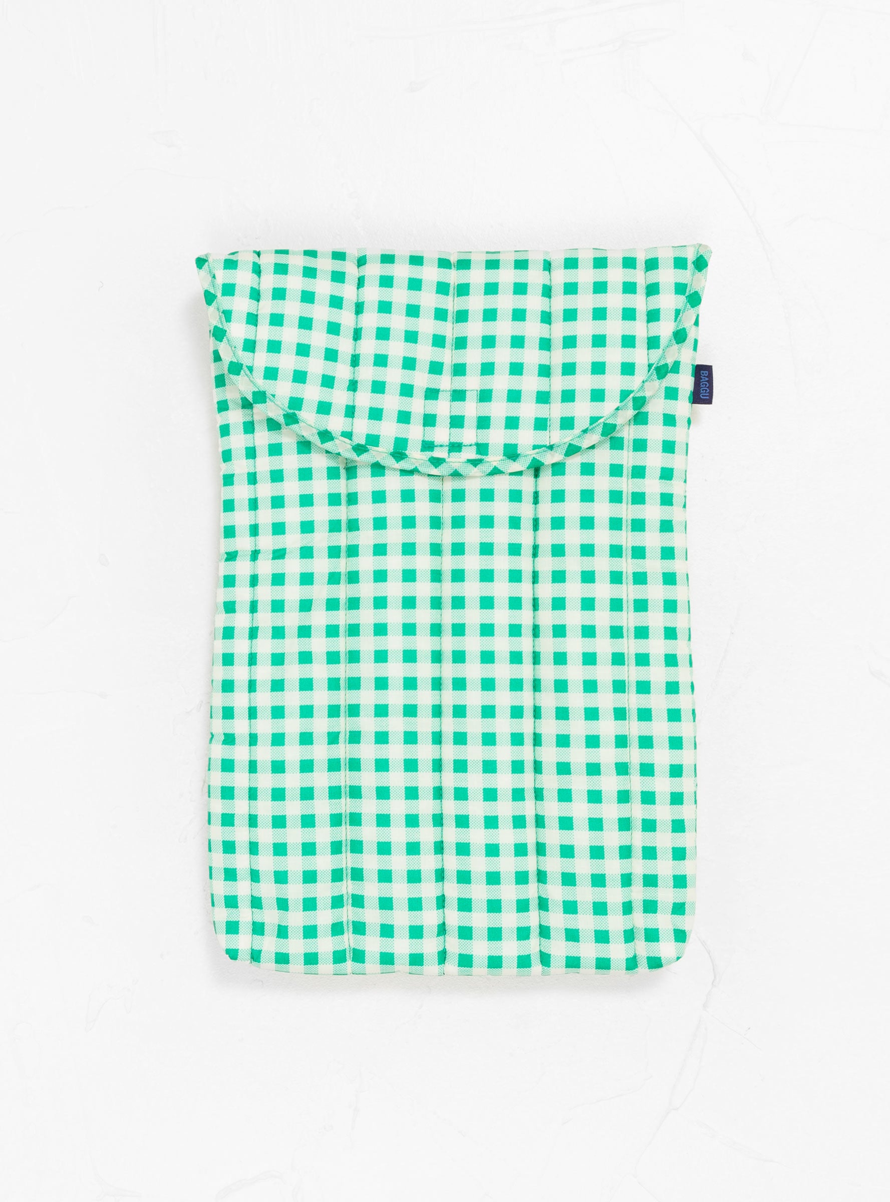 The 16" Puffy Laptop Sleeve from Baggu comes in a green gingham. Crafted from a lightly padded recycled nylon ripstop, keep your laptop safe and look good while you do it. The sleeve is finished with a velcro closure to make sure your laptop stays in place.