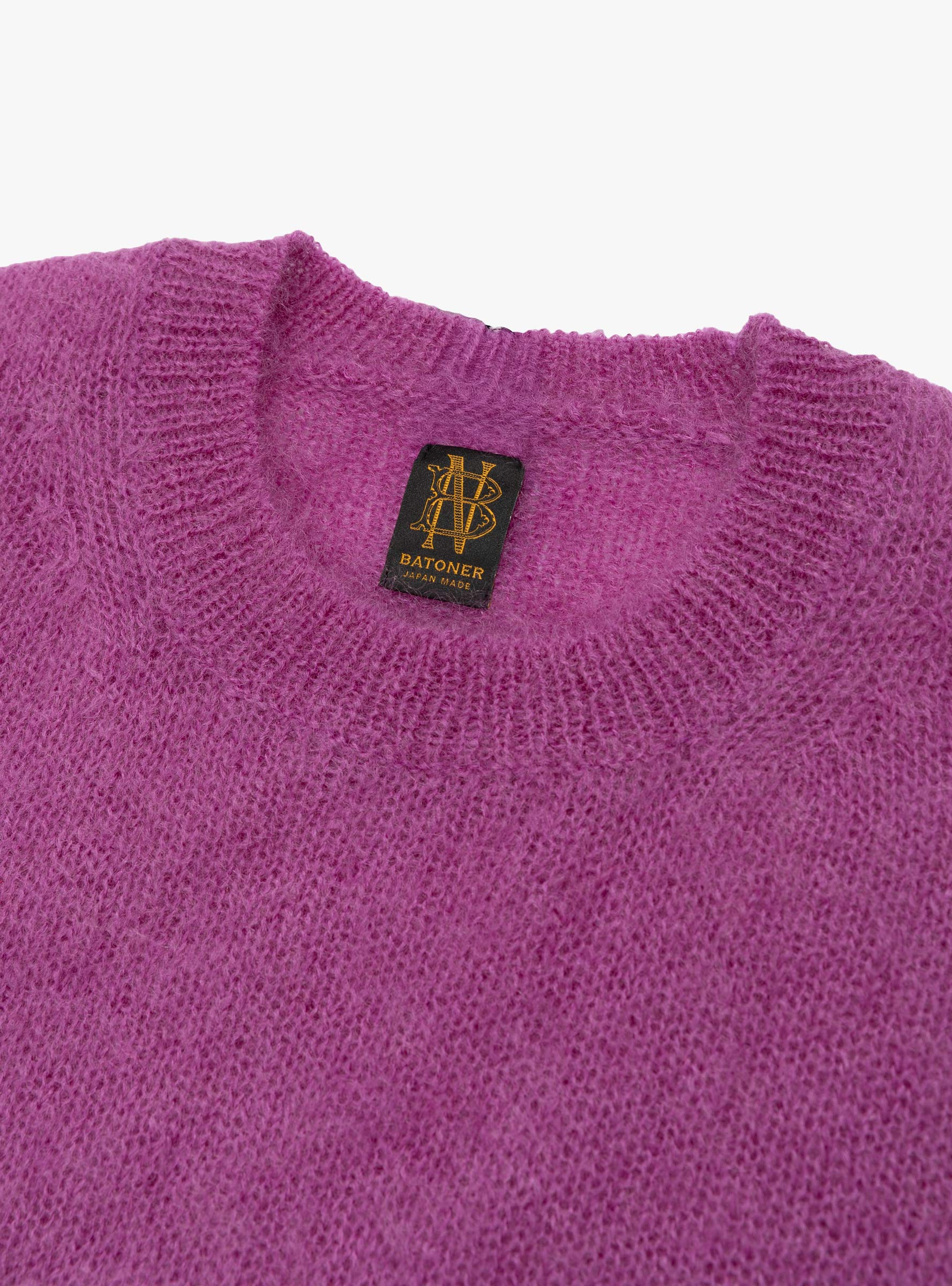 The Pure Mohair Crew Neck in Purple from BATONER is crafted in Japan from 100% mohair. Featuring a ribbed finish, the knit offers a soft texture and lightweight warmth, making it an ideal layer for cooler months.