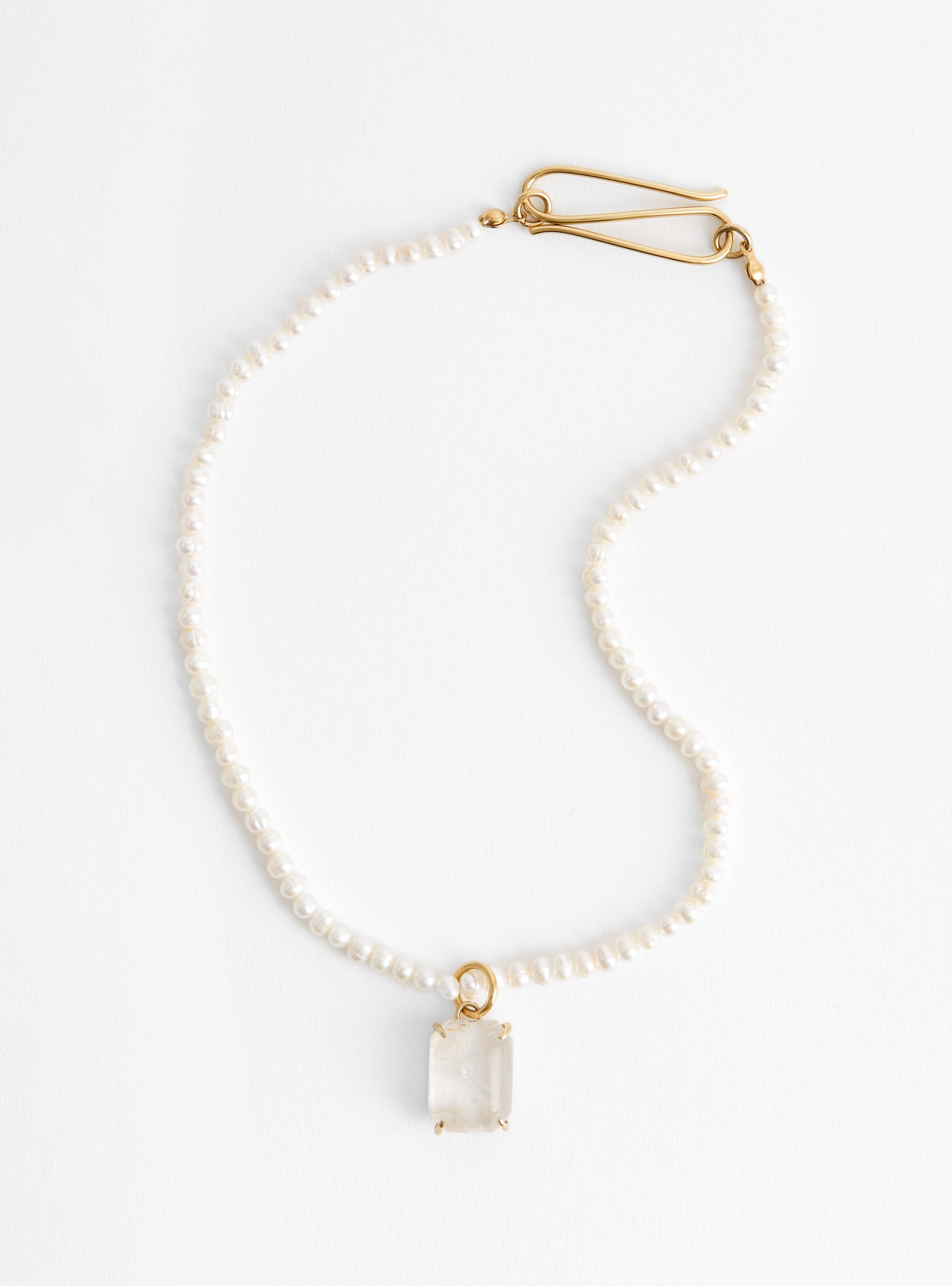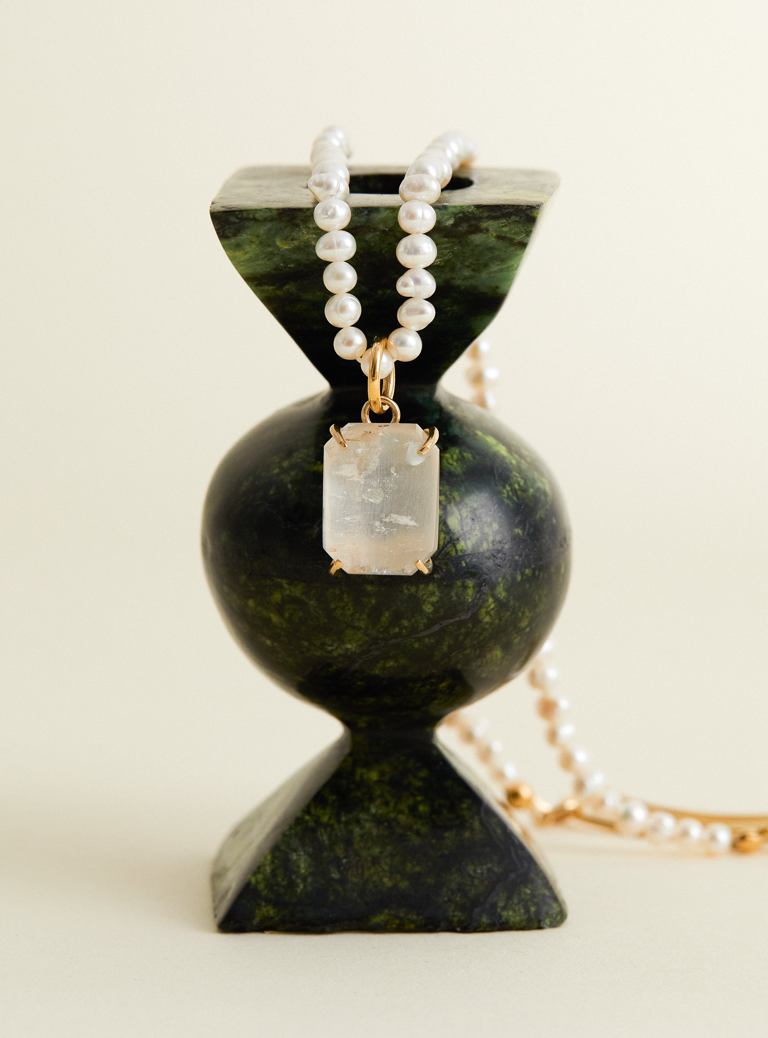 This necklace from BEATRIZ PALACIOS is handmade in Spain from gold-plated silver, threaded with freshwater pearls and embellished with a square-cut quartz pendant.