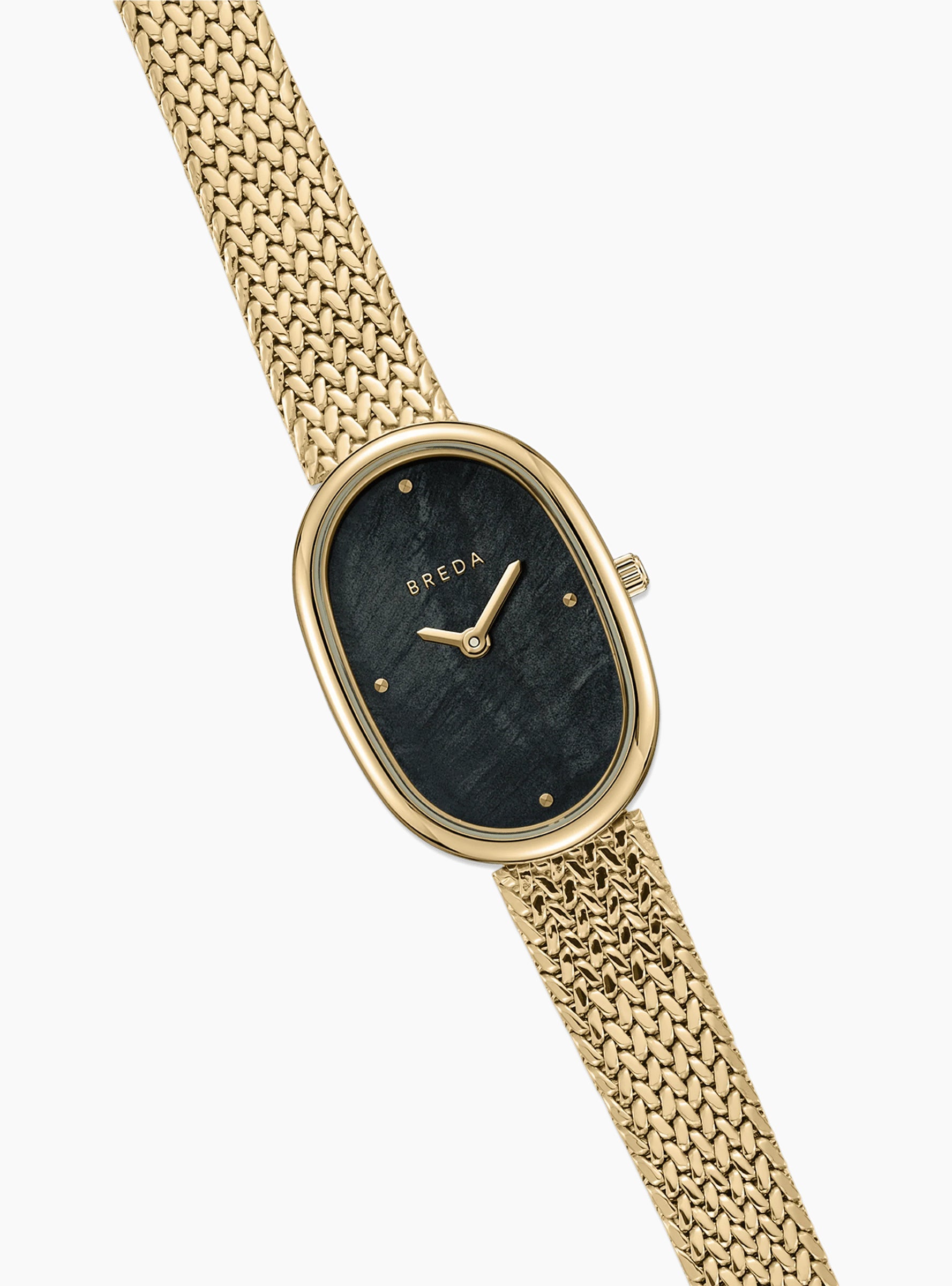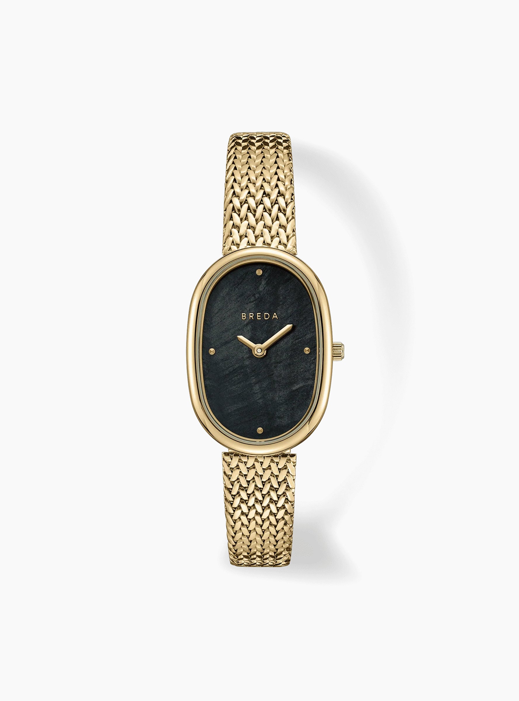 Made with an 18kt gold-plated case and a tapered woven mesh bracelet, which fastens with a quick release clasp, this Jane tethered watch from BREDA features an elegant black watch face and Japanese-made Miyota Quartz movement.