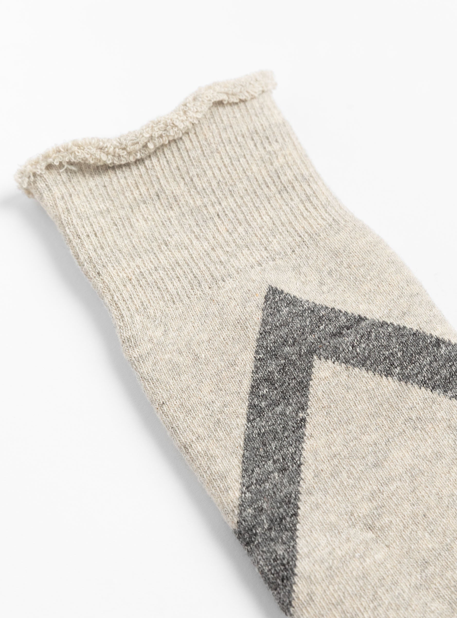 The Raffy Sweat Socks Grey from ROTOTO are crafted in Japan from Raffy yarn, a textured blend of long-staple and recycled cotton. The soft pile knit features a zigzag pattern inspired by vintage USAFA sweatpants.
