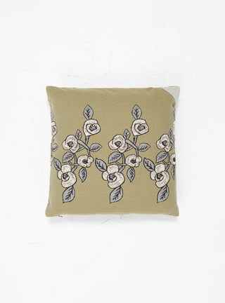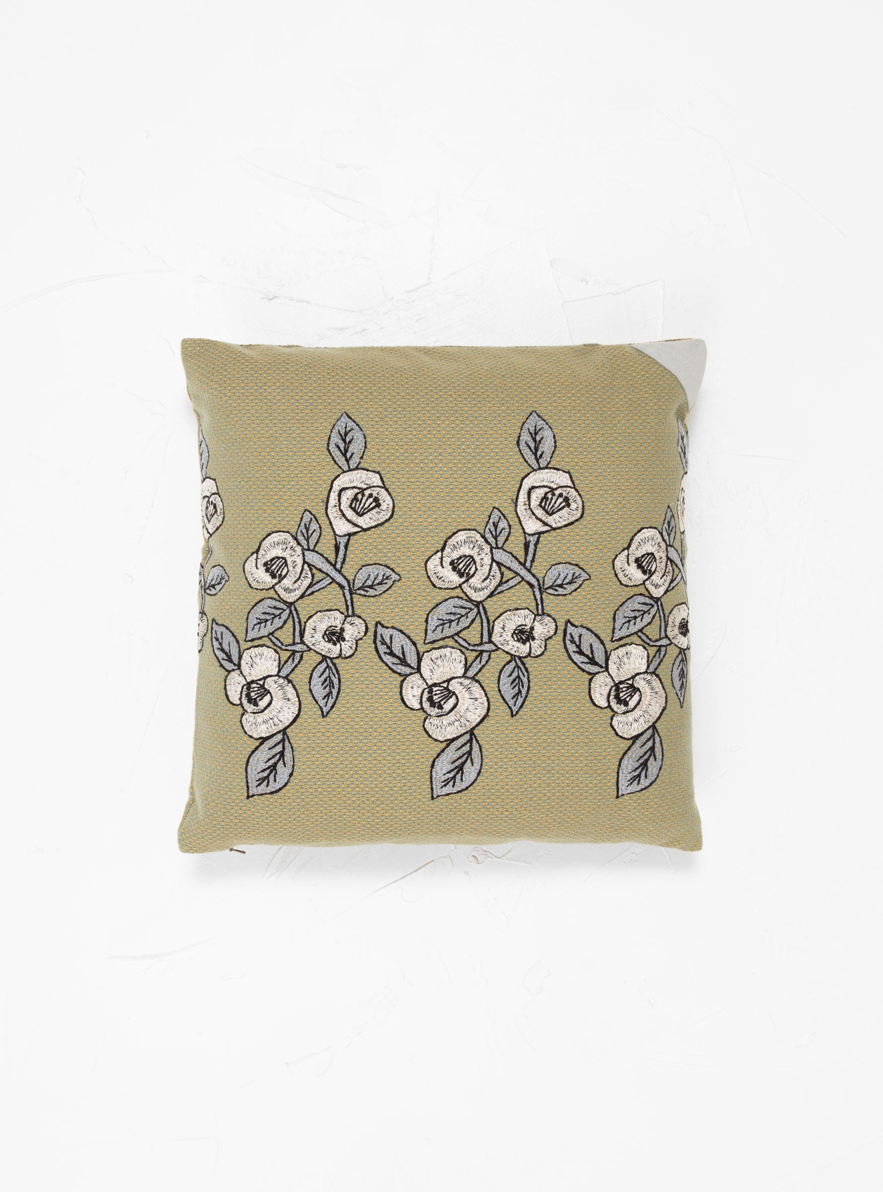 As a brand which embodies Japanese craftsmanship, this khaki cushion by Minä Perhonen has been embroidered by skilled artisans in Japan. It's filled with a combination of recycled down and feathers, with a grey suede panel with the Minä Perhonen logo in one corner.