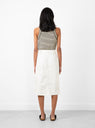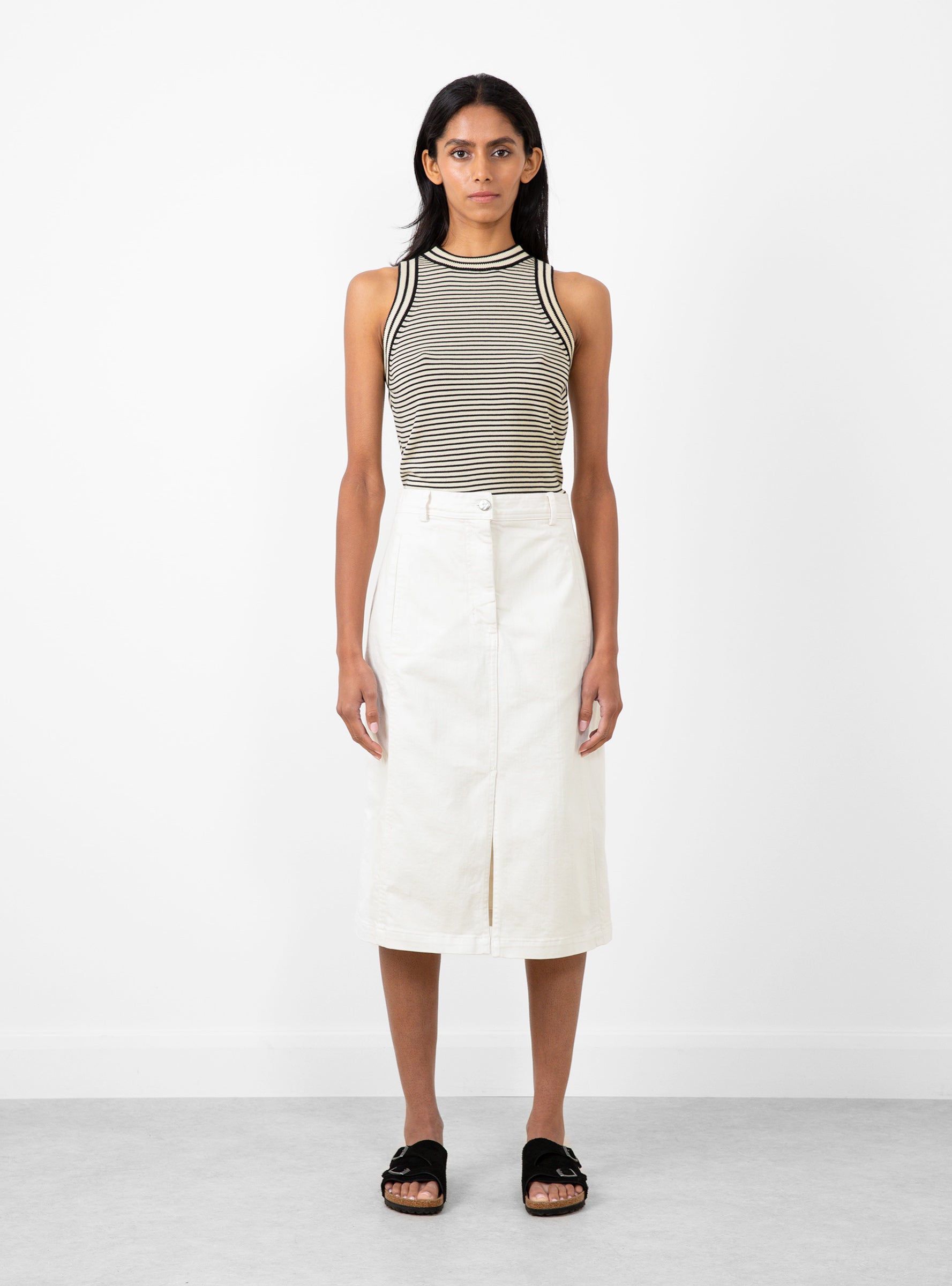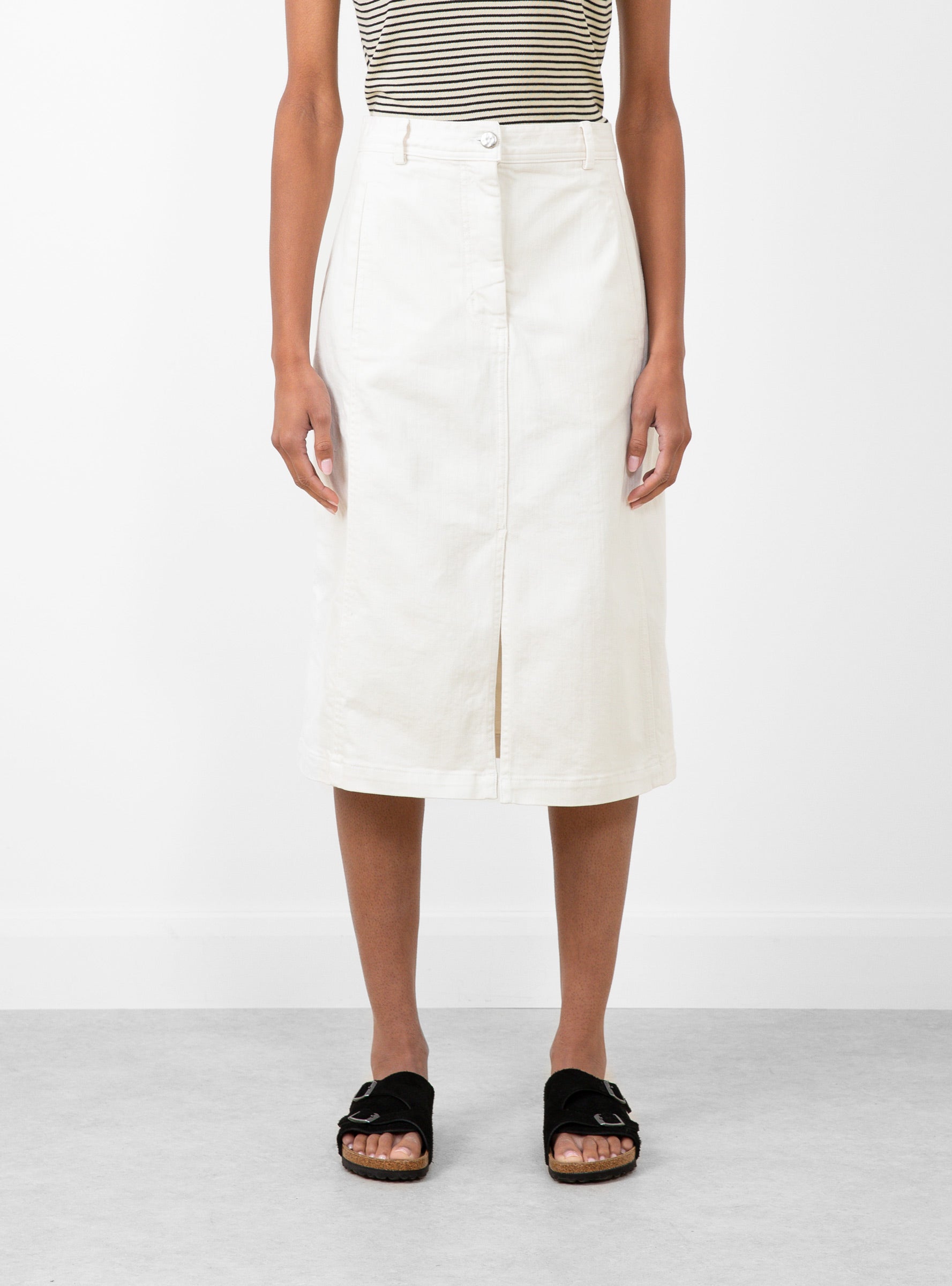Rachel Comey's Raya Skirt gets an upgrade in a white colourway. Made in the USA from a dirty white Pomona Denim, the midi skirt takes a pencil shape and maintains many classic denim details, such as the belt loop and button closure, with added contemporary flair in its geometric panel construction and central slit.